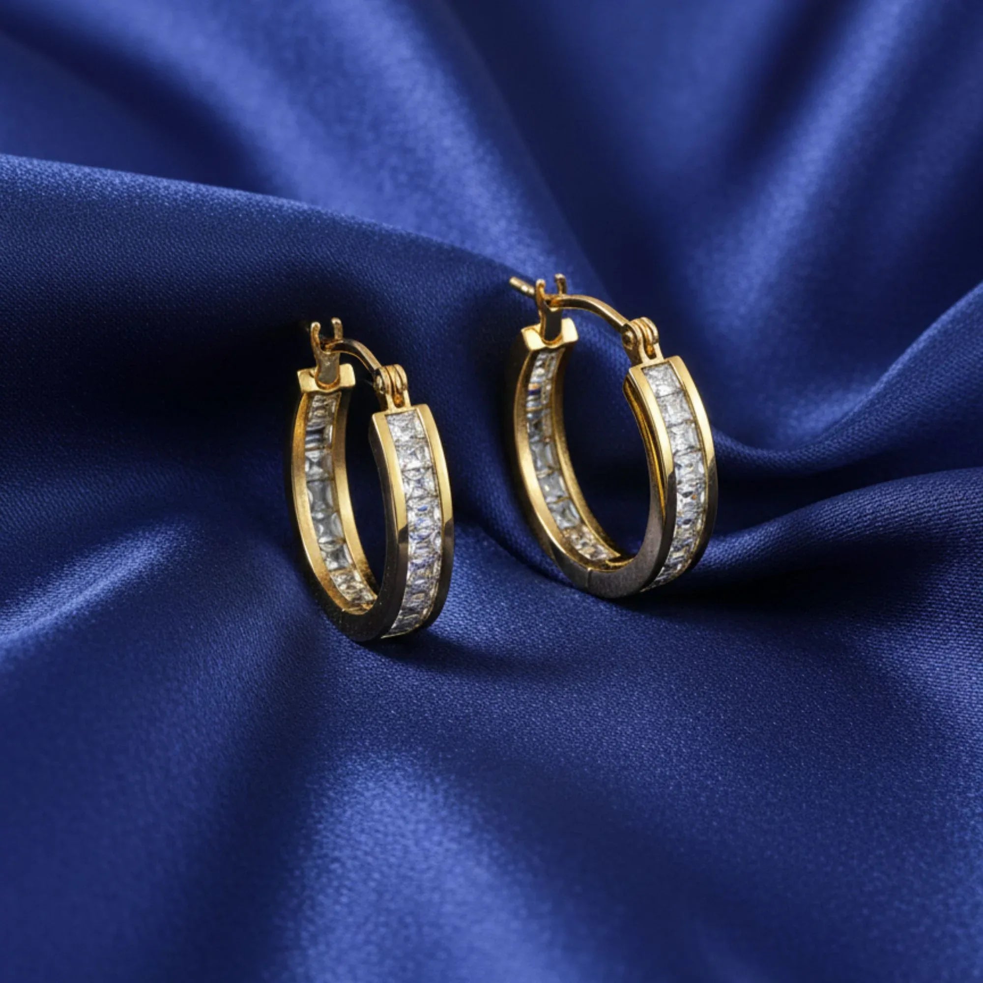18K gold plated stainless steel hoop earrings featuring channel-set baguette white zircon stones; sophisticated statement jewellery.