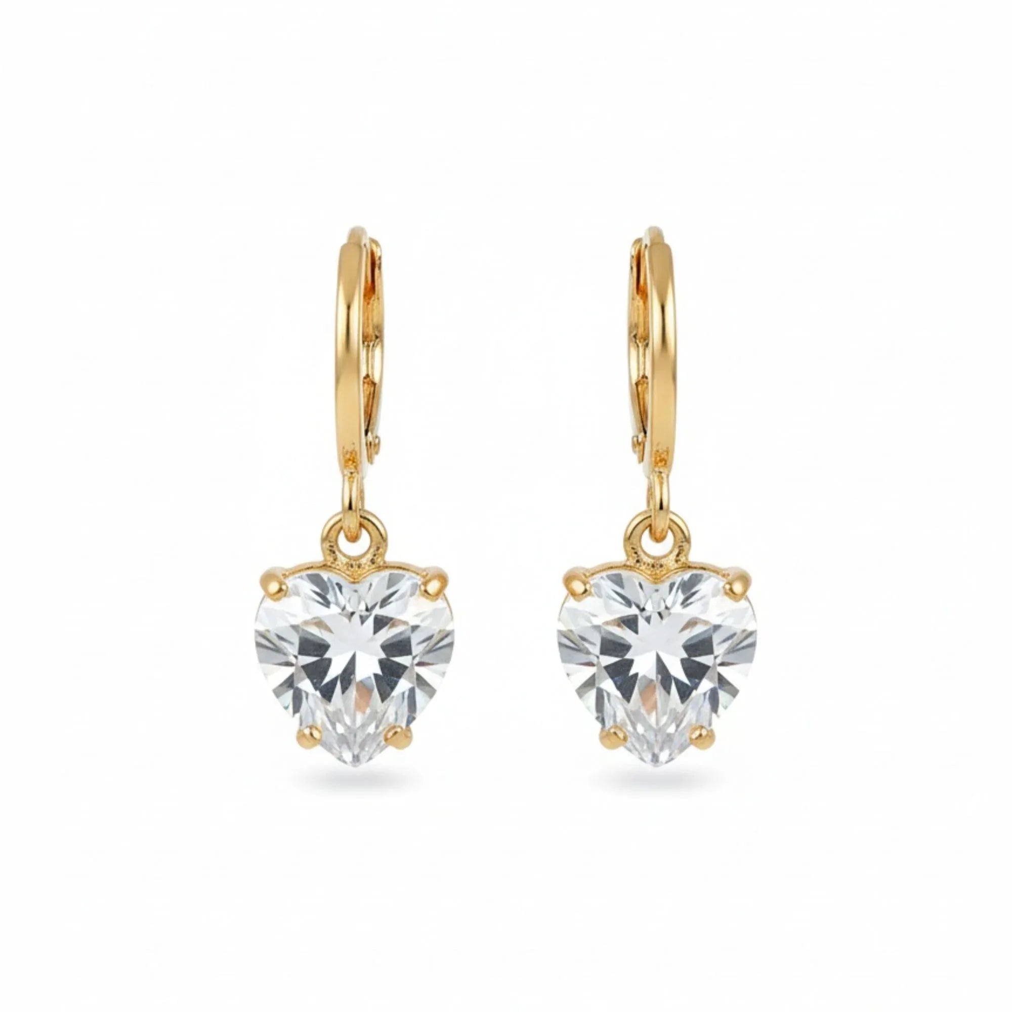 18K Gold Plated classic drop earrings crafted in premium stainless steel featuring a brilliant heart-cut zircon secured in a refined prong setting suspended from sleek gold hoops. Elegant romantic and versatile design ideal for daily wear date nights and gifting.