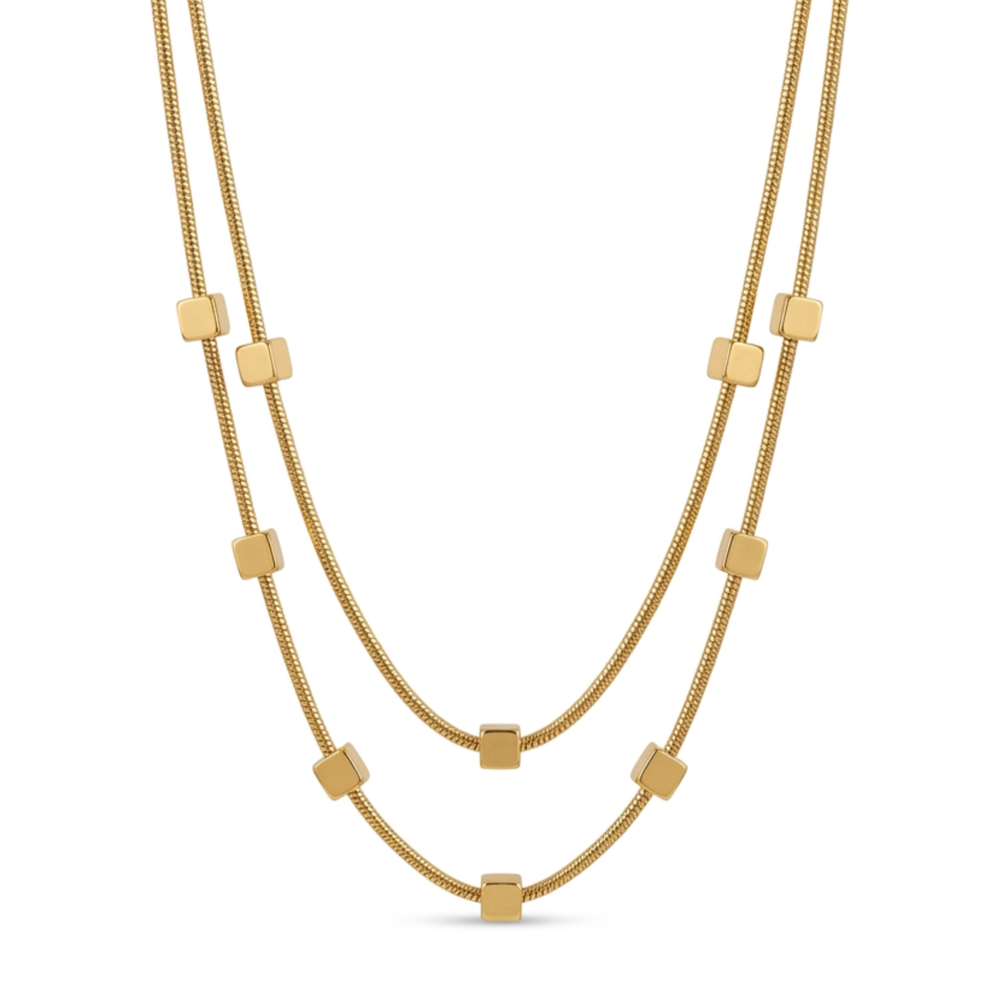 Two smooth snake chains adorned with glossy cube stations — this double-layered necklace delivers effortless editor-approved style. Crafted in 18K gold plated anti-tarnish stainless steel, it is waterproof, sweat-proof and lightweight. The layered silhouette adds dimension to any neckline without the effort of styling two separate pieces.