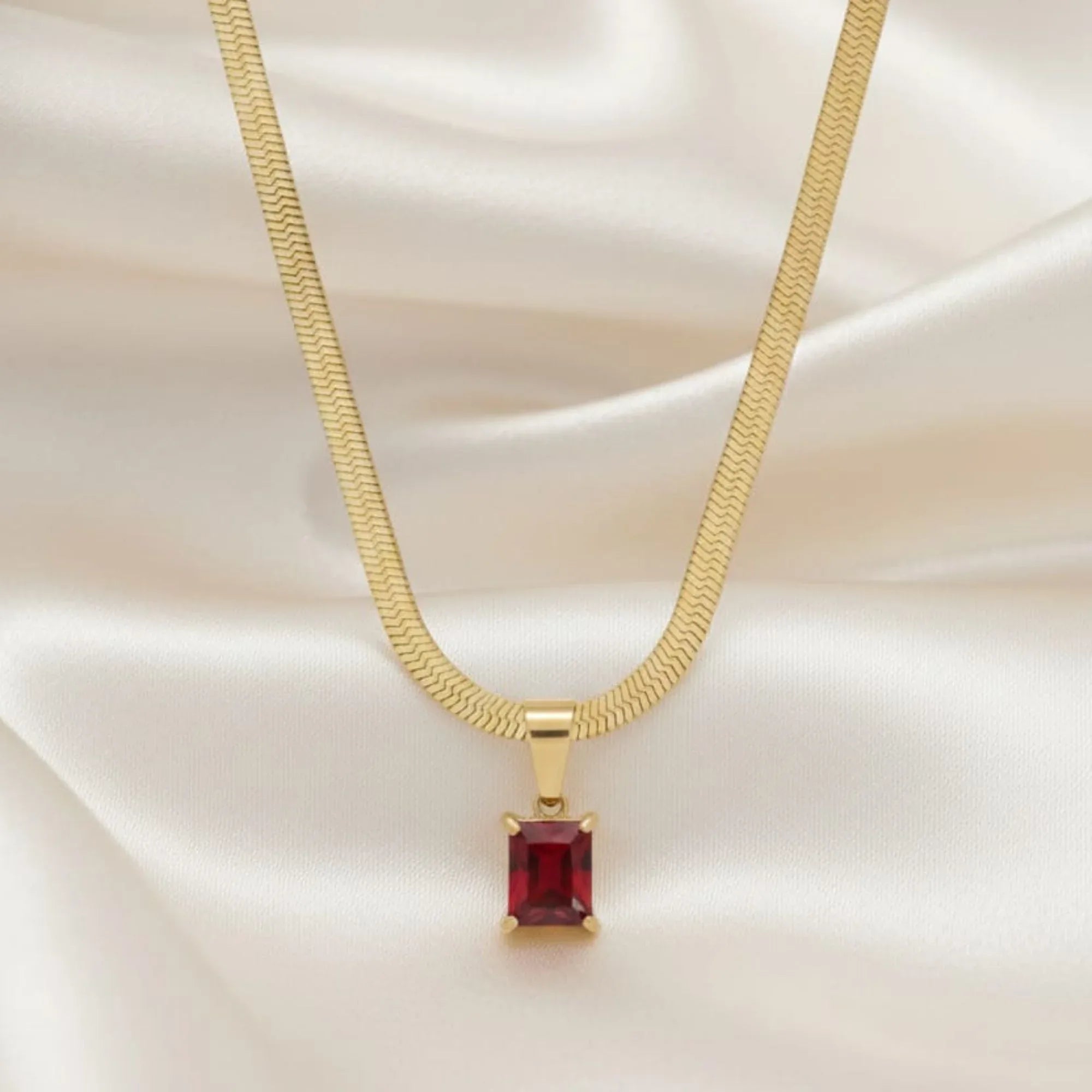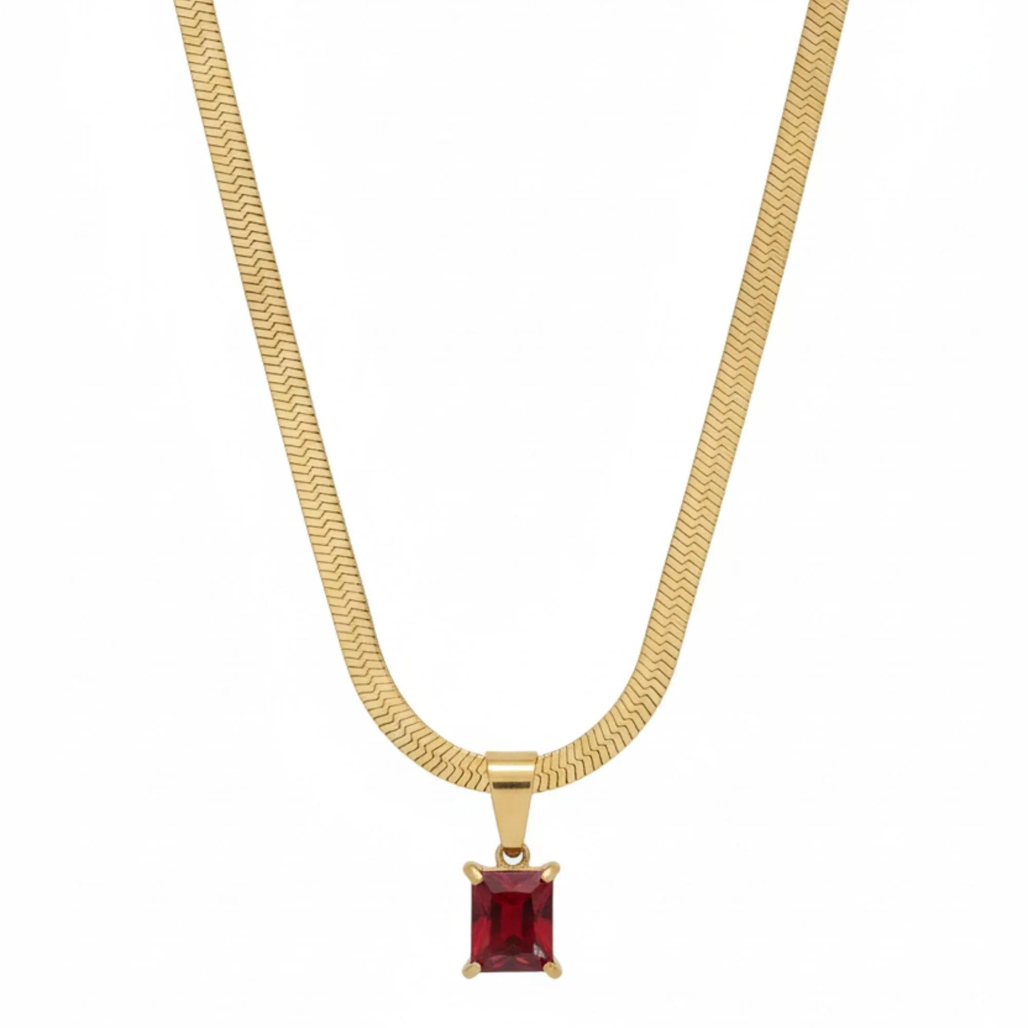 18K gold plated stainless steel necklace featuring an emerald-cut red zircon solitaire pendant; elegant festive & party wear jewellery.