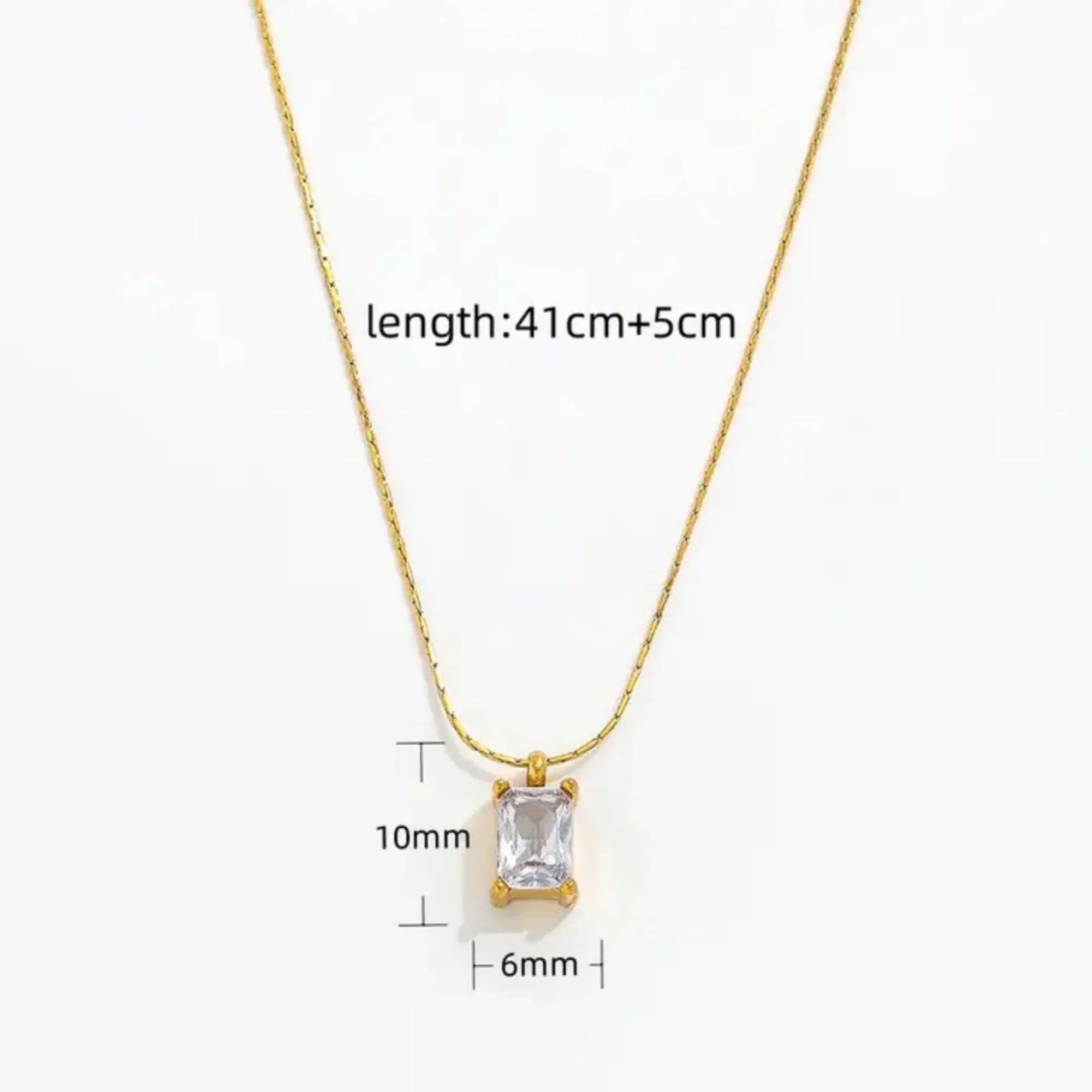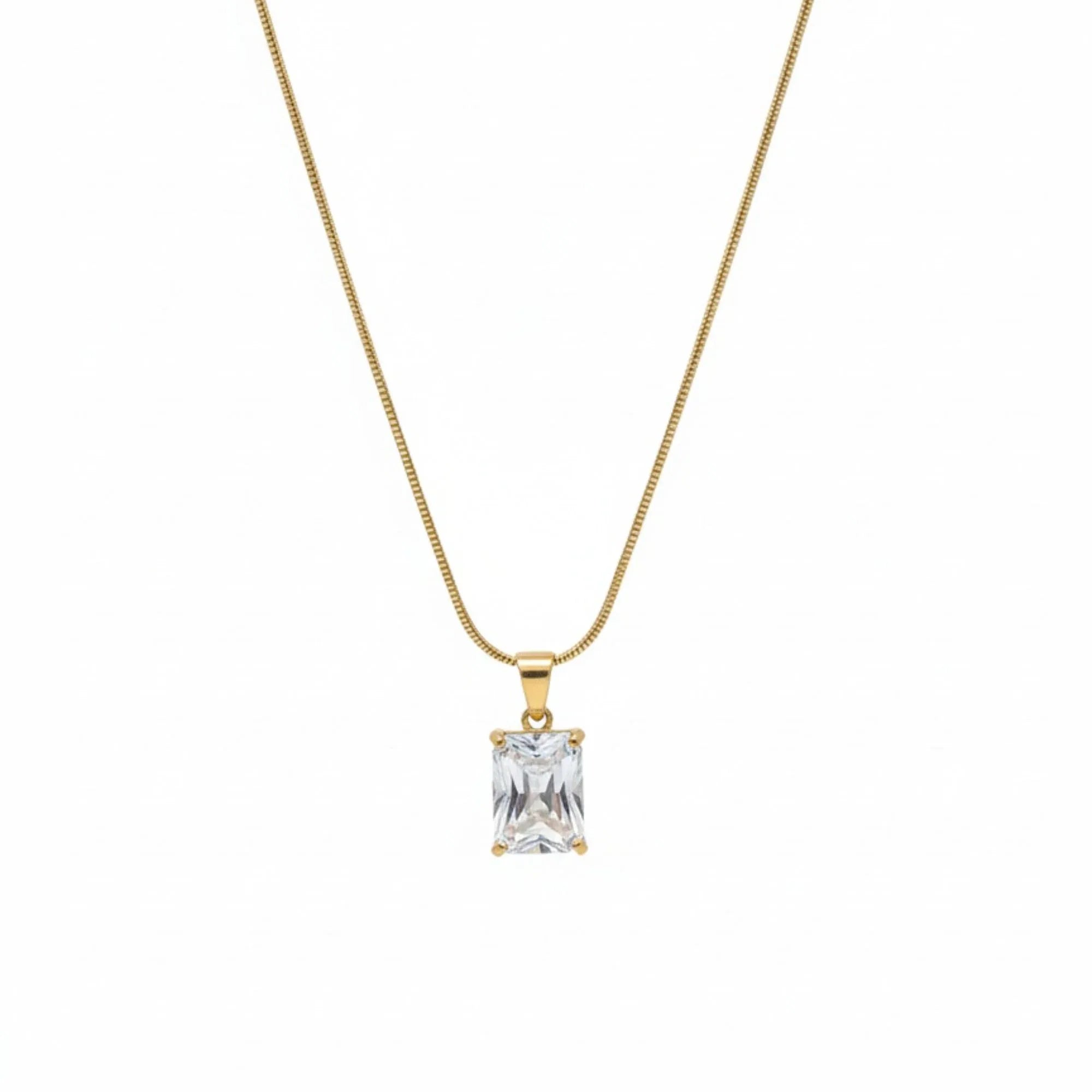 18K Gold Plated emerald cut solitaire necklace crafted in premium stainless steel featuring a brilliant rectangular zircon secured in a classic four-prong setting. A timeless minimal design perfect for office wear layering and elegant everyday styling.