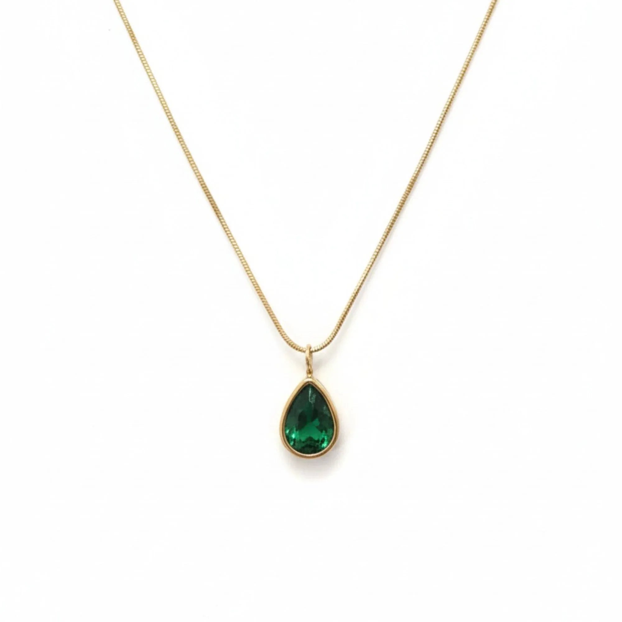 18K Gold Plated elegant pendant necklace crafted in premium stainless steel featuring a rich emerald green pear-cut zircon in a minimal bezel setting suspended from a delicate gold chain. A refined statement piece perfect for workwear evening styling and gifting.