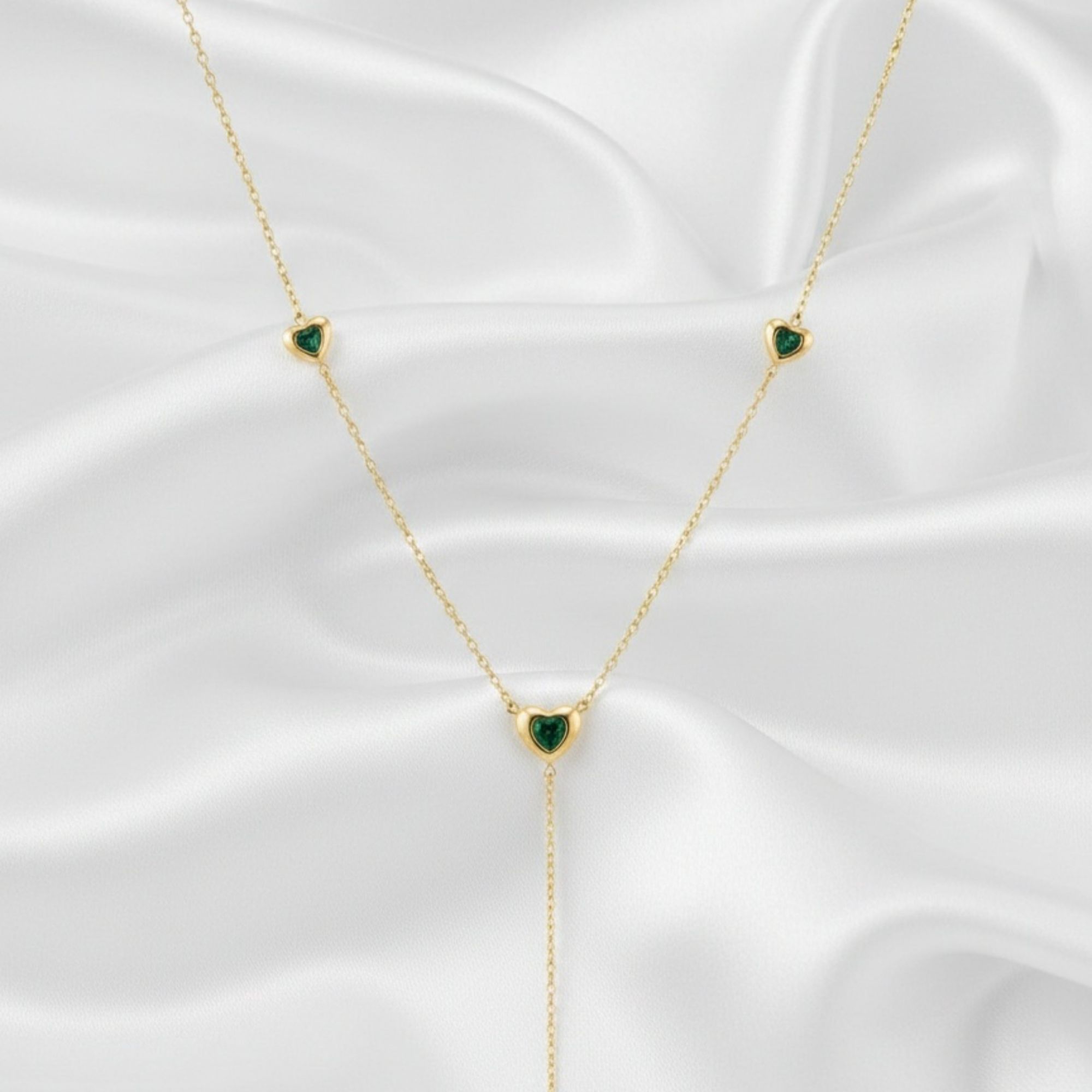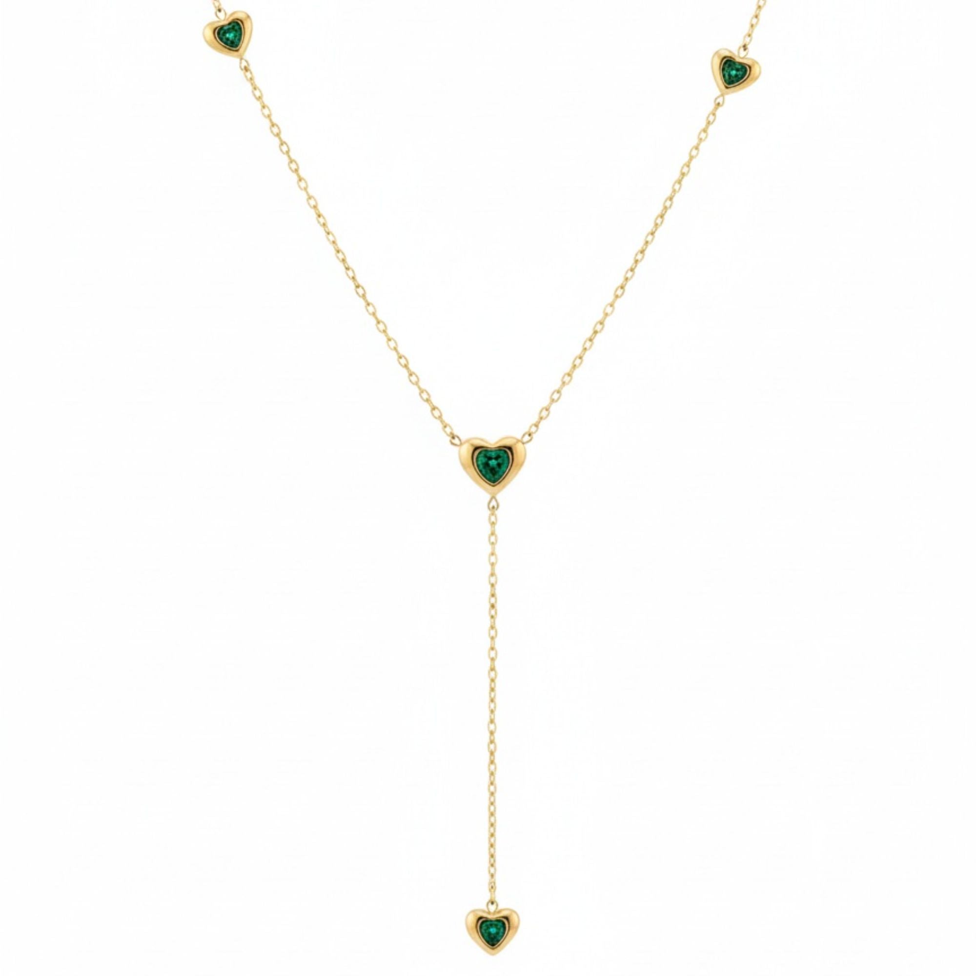 18K Gold Plated elegant necklace crafted in premium stainless steel featuring heart shaped green zircon stones placed delicately along the chain with a graceful drop heart detail. A romantic yet refined piece perfect for office wear, festive styling and special occasions.
