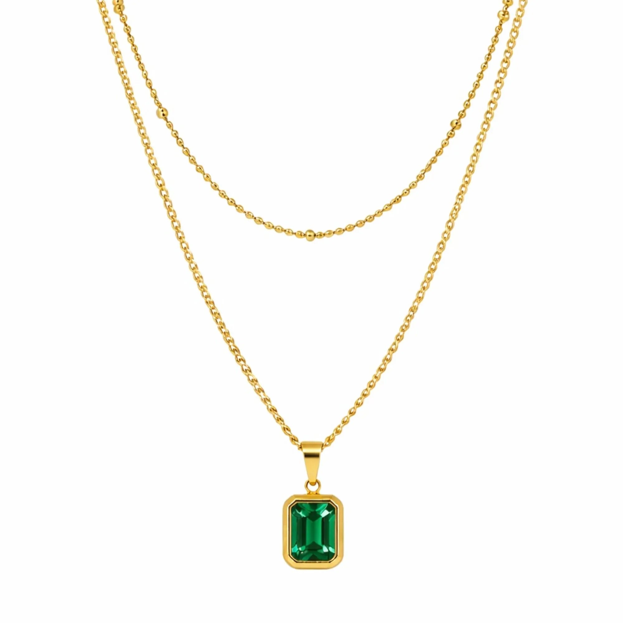 18K Gold Plated Emerald Zircon Rectangle Pendant Layered Necklace