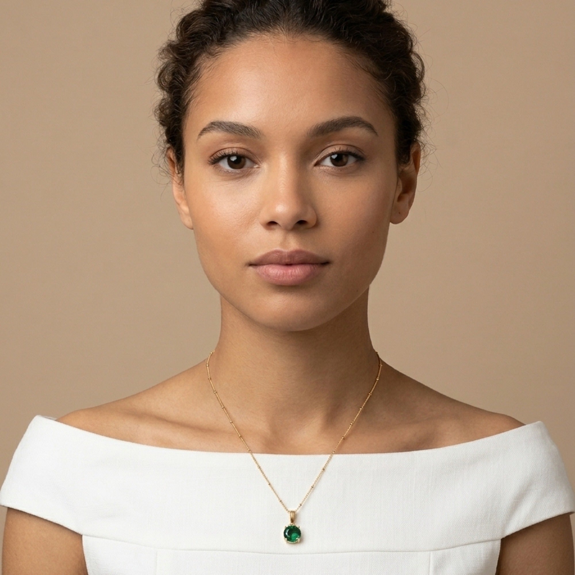 A single vivid green oval cubic zirconia stone set in a prong gold pendant, suspended from a dainty satellite chain with gold ball stations. Crafted in 18K gold plated anti-tarnish stainless steel, it is waterproof, sweat-proof and lightweight. A pop of emerald-inspired colour that elevates any outfit.