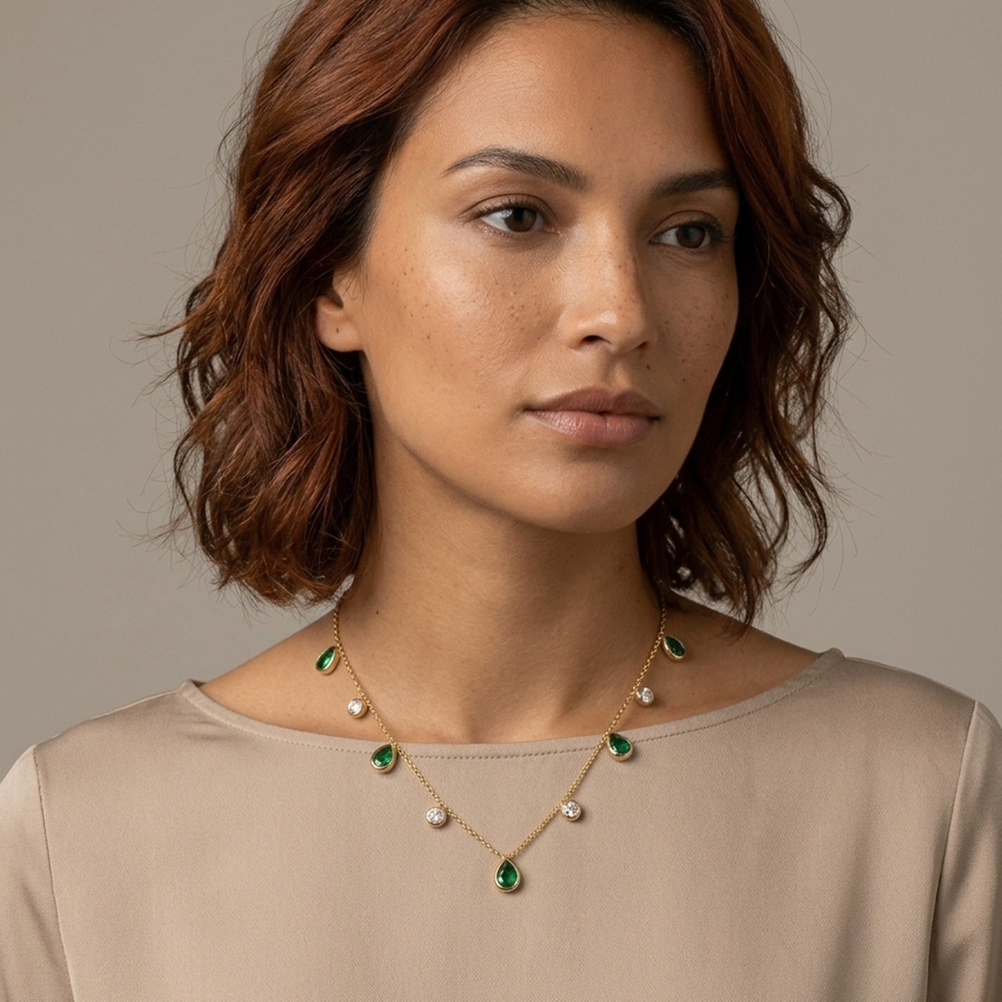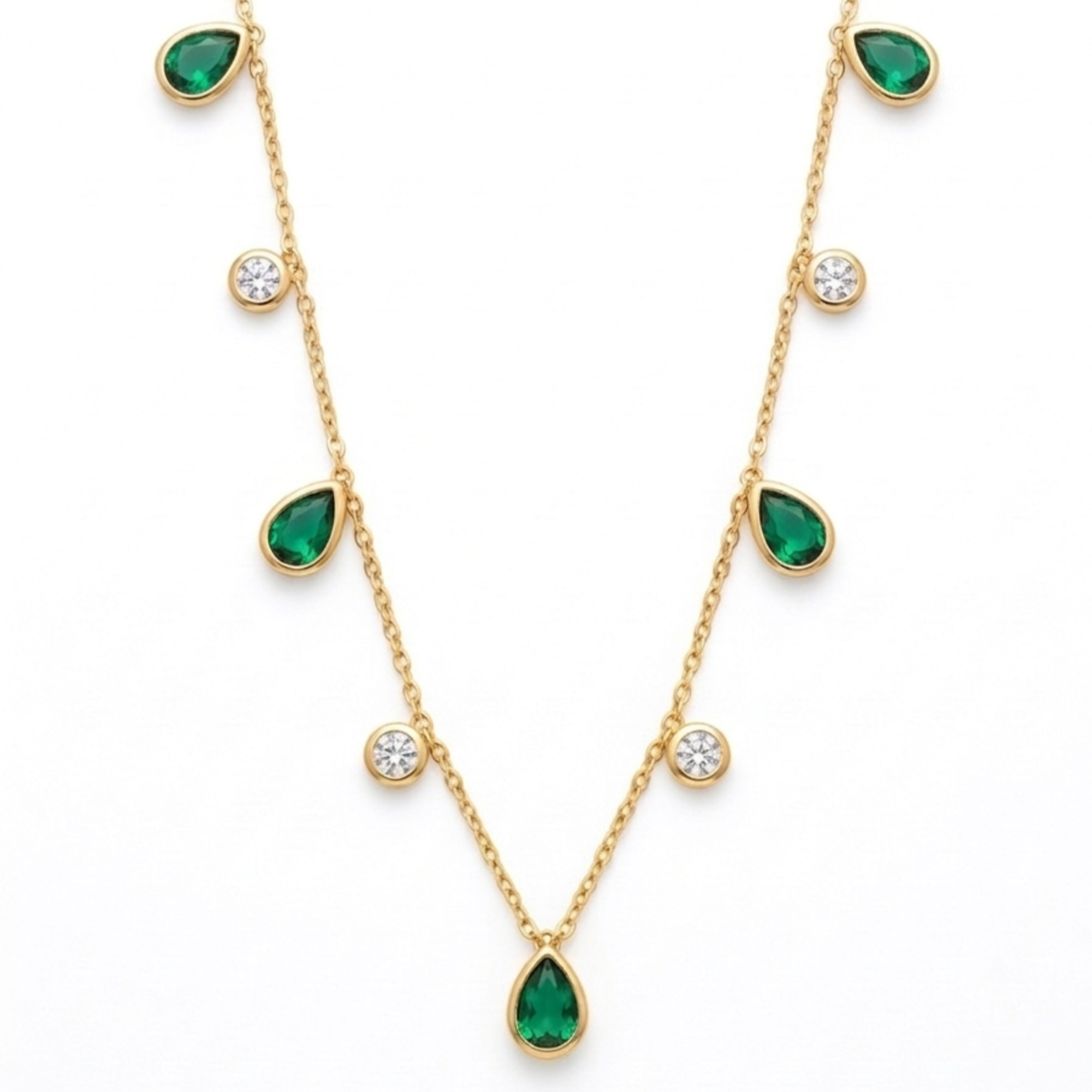 Vibrant green pear-shaped CZ drops alternate with sparkling white round CZ drops along a delicate cable chain — an emerald-inspired multicolour station necklace. Crafted in 18K gold plated anti-tarnish stainless steel. Waterproof, sweat-proof and lightweight. A festive, eye-catching piece for day and evening wear.