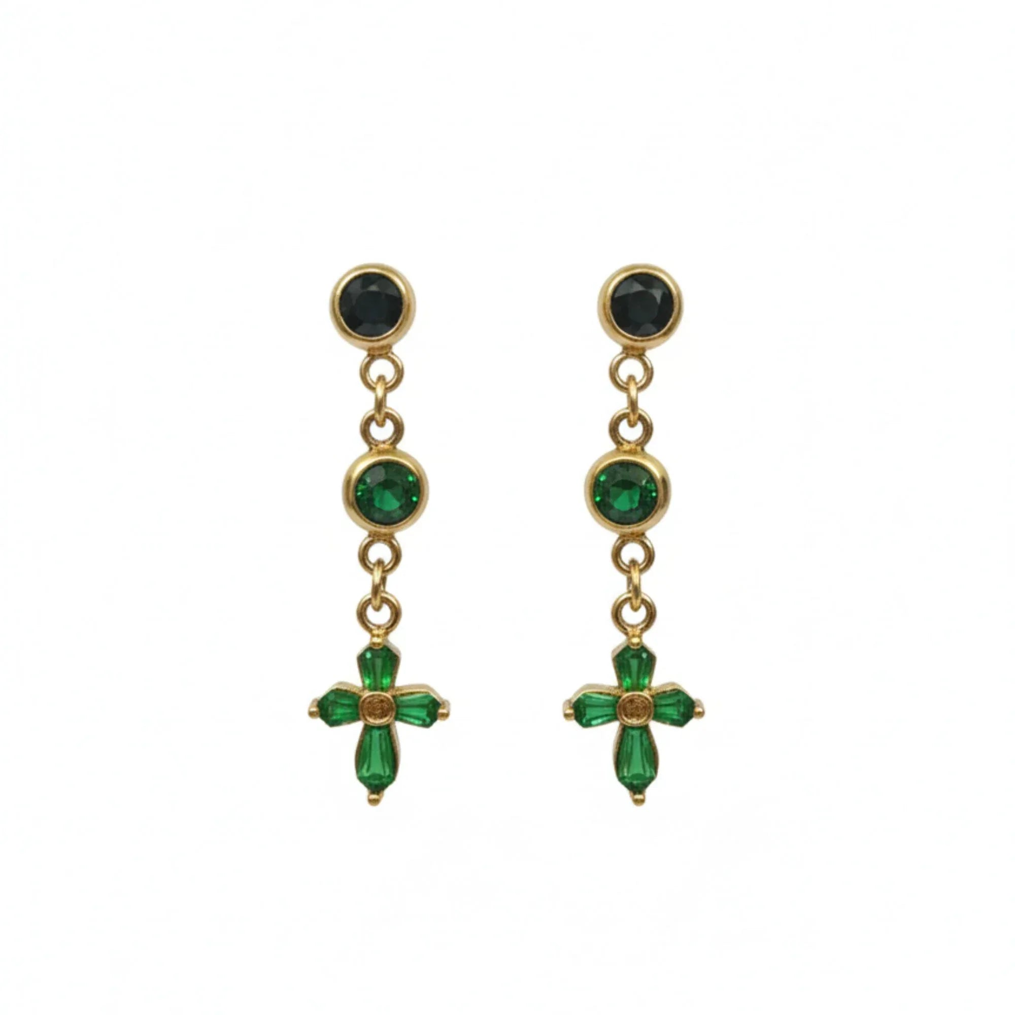 18K Gold Plated Green Stone Cross Drop Earrings