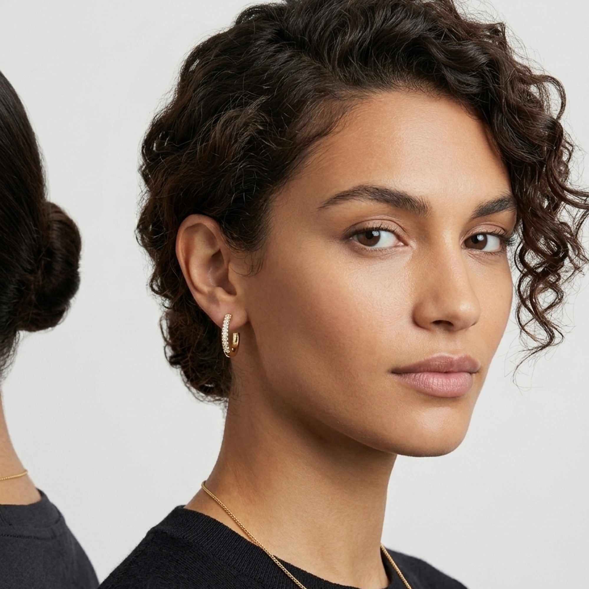 Mini J-hoop earrings with a front face lined with sparkling pavé cubic zirconia stones and a clean polished gold reverse — a perfect everyday pair that goes from office to evening. Crafted in 18K gold plated anti-tarnish stainless steel. Push-back closure. Waterproof, sweat-proof and lightweight.