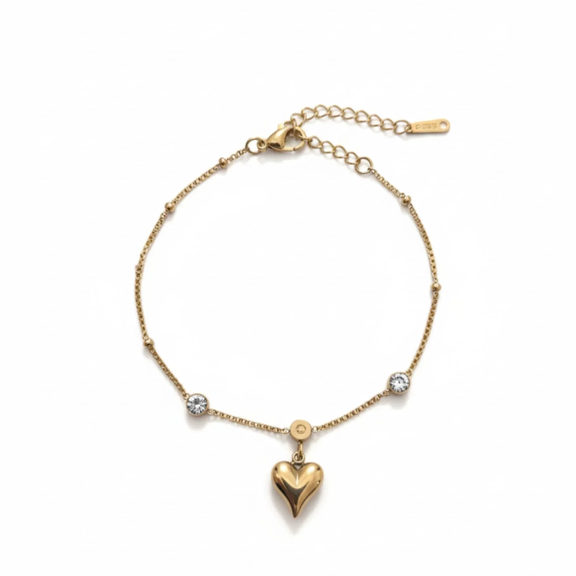 Delicate bracelet with heart charm and cubic zirconia stations crafted in stainless steel.