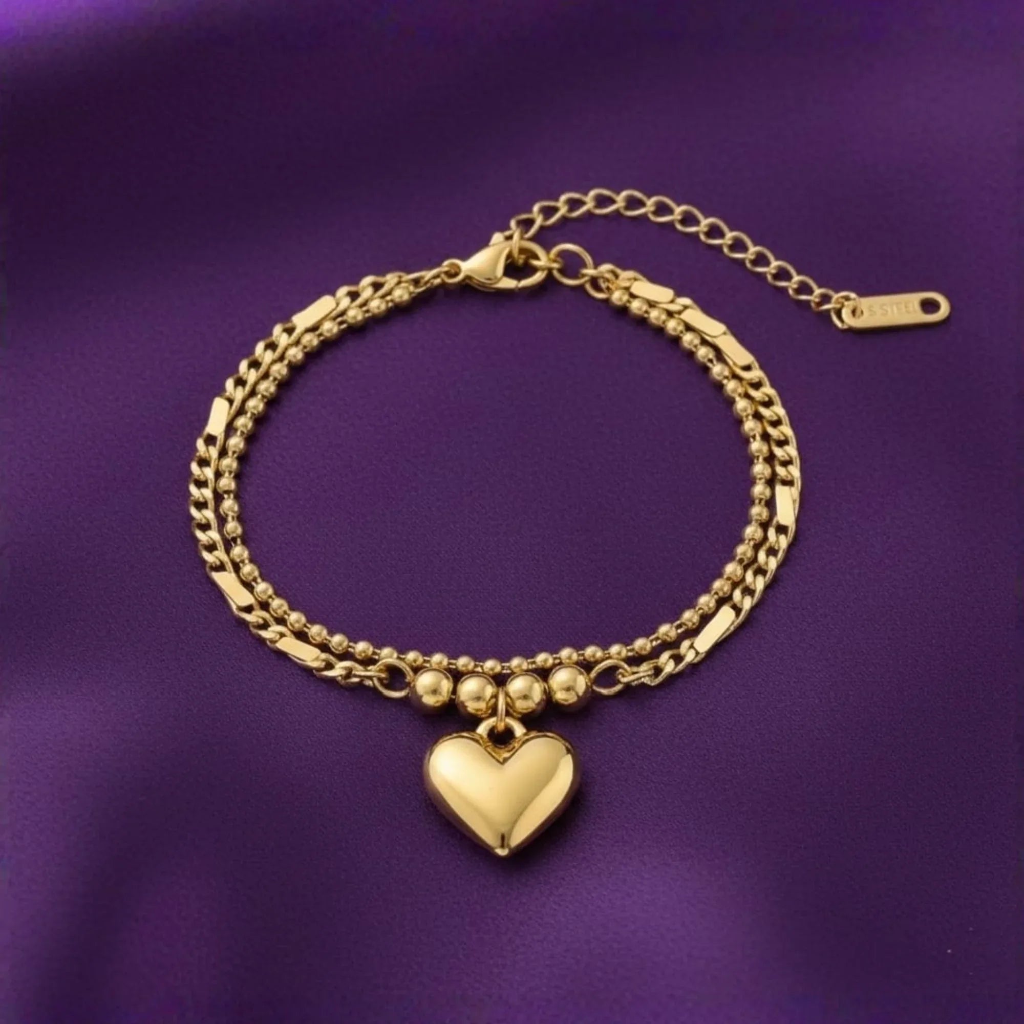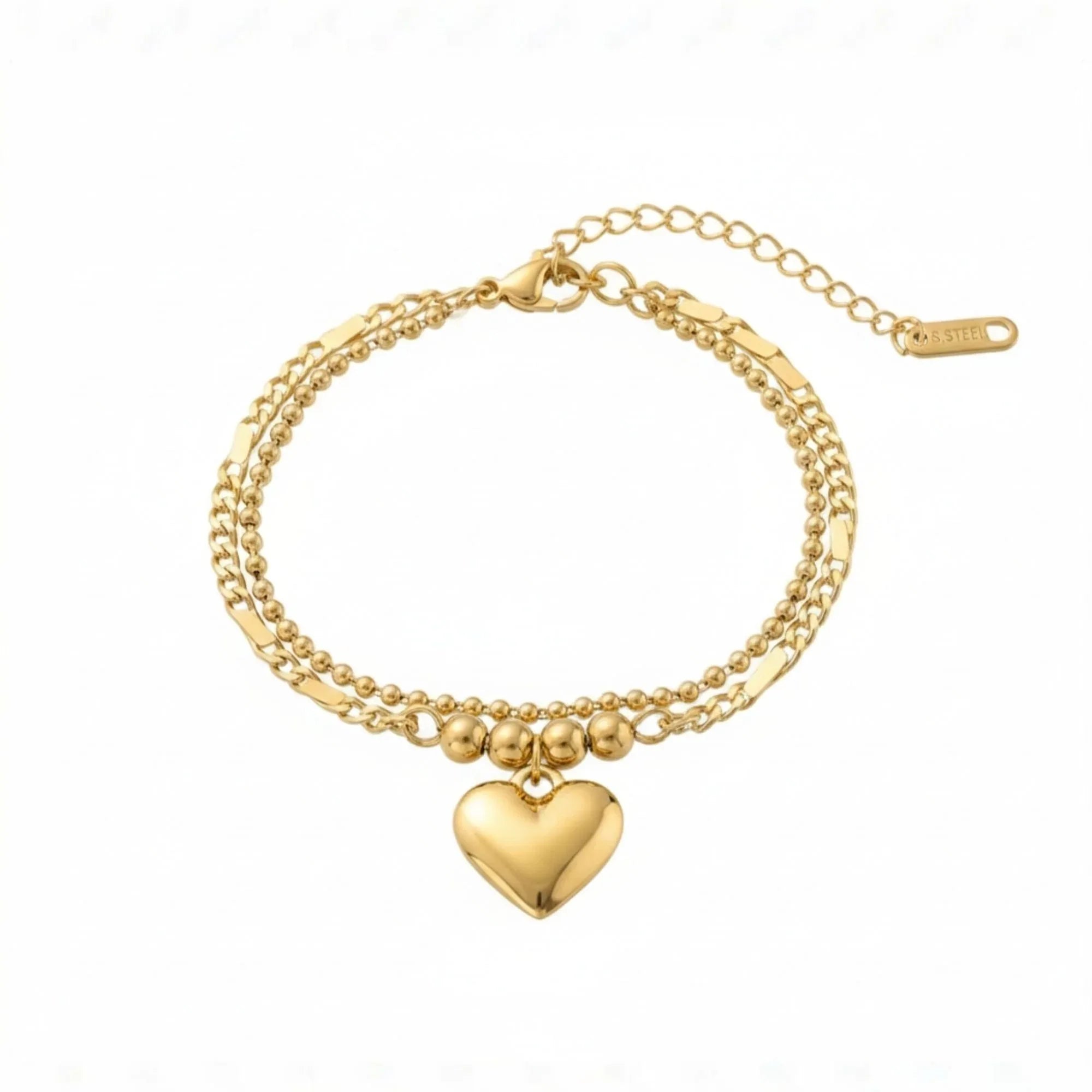 Elegant 18K gold plated stainless steel double chain bracelet featuring a polished heart charm for a romantic everyday look.