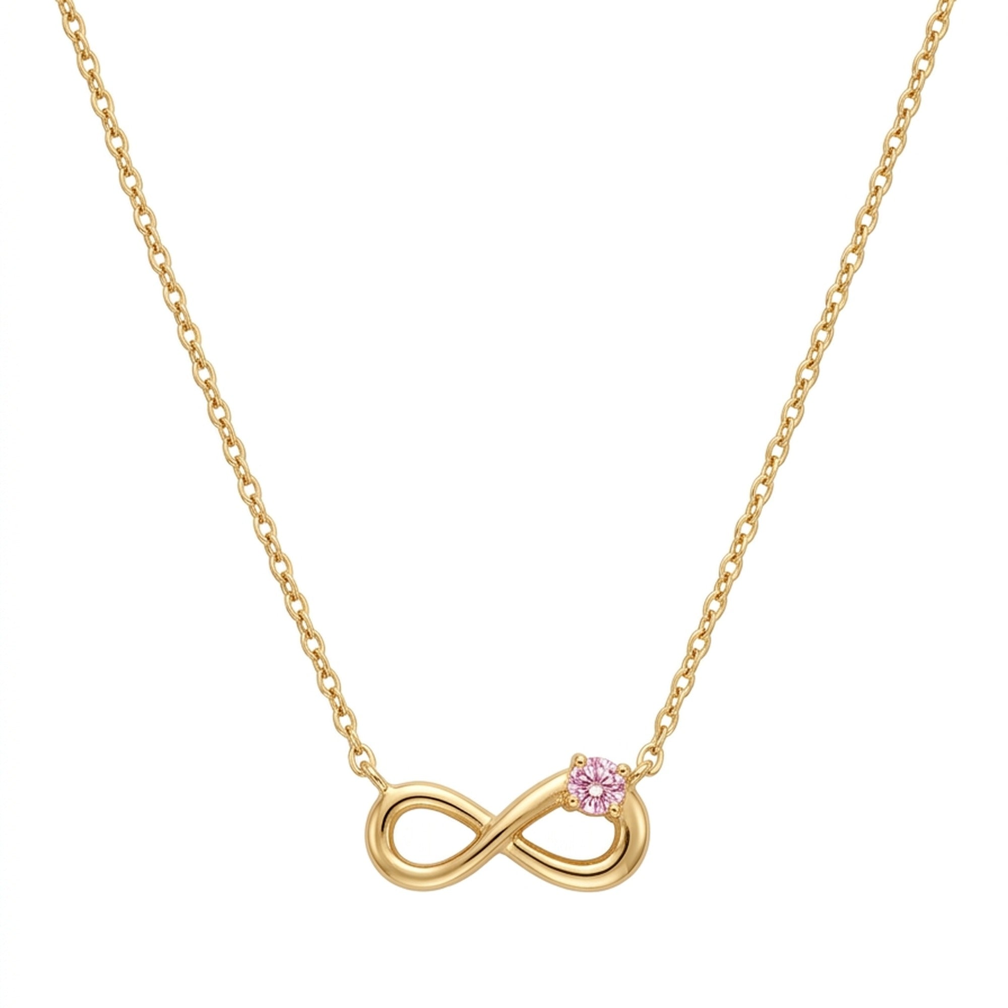 A sleek gold infinity symbol accented with a single sparkling pink cubic zirconia stone — delicate, romantic and wearable every day. Crafted in 18K gold plated anti-tarnish stainless steel, it is waterproof, sweat-proof and lightweight. A beautiful gift that speaks of infinite love.