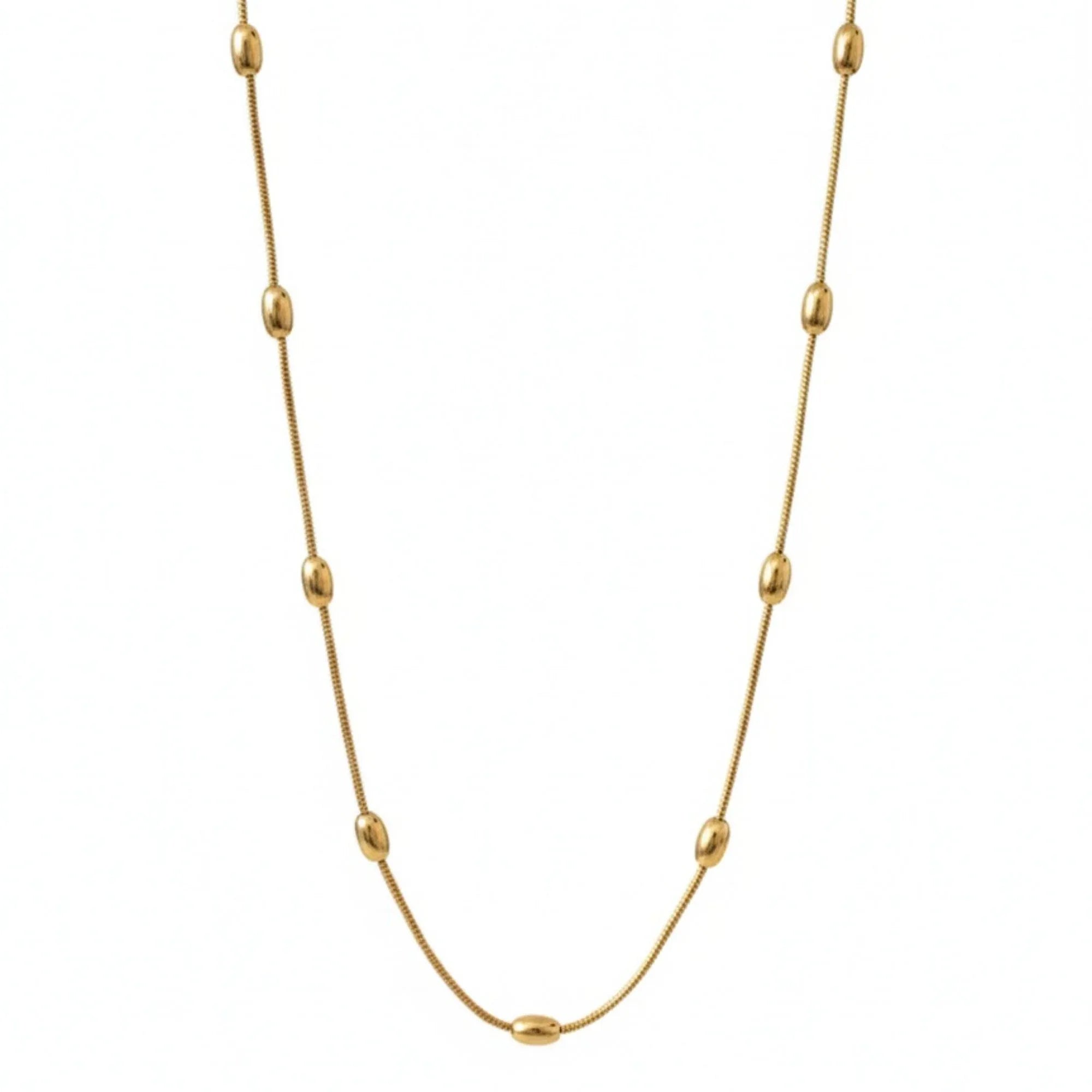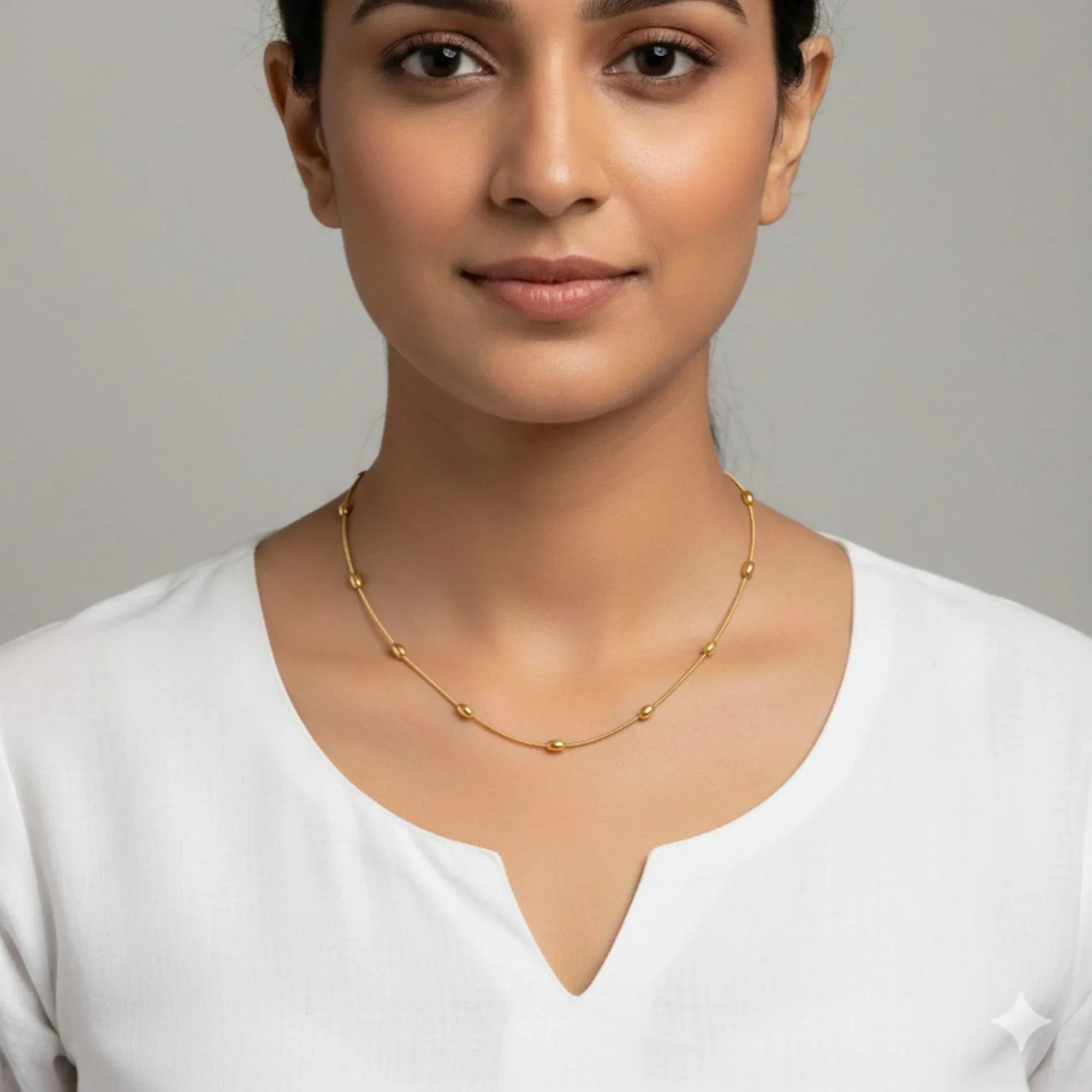 18K Gold Plated minimal gold beaded necklace crafted in premium stainless steel featuring evenly spaced oval bead accents on a sleek chain. A timeless everyday piece perfect for office wear, layering and elegant minimal styling.