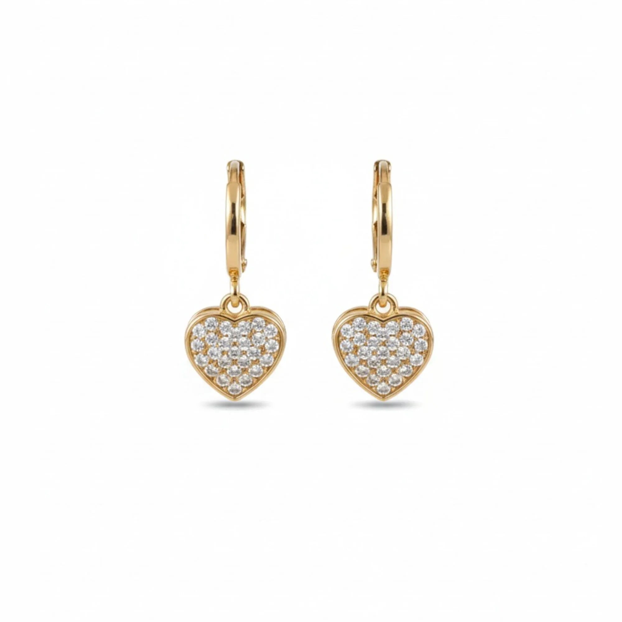 18K Gold Plated elegant drop hoop earrings crafted in premium stainless steel featuring heart shaped charms fully embellished with sparkling clear zircon stones in pave setting. Romantic and eye-catching design perfect for date nights parties festive styling and gifting.