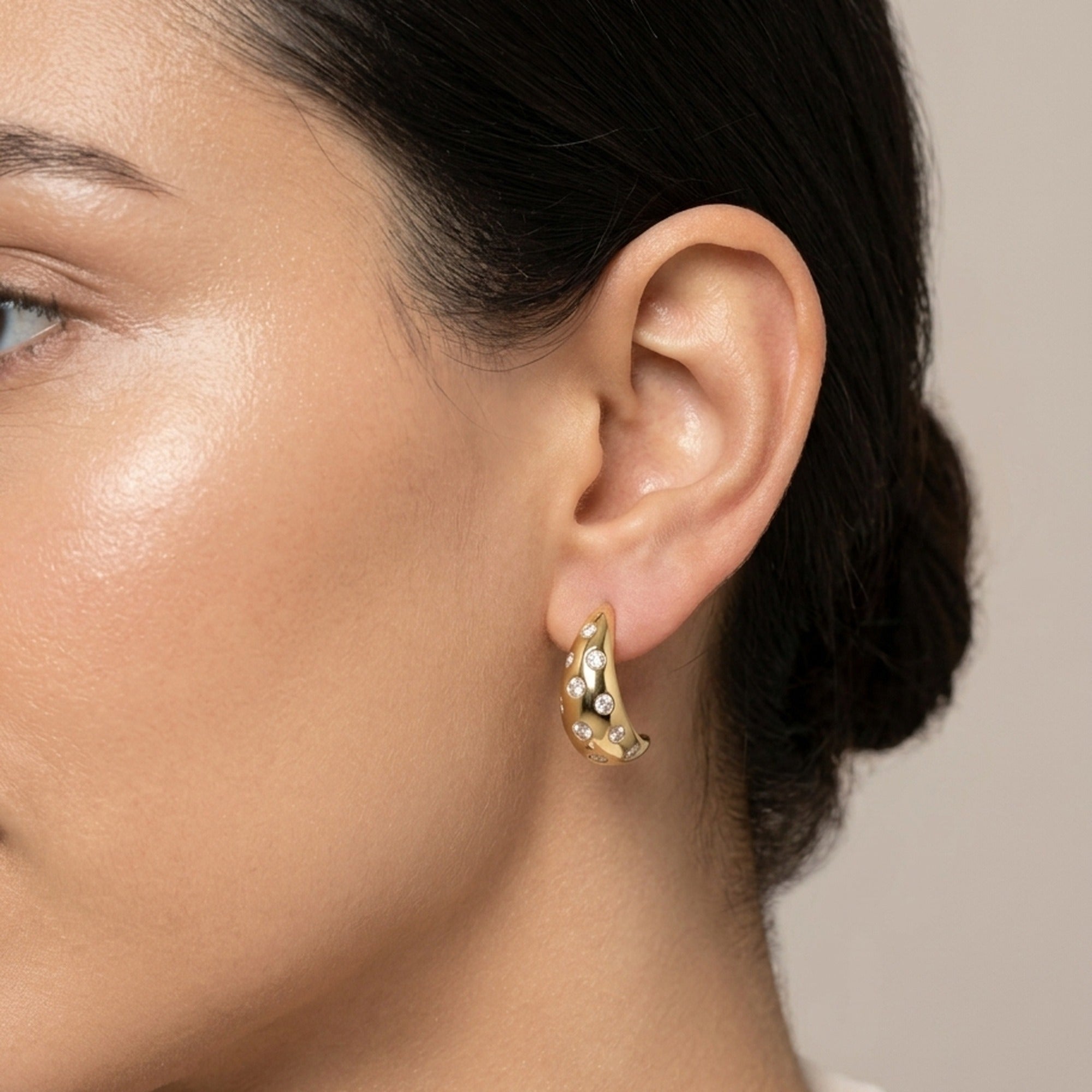 Chunky and luminous — these puffy teardrop J-hoop stud earrings are scattered with bezel-set CZ stones for a galaxy-of-stars effect. Crafted in high-gloss 18K gold plated anti-tarnish stainless steel. Push-back closure. Waterproof, sweat-proof and lightweight.