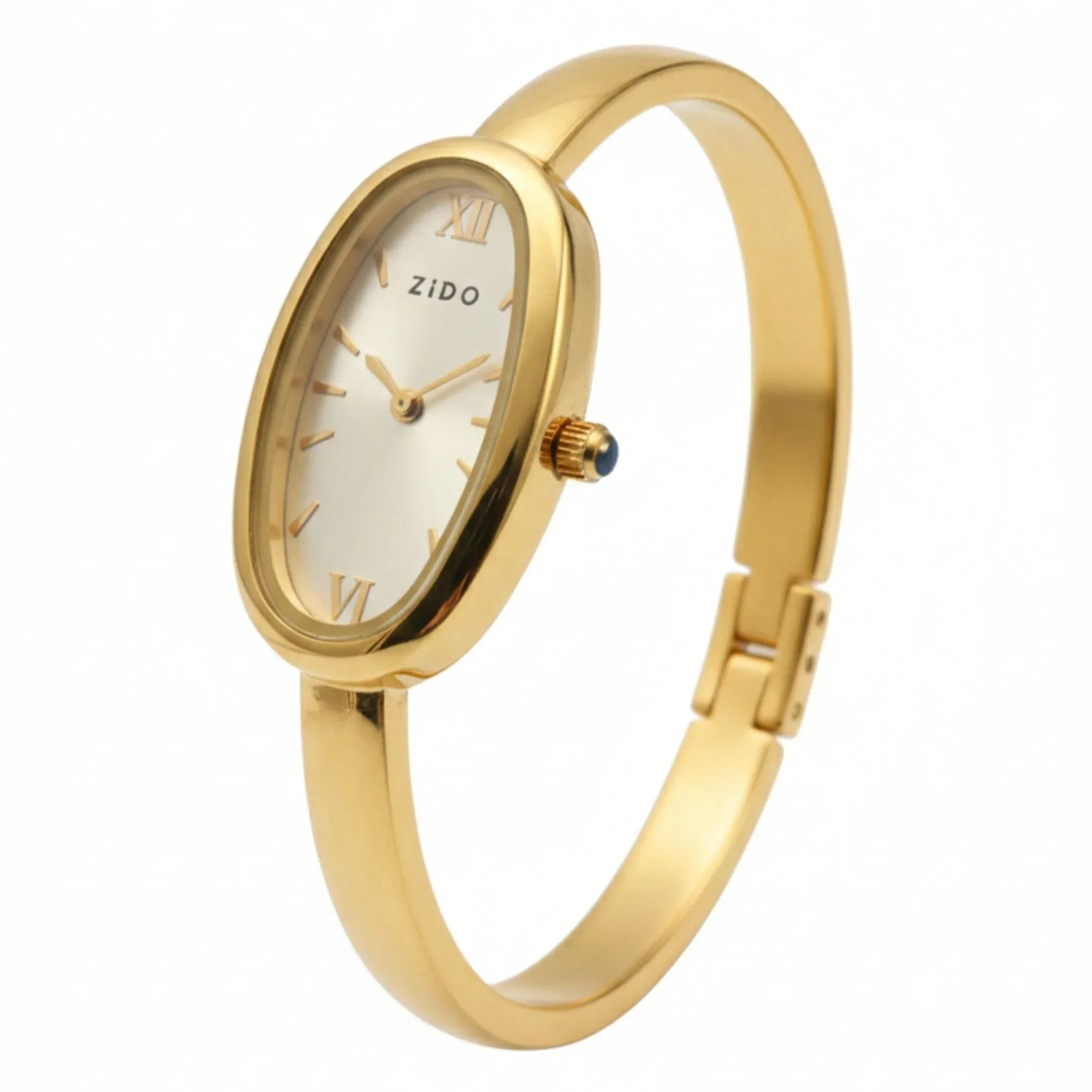 This 18K Gold Plated Roman Oval Bangle Watch from Rachiva features an elegant oval dial with classic Roman numeral markers and a sleek jewellery-style bangle strap. Crafted on a durable stainless steel base with premium gold plating, this quartz watch blends timeless design with modern minimalism, making it perfect for office wear, daily styling and gifting.
