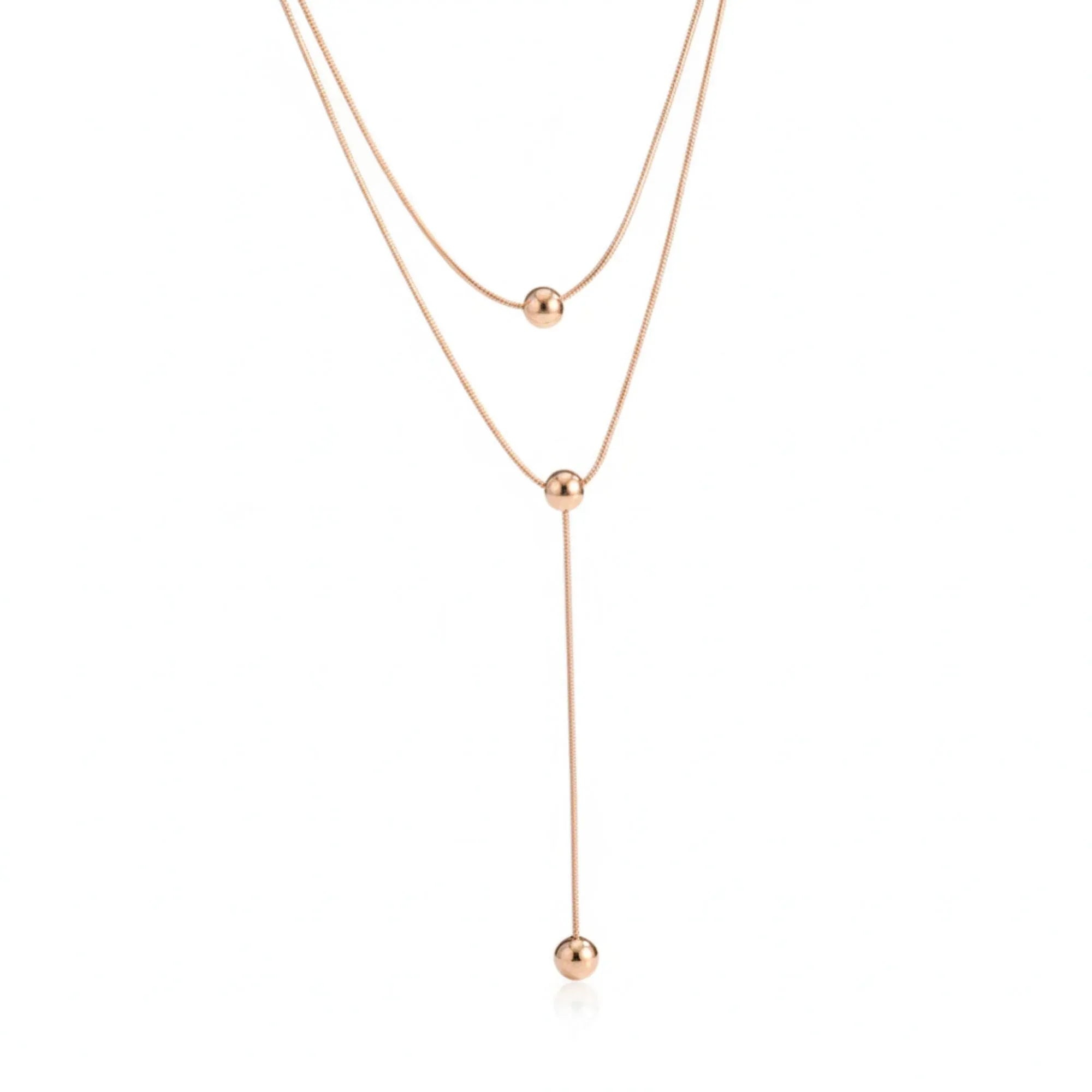 Elevate your everyday style with this elegant 18K Gold Plated Rose Gold Layered Bead Necklace from Rachiva. Crafted in premium stainless steel with a sophisticated rose gold finish, this layered necklace features sleek chains adorned with minimal spherical bead accents and a delicate drop detail. A modern, versatile design perfect for effortless layering or standalone wear.