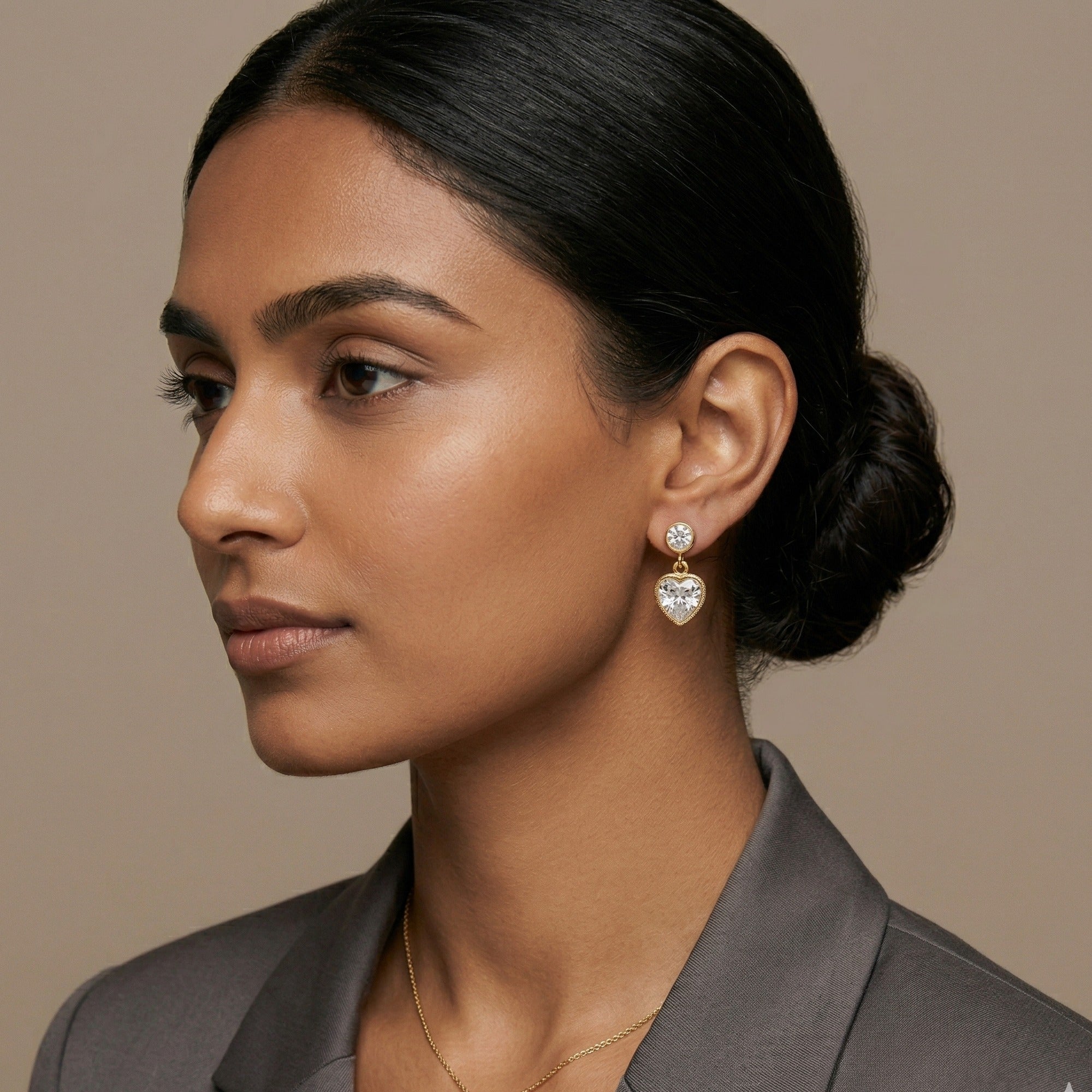 A round bezel-set CZ stud tops a heart-shaped bezel CZ drop — two stones, one romantic design. Crafted in 18K gold plated anti-tarnish stainless steel. Push-back closure. Waterproof, sweat-proof and lightweight. A perfect gift for Valentine's Day and anniversaries.