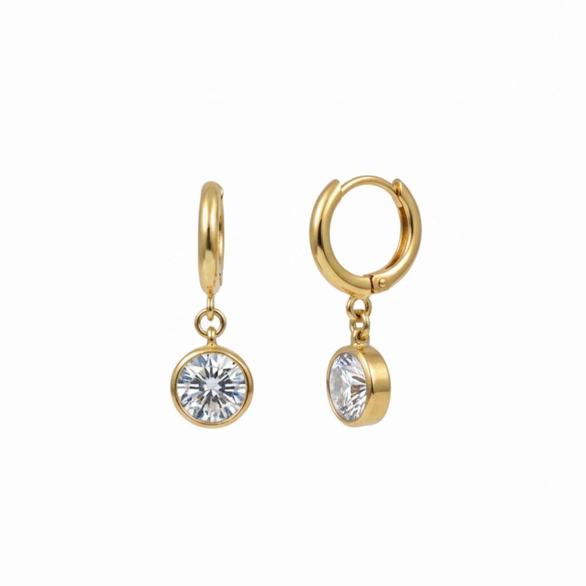 18K gold plated stainless steel huggie earrings featuring bezel-set round white zircon drops; elegant everyday jewellery.