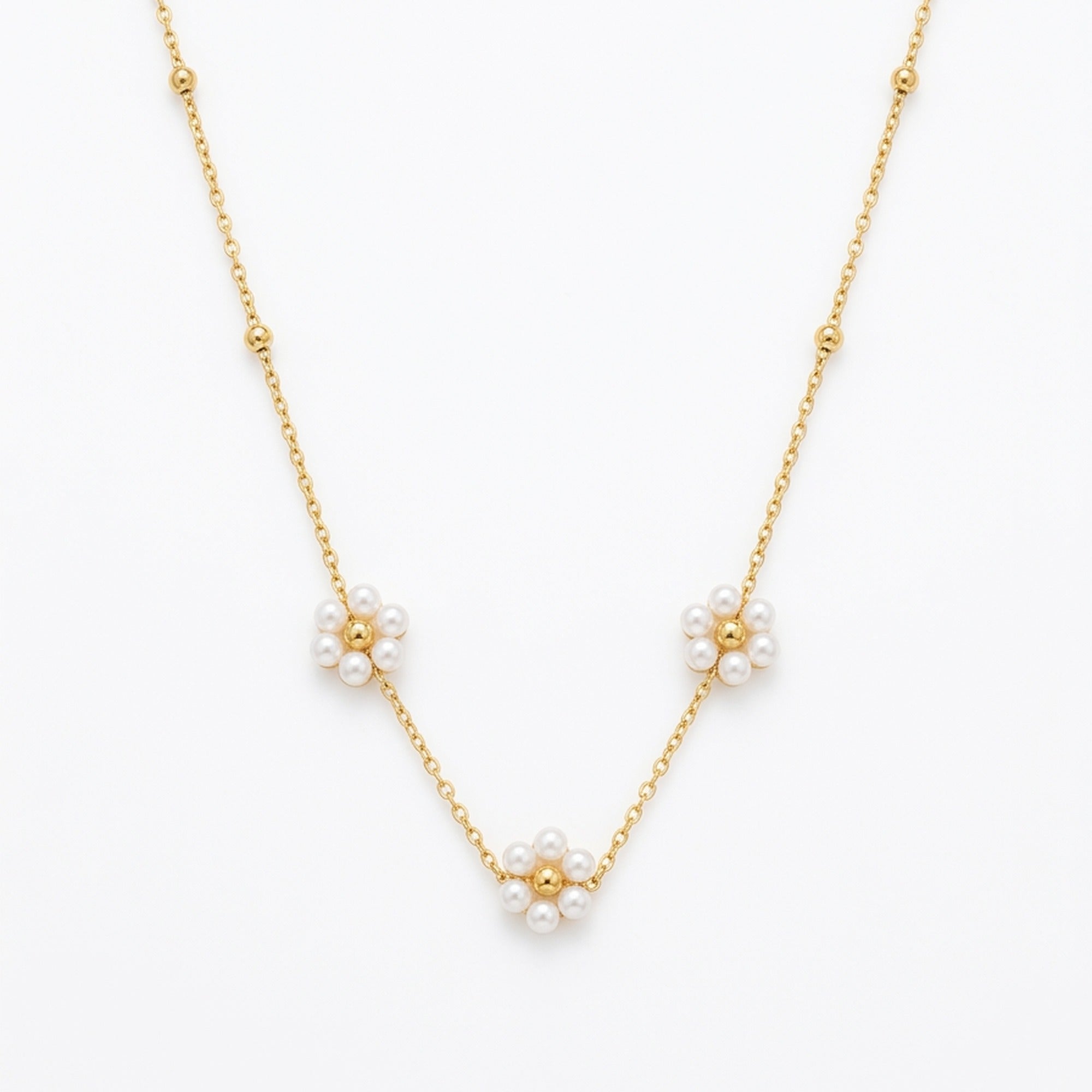 Three hand-assembled pearl daisy flower clusters — each with six faux pearls around a gold bead centre — sit along a gold satellite chain in this delicate and feminine necklace. Crafted in 18K gold plated anti-tarnish stainless steel. Waterproof, sweat-proof and lightweight. A charming everyday and festive piece.