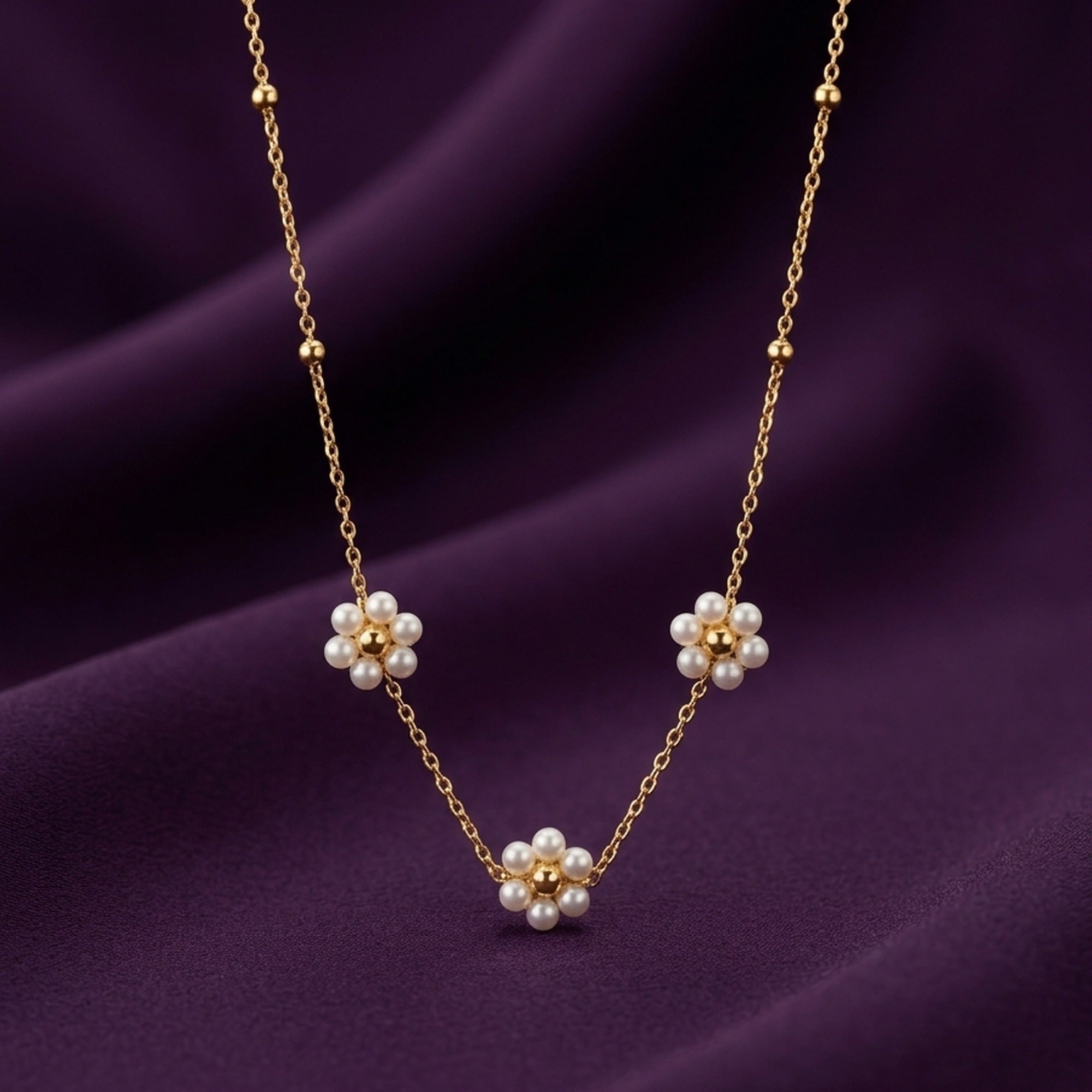 18K Gold Plated Triple Pearl Flower Satellite Chain Necklace