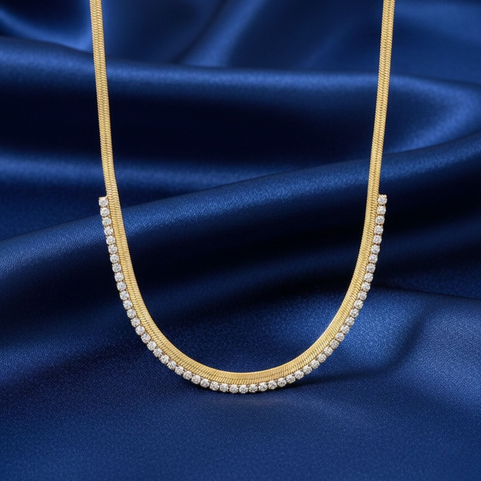 18K Gold Plated premium herringbone necklace crafted in high quality stainless steel featuring a sleek flat snake chain accented with a row of sparkling round zircon stones for a bold yet elegant look. A statement piece perfect for office wear, evening styling and festive occasions.
