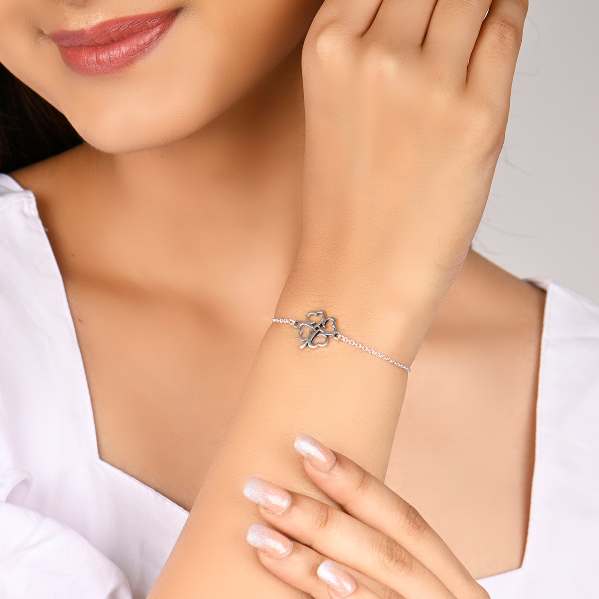 A delicate masterpiece that embodies the essence of dainty luxury - Rachiva's 925 sterling silver Celestial Divine Heart Silver Bracelet. The bracelet's four heart-shaped petals stand as a timeless symbol of love, making it a thoughtful gift for someone special or a cherished addition to your own jewellery collection. The flawless silver finish exudes a premium charm, ensuring that this piece remains a timeless classic.