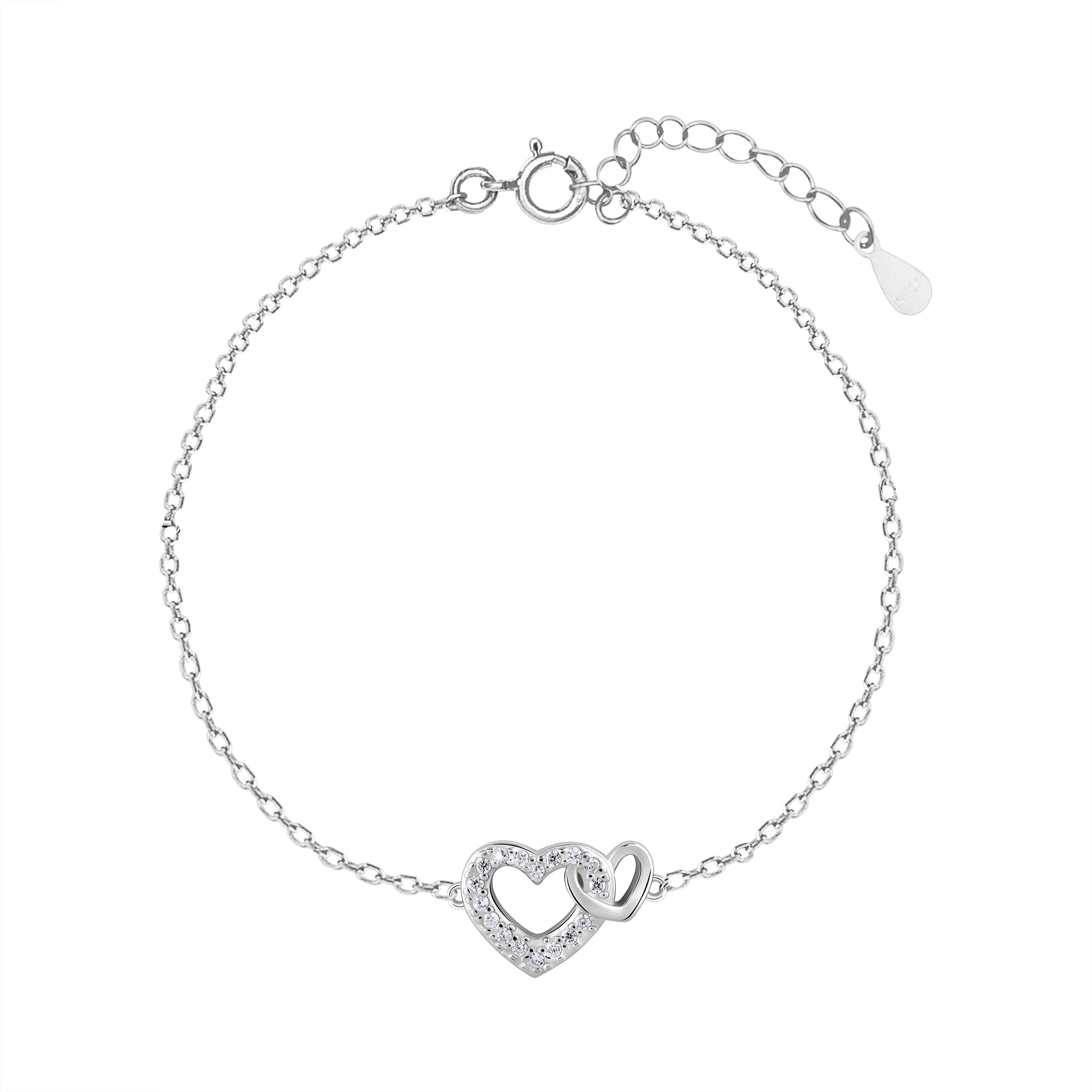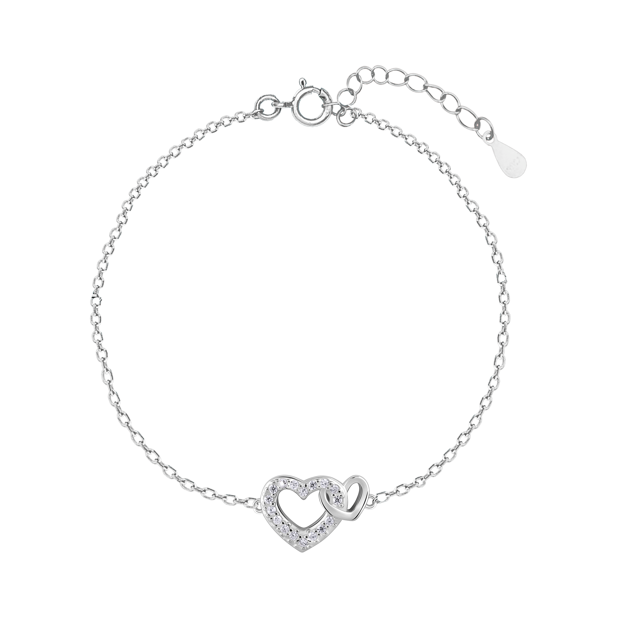 Indulge in the beauty of never ending love with Rachiva's Enchanted Love Silver Duo Hearts Bracelet. Crafted with precision from 925 sterling silver, this bracelet features two hearts that tell a timeless tale. The larger heart, outlined with shimmering Zircon stones, exudes a sense of glamour and charm. The smaller heart delicately perched above signifies the beauty of the precious moments shared. The timeless finish reflects the enduring nature of love, making this bracelet an ideal gift for someone special.
