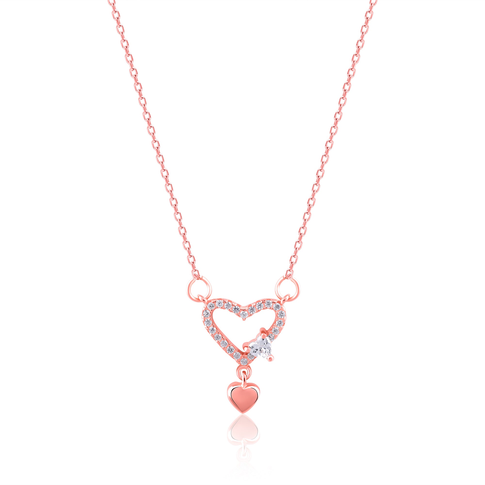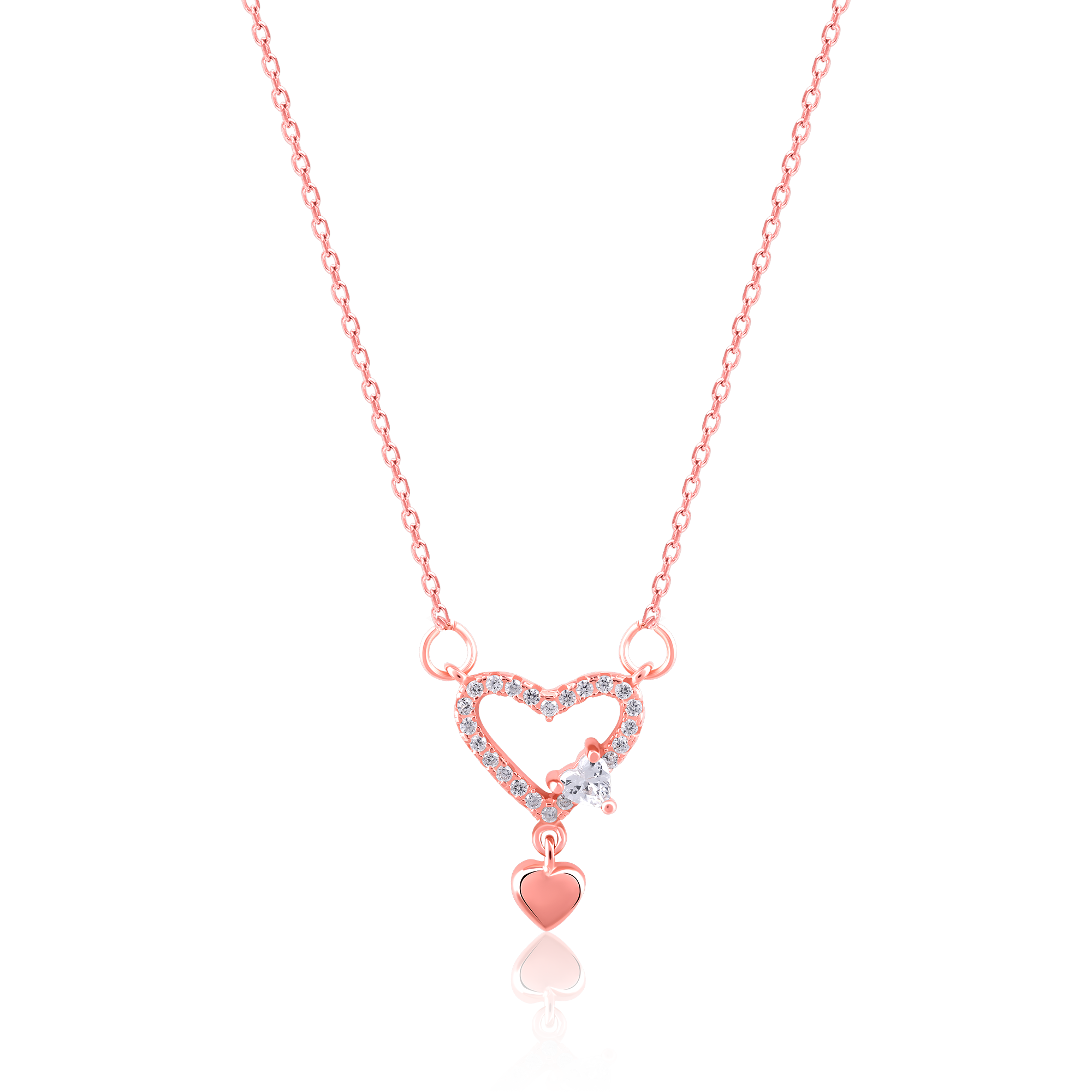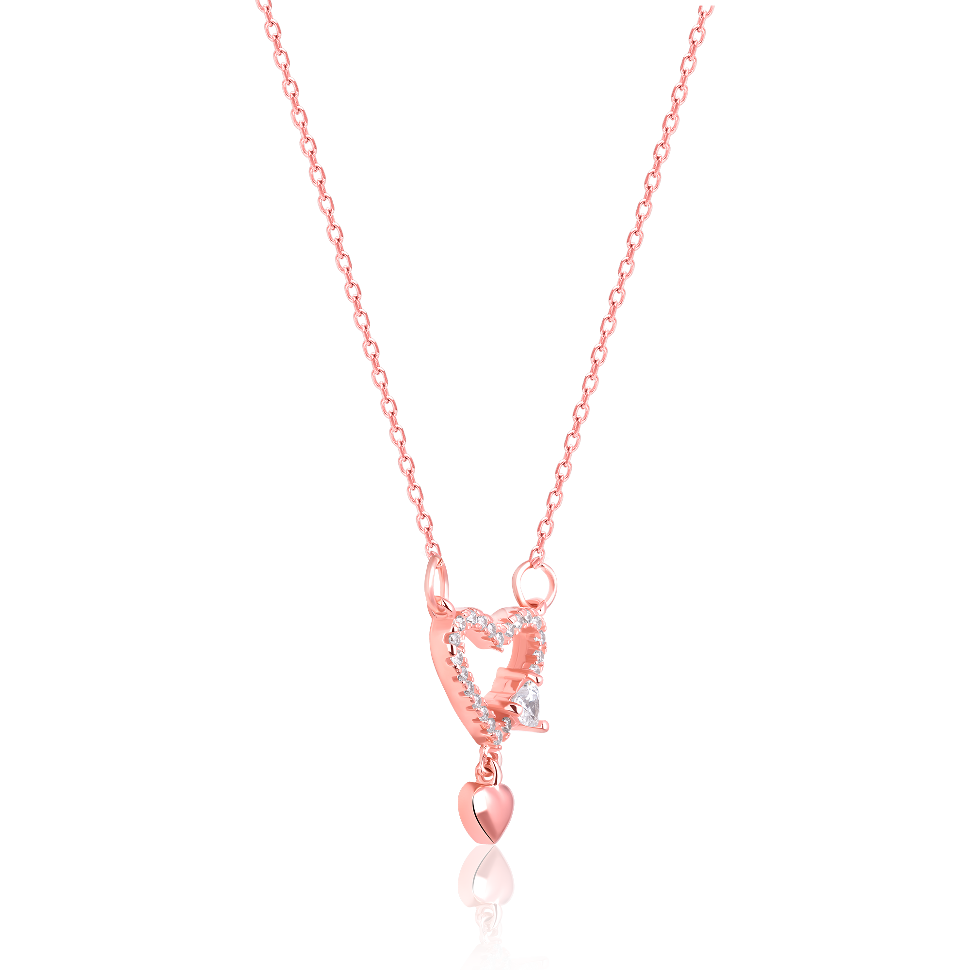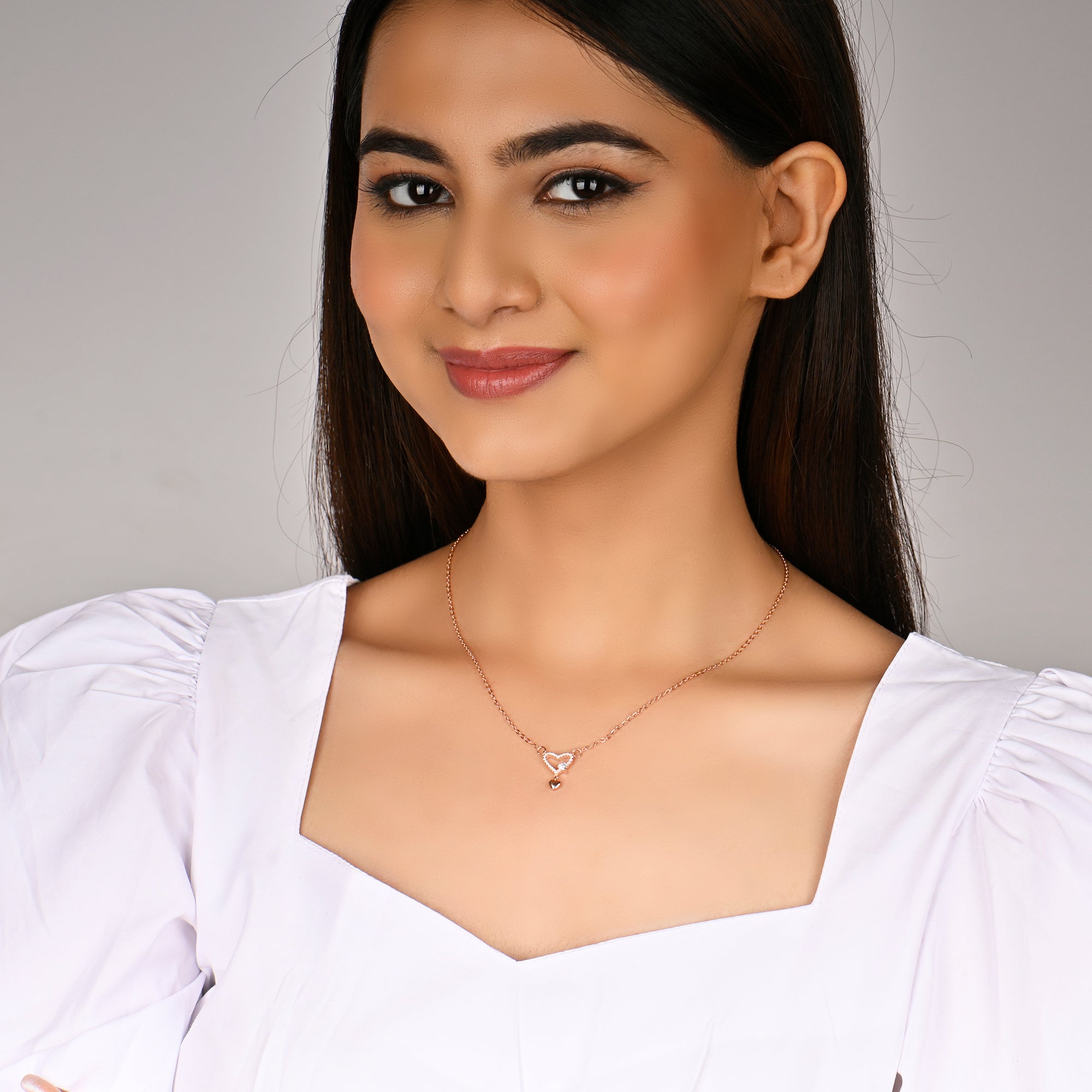 Celebrate moments that matter with Rachiva's Linked Hearts Rose Gold Pendant with Link Chain. This enchanting 925 sterling silver jewellery showcases two hearts, intricately linked to create a symbol of enduring love. The larger heart, adorned with a studded Zircon stone outline, embraces a smaller heart below, creating a captivating design. The delicate rose gold finish enhances the pendant's charm, making it a cherished addition to your jewellery collection.
