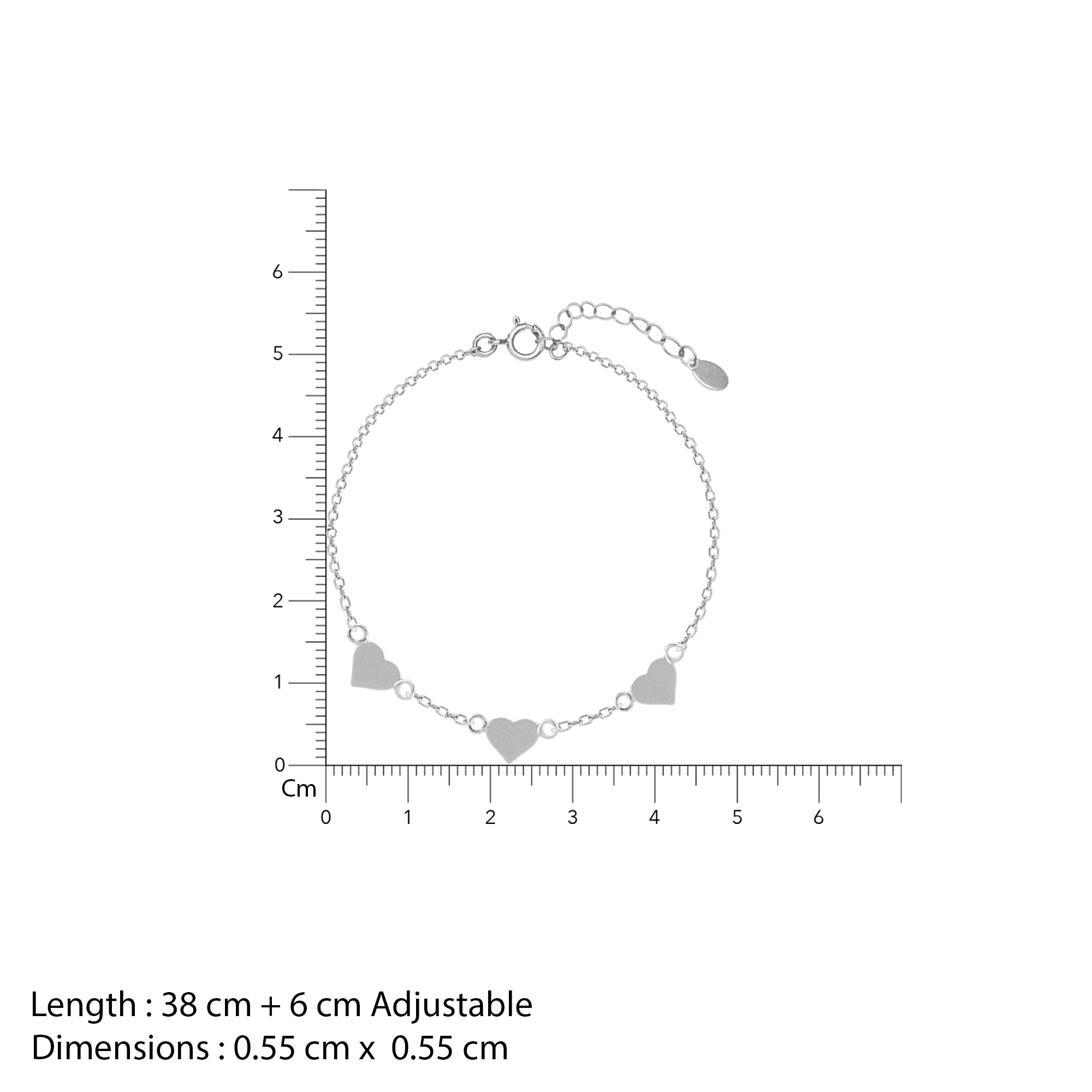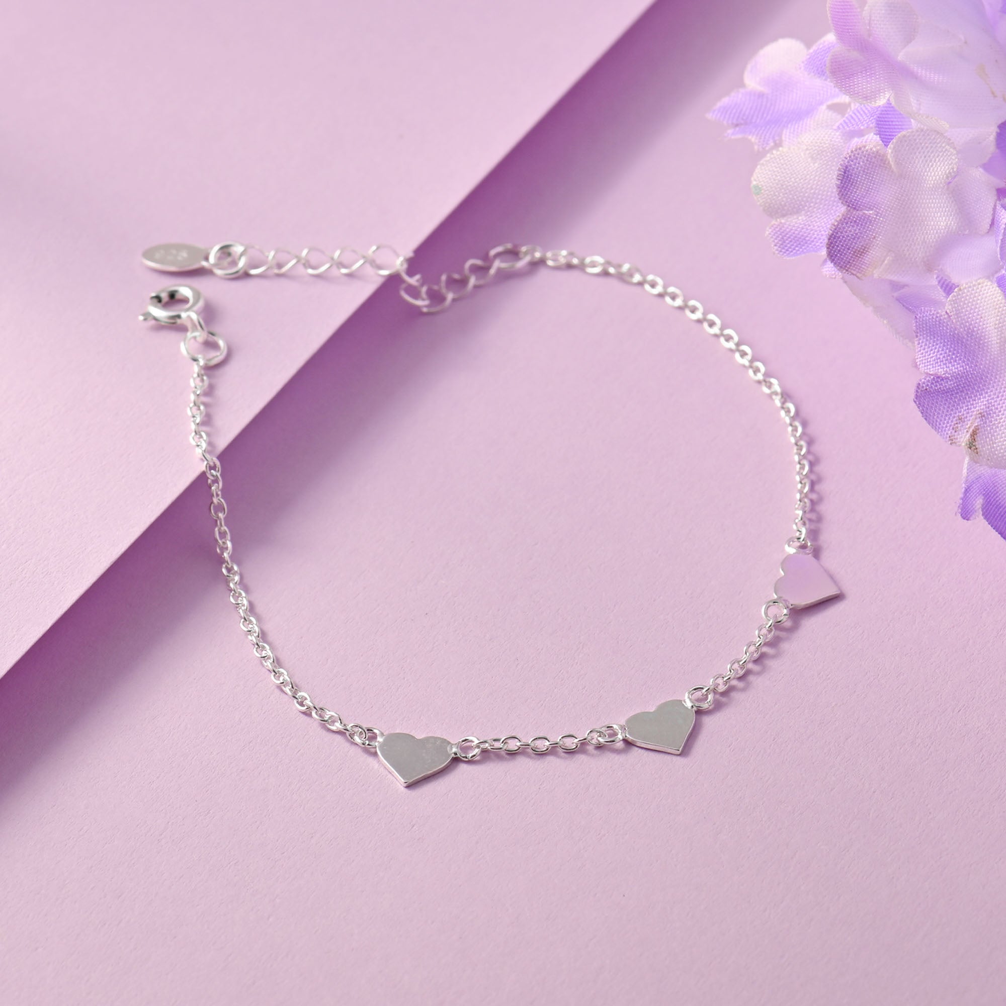 A cherished symbol of meaningful connections - Rachiva's Modern Love Connection Silver Bracelet. Crafted with attention to detail, this bracelet features four intricately designed hearts in pure 925 sterling silver, symbolizing meaningful connections. Each heart in this bracelet carries a profound meaning – from love and friendship to joy and commitment. Designed for the modern woman, this dainty piece seamlessly transitions from day to night, adding a touch of elegance to any outfit.