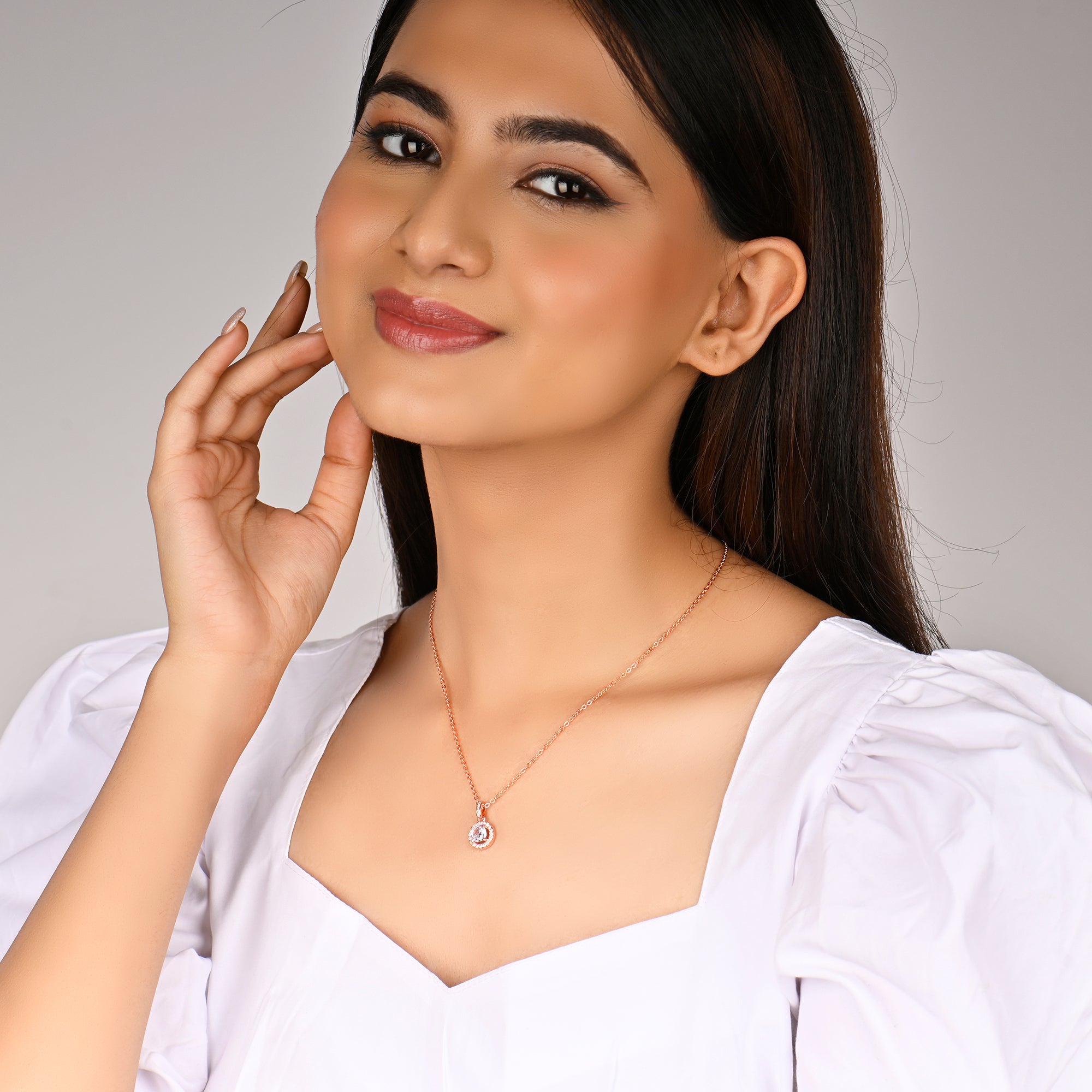 Adorn yourself with the graceful simplicity of Rachiva's Ornate Solitaire Zircon Rose Gold Pendant with Link Chain. The round shape, adorned with meticulous studded Zircon stone detailing, creates a captivating visual symphony. Nestled within is a statement Zircon stone, adding a touch of brilliance that turns heads. The rose gold finish of this 925 sterling silver chain pendant effortlessly complements any ensemble.