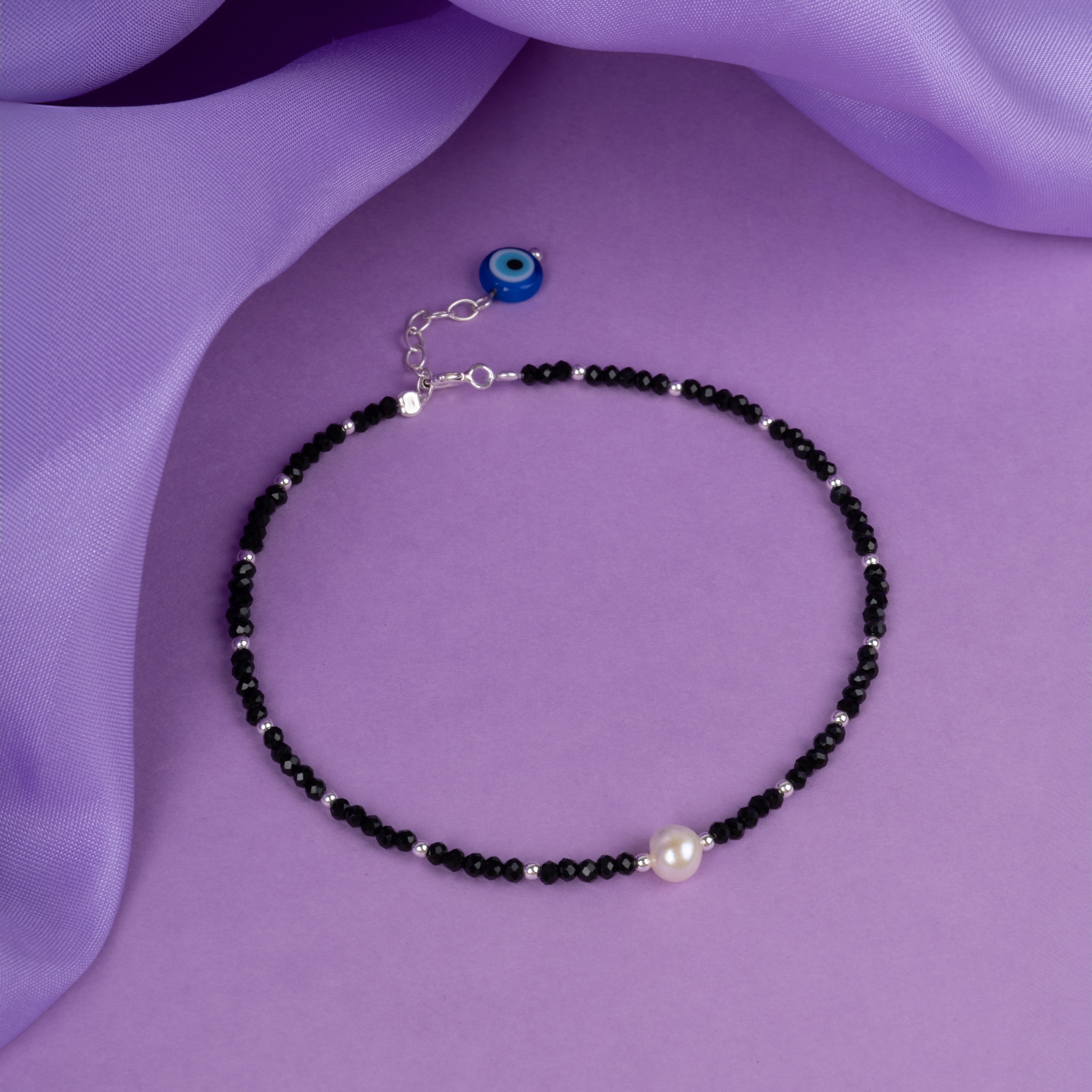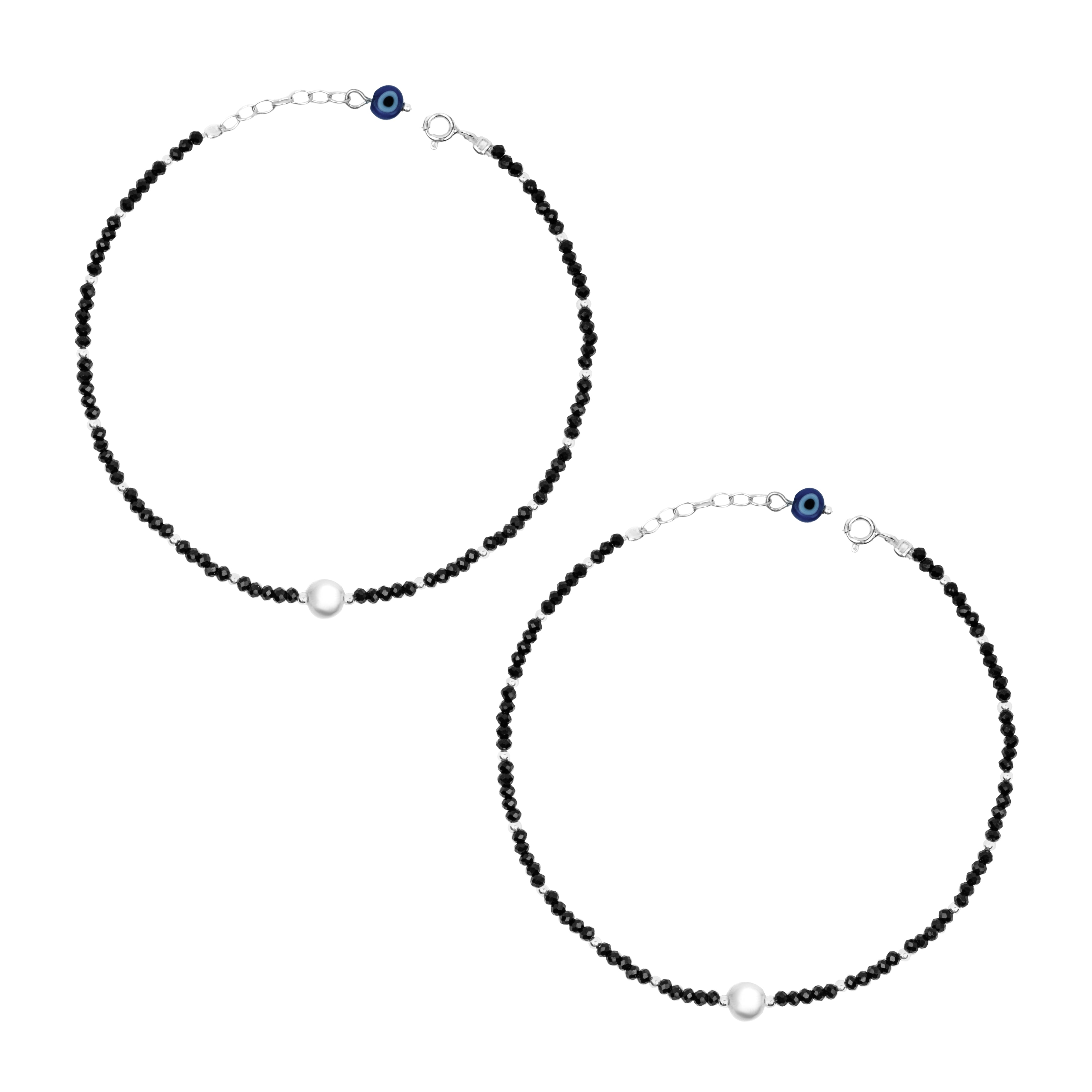 Single Pearl Evil Eye Black Beads Silver Anklets