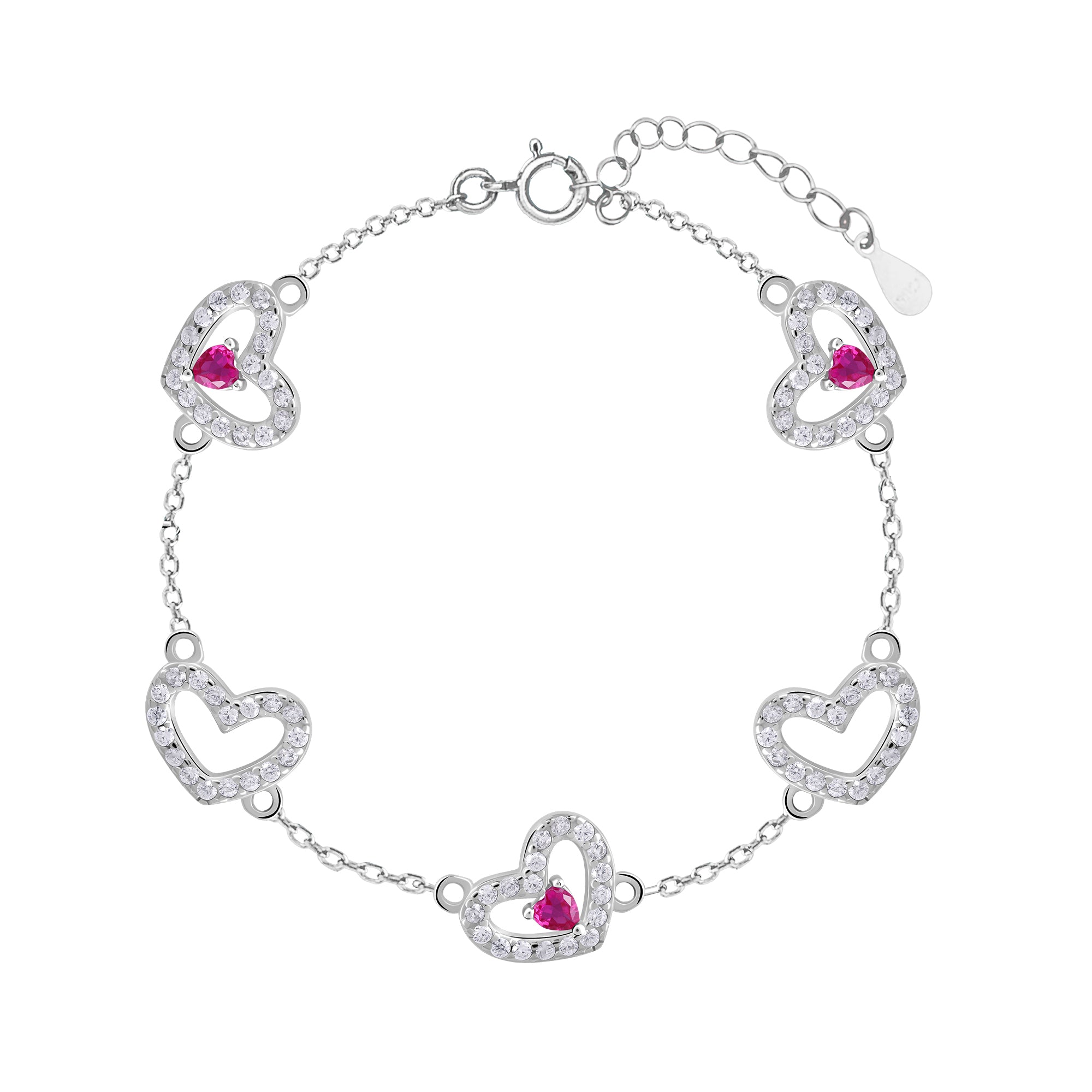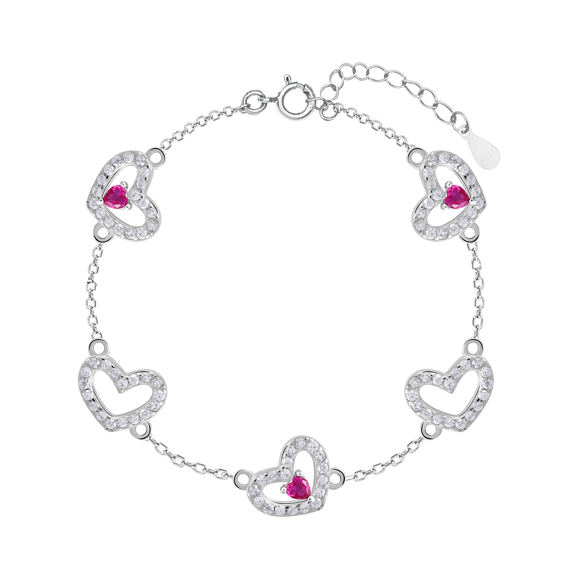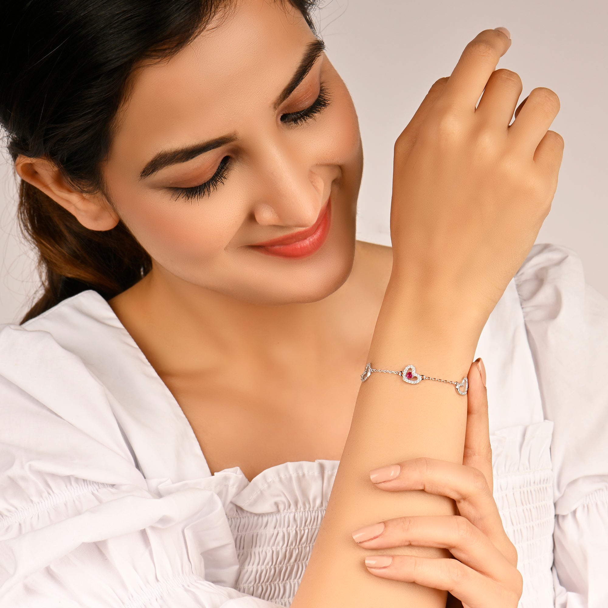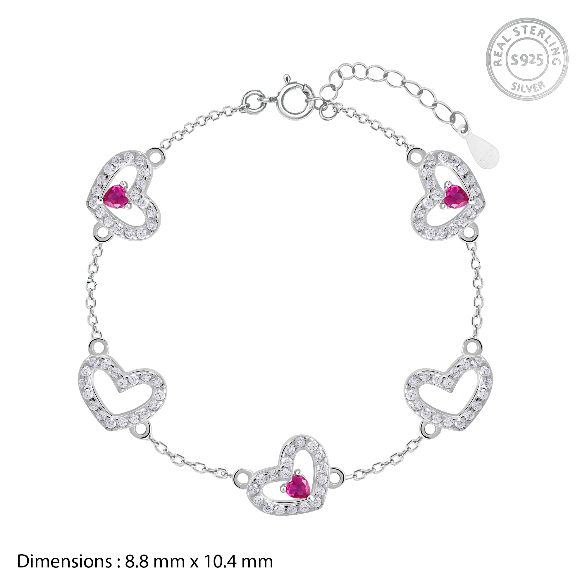 Embrace the joy of gifting as you present a timeless symbol of love and style. with Rachiva's 925 sterling silver Romantic Red Heart Silver Bracelet This masterpiece features five hearts, each adorned with meticulously placed Zircon stones that radiate sophistication. Within three of these hearts, a single pink Zircon stone adds a touch of romance and uniqueness. The flawless finish of this bracelet not only accentuates its premium quality but also ensures a lasting impression.
