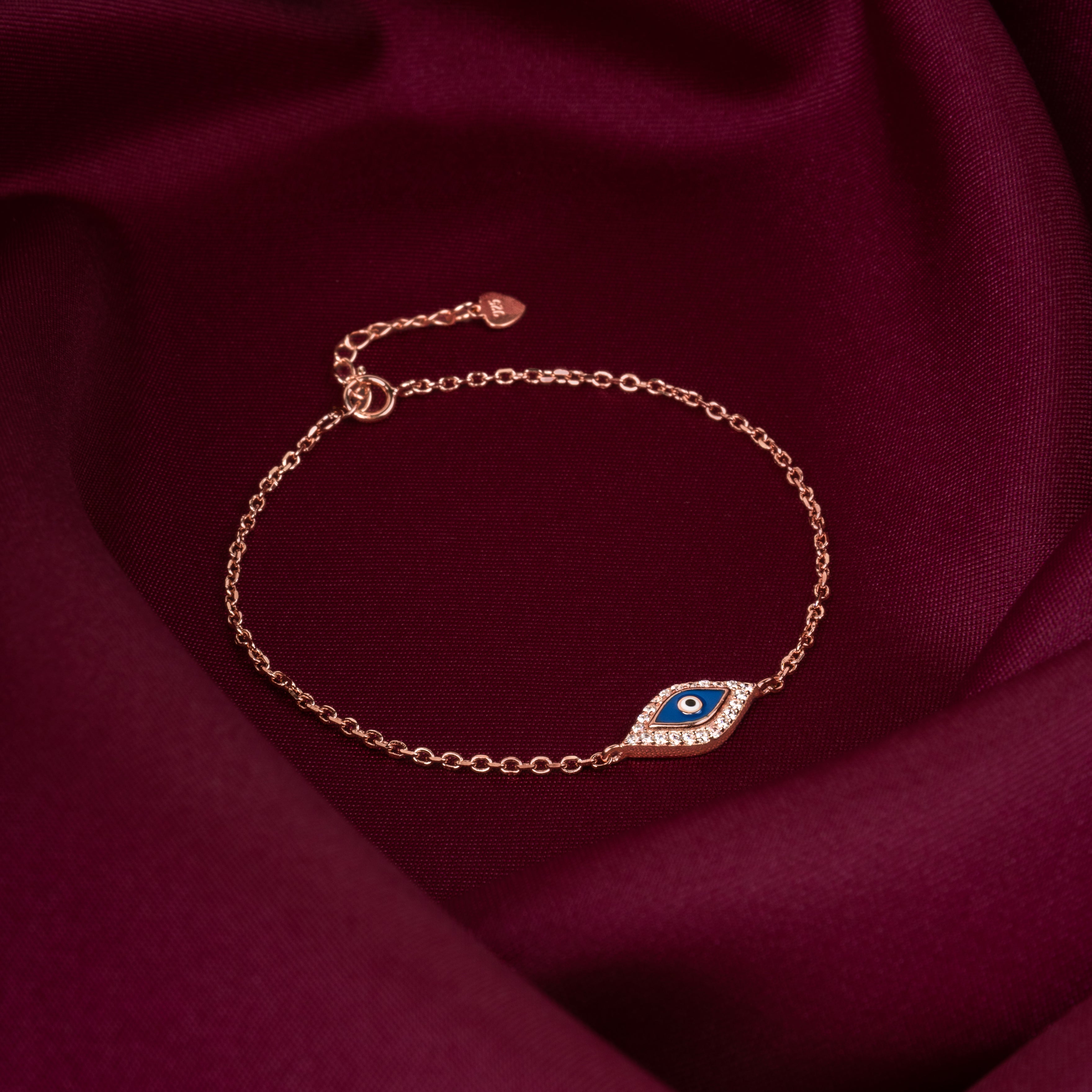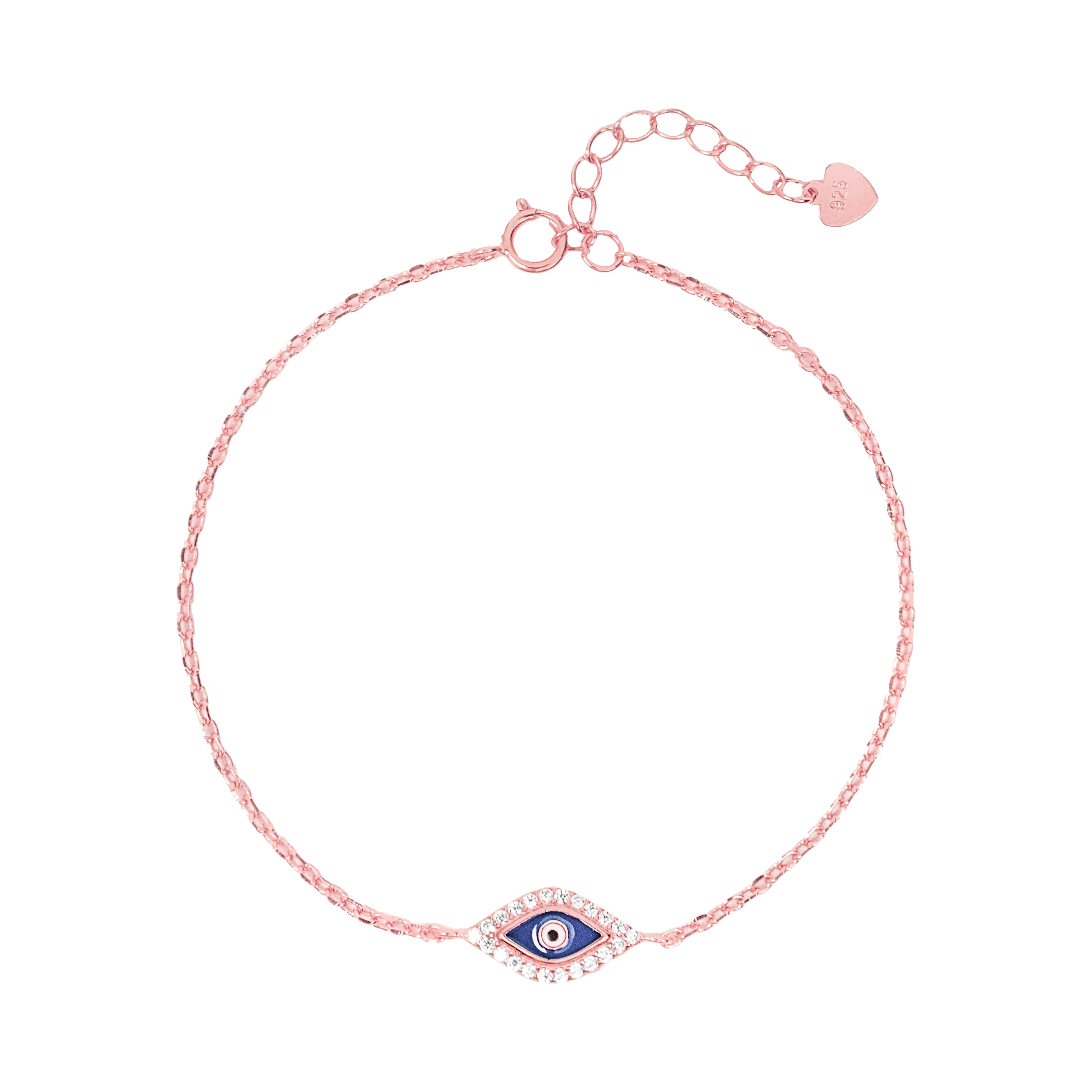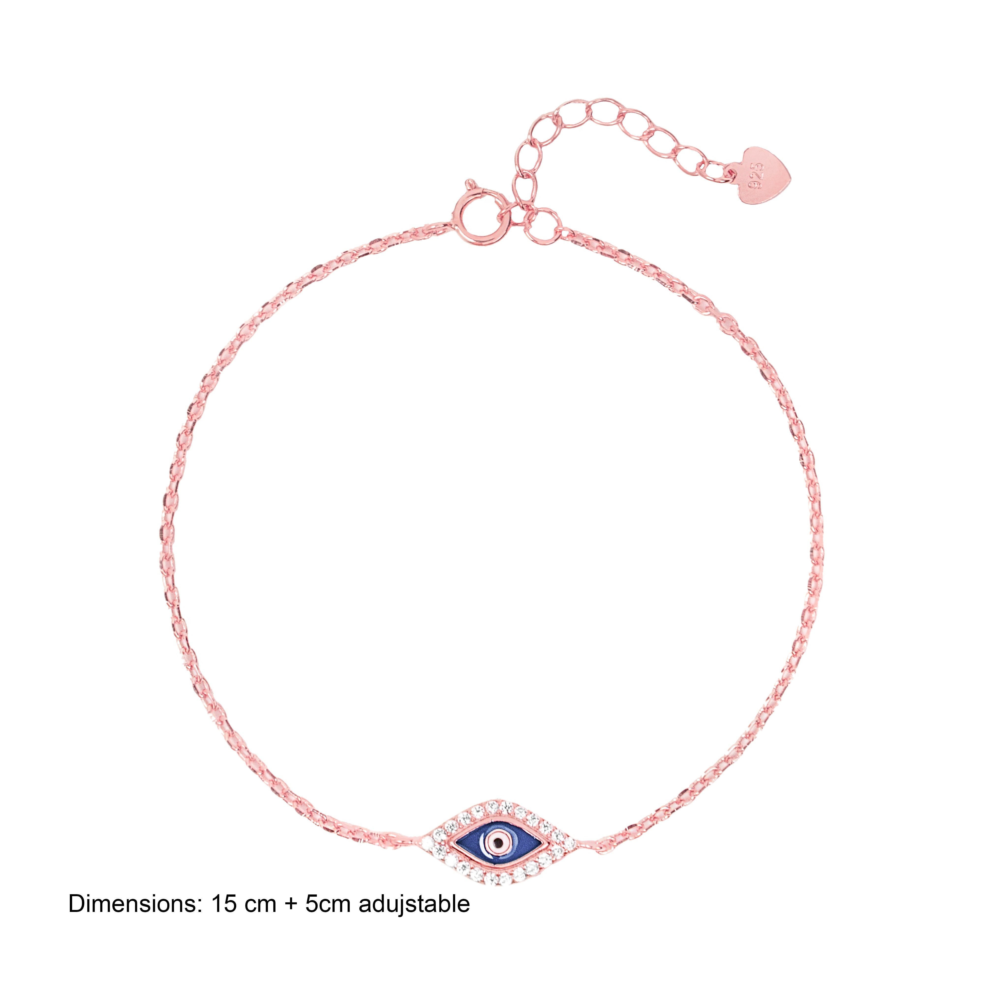 Adorn your wrist with the epitome of elegance and protection with our exquisite evil eye bracelet in luxurious rose gold. Crafted from 925 sterling silver and adorned with shimmering zircons, this bracelet is a true statement piece that will elevate any outfit to new heights of sophistication. Perfect for adding a touch of glamour to your everyday look or as a thoughtful gift for a loved one, this bracelet is a must-have accessory for those who appreciate the finer things in life.