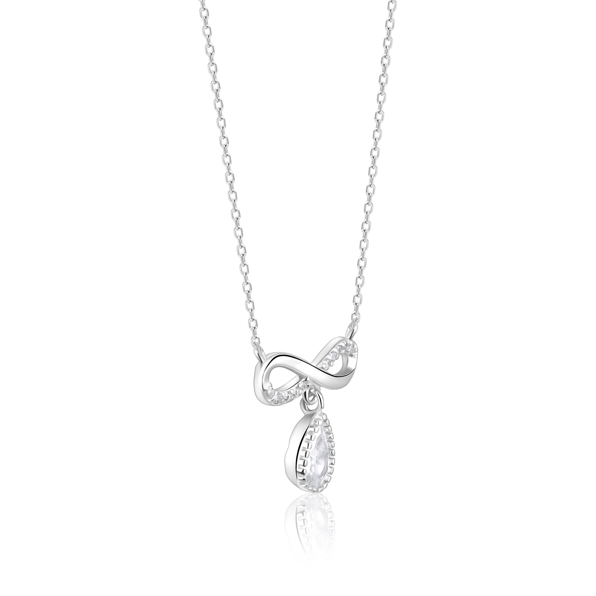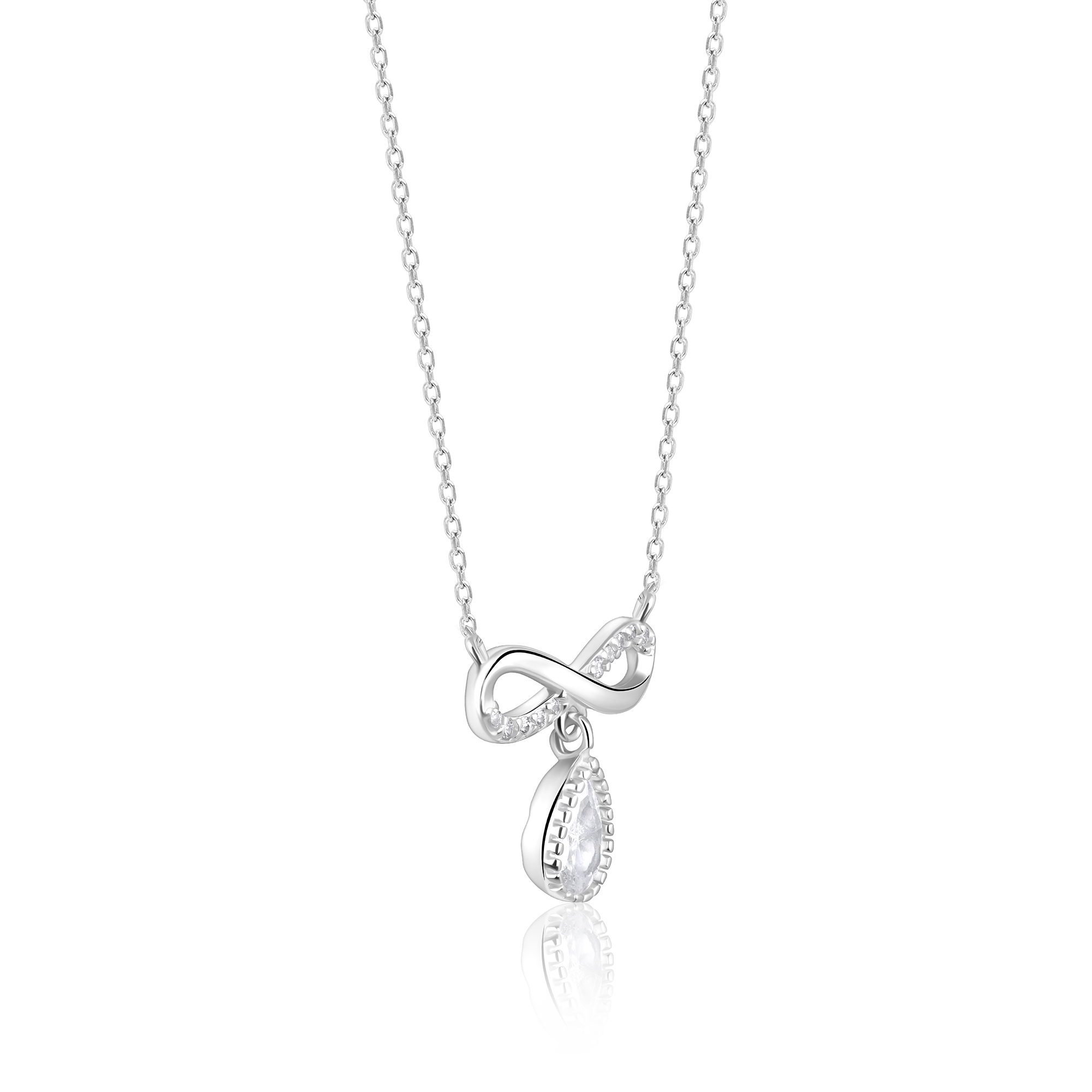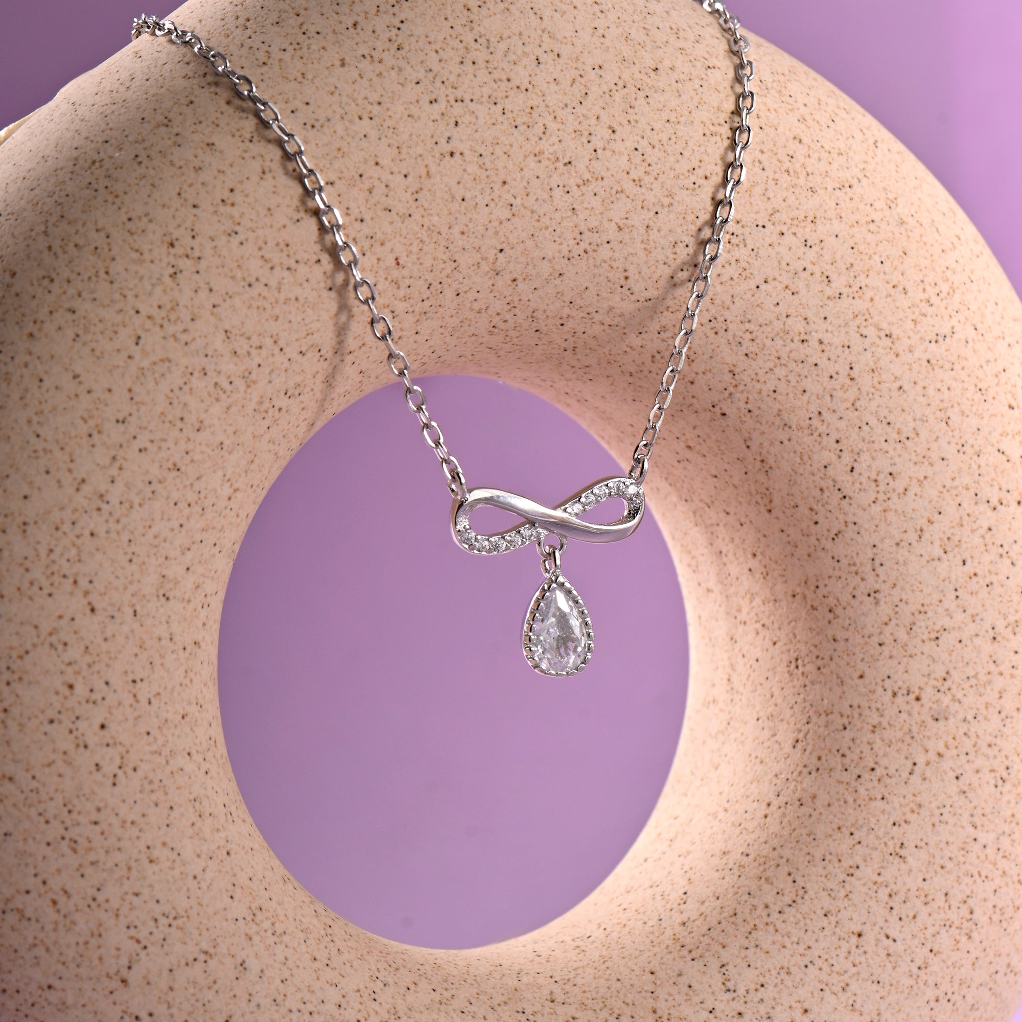 Unveil the allure of everlasting style with Rachiva's Silver Infinity Tear Drop Pendant with Link Chain. This 925 sterling silver chain pendant showcases an infinity symbol embellished with shimmering Zircon stones, radiating a subtle brilliance. Beneath, a gracefully suspended tear drop pendant captures attention with its single Zircon stone, adding a touch of opulence to this exquisite piece. Let it become the focal point of your ensemble, adding a touch of refined glamour to any outfit.