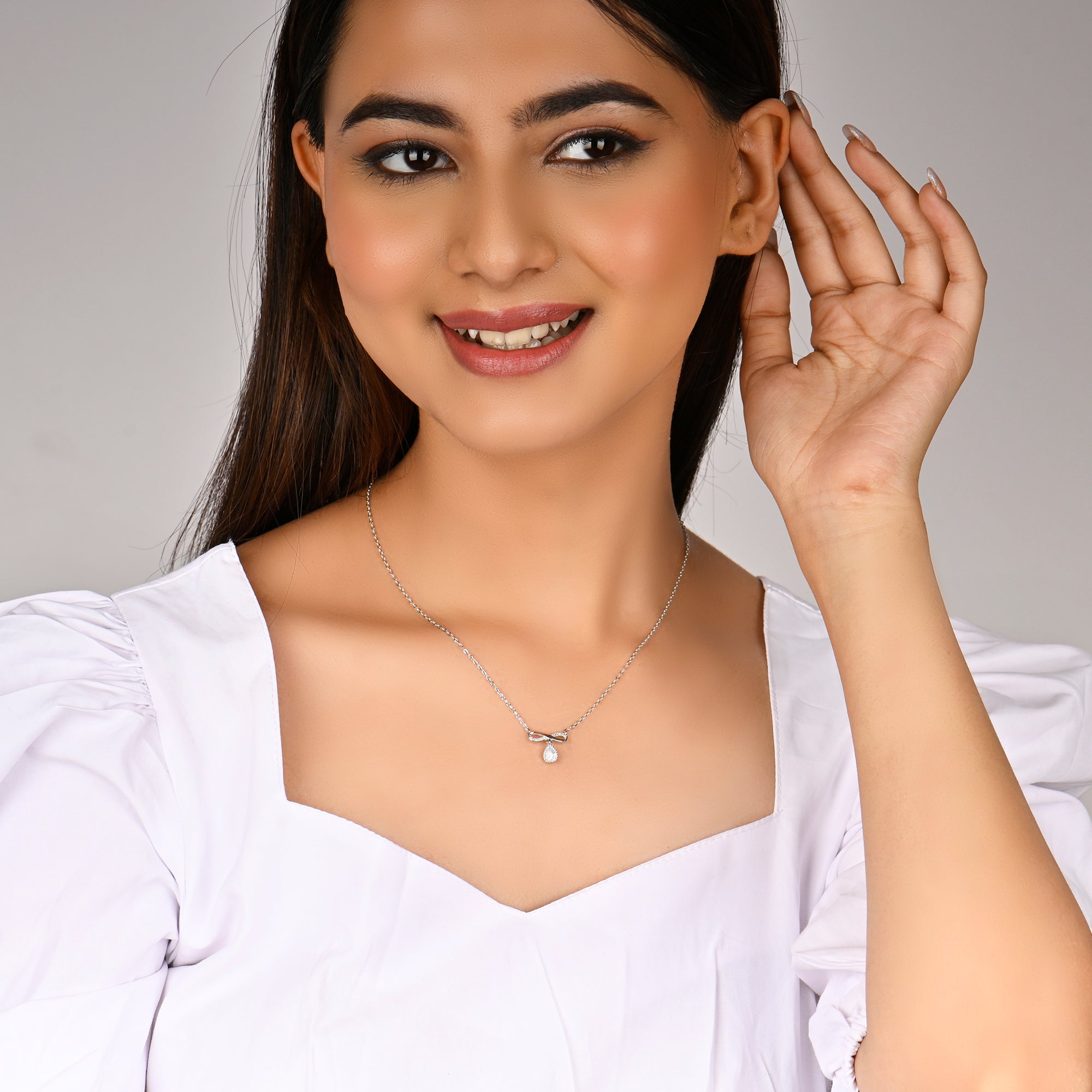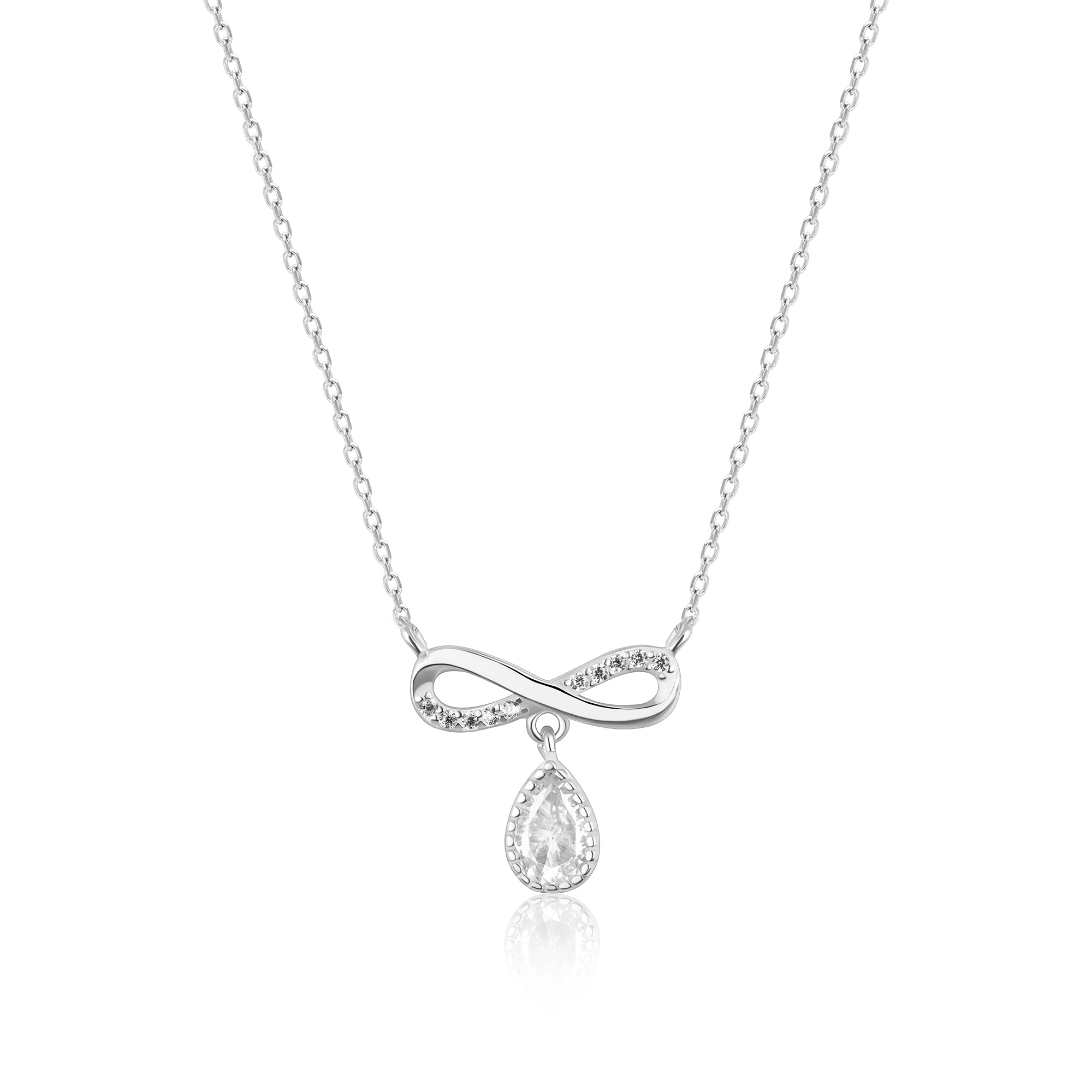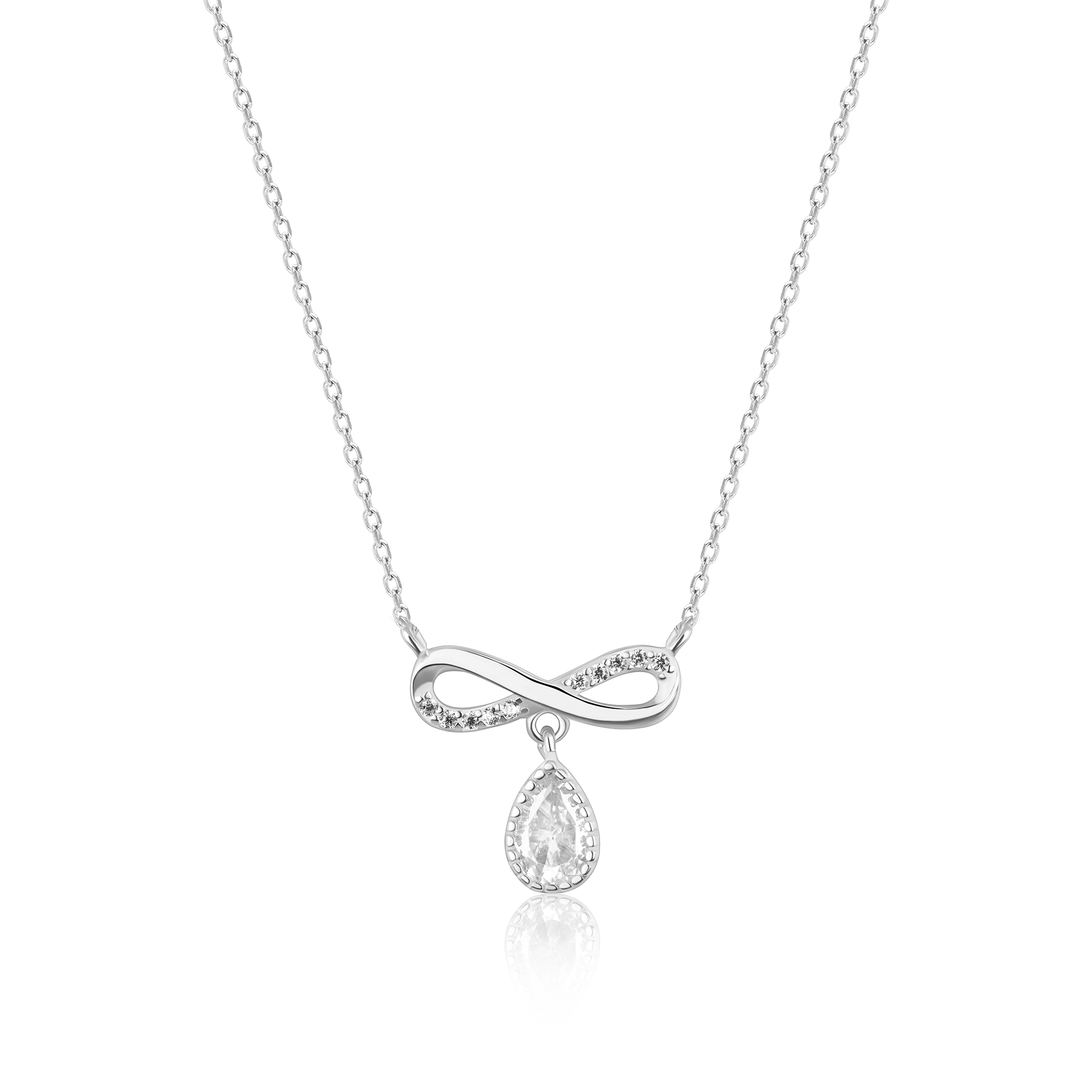 Unveil the allure of everlasting style with Rachiva's Silver Infinity Tear Drop Pendant with Link Chain. This 925 sterling silver chain pendant showcases an infinity symbol embellished with shimmering Zircon stones, radiating a subtle brilliance. Beneath, a gracefully suspended tear drop pendant captures attention with its single Zircon stone, adding a touch of opulence to this exquisite piece. Let it become the focal point of your ensemble, adding a touch of refined glamour to any outfit.