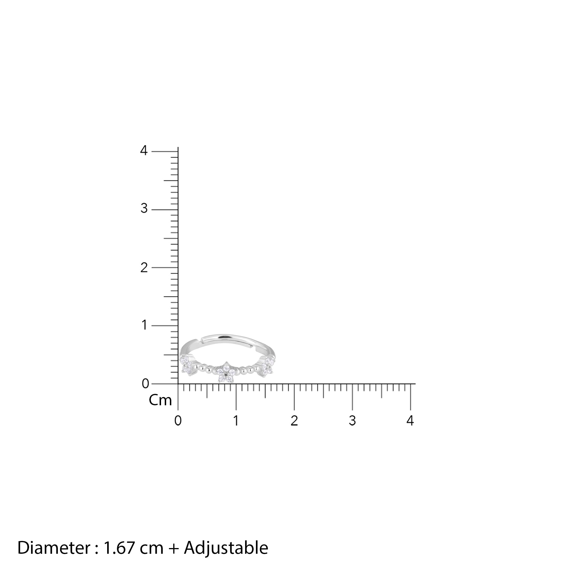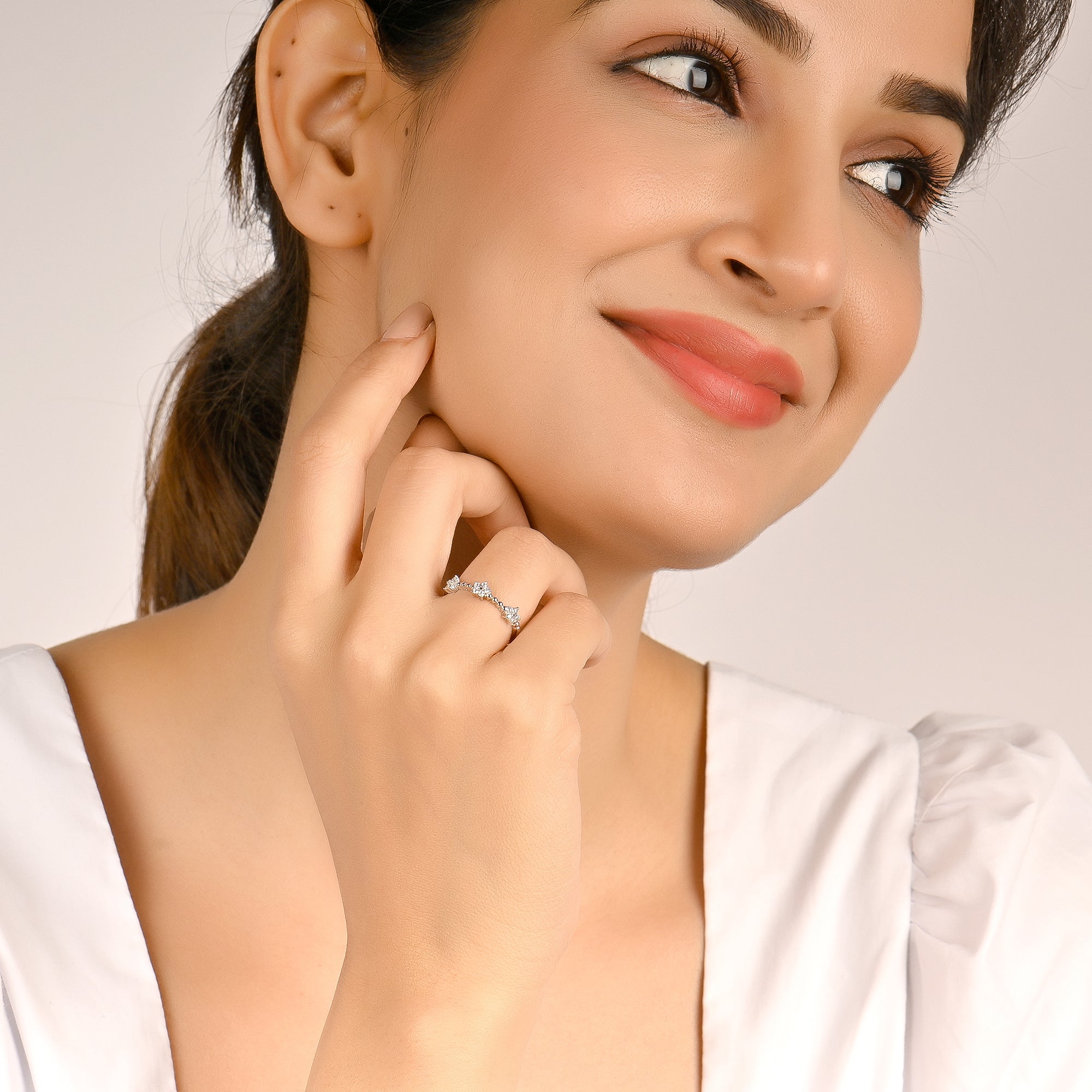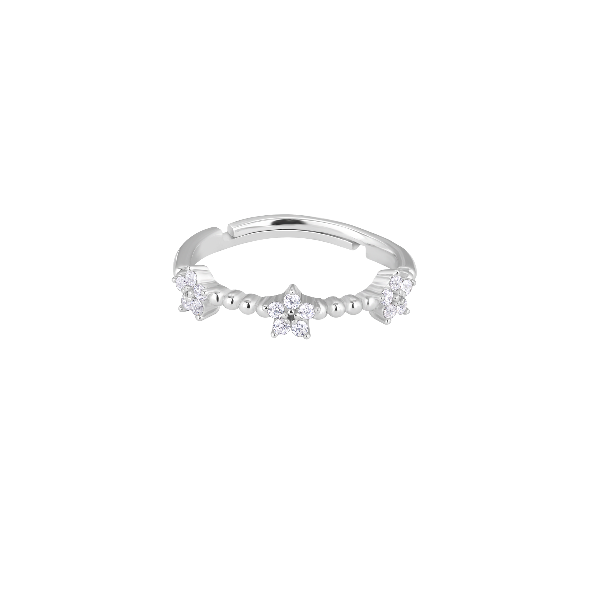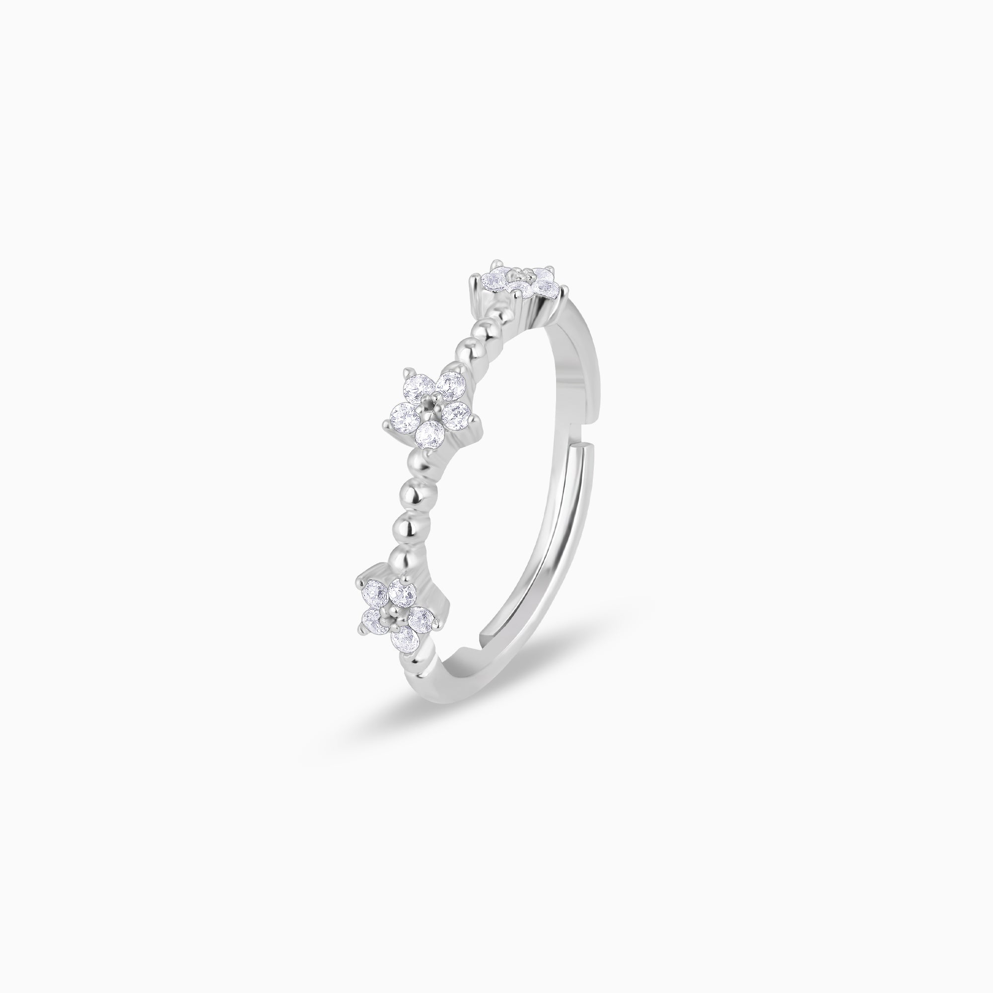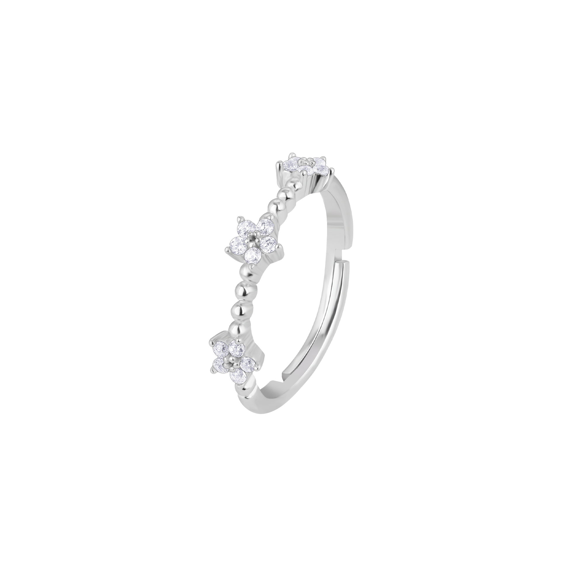 A ring where every detail tells a story of timeless sophistication - Rachiva's 925 sterling silver Symphony Of Flower Silver Ring. Three delicate flowers, each adorned with Zircon stones, are seamlessly connected in a line with mini Zircon gems, creating a minimal yet statement-making piece. Wear it solo for a touch of elegance or stack it with other favorites to create your own unique statement.