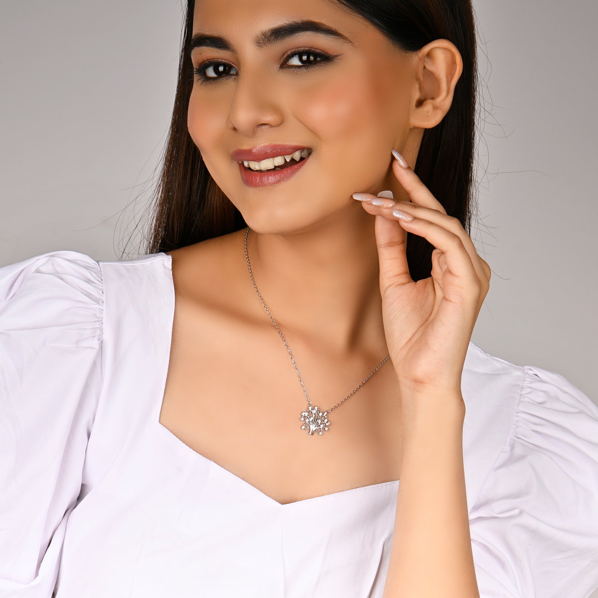 Elevate your jewellery collection with Rachiva's Tree of Wisdom Silver Pendant with Link Chain in silver radiance. Crafted from high-quality 925 sterling silver, the intricately designed tree branches are studded with glistening Zirconium stones, symbolizing the whispers of wisdom that nature imparts. Symbolizing strength and growth, the tree pendant embodies the enduring connection to one's roots and the continuous journey of personal evolution.