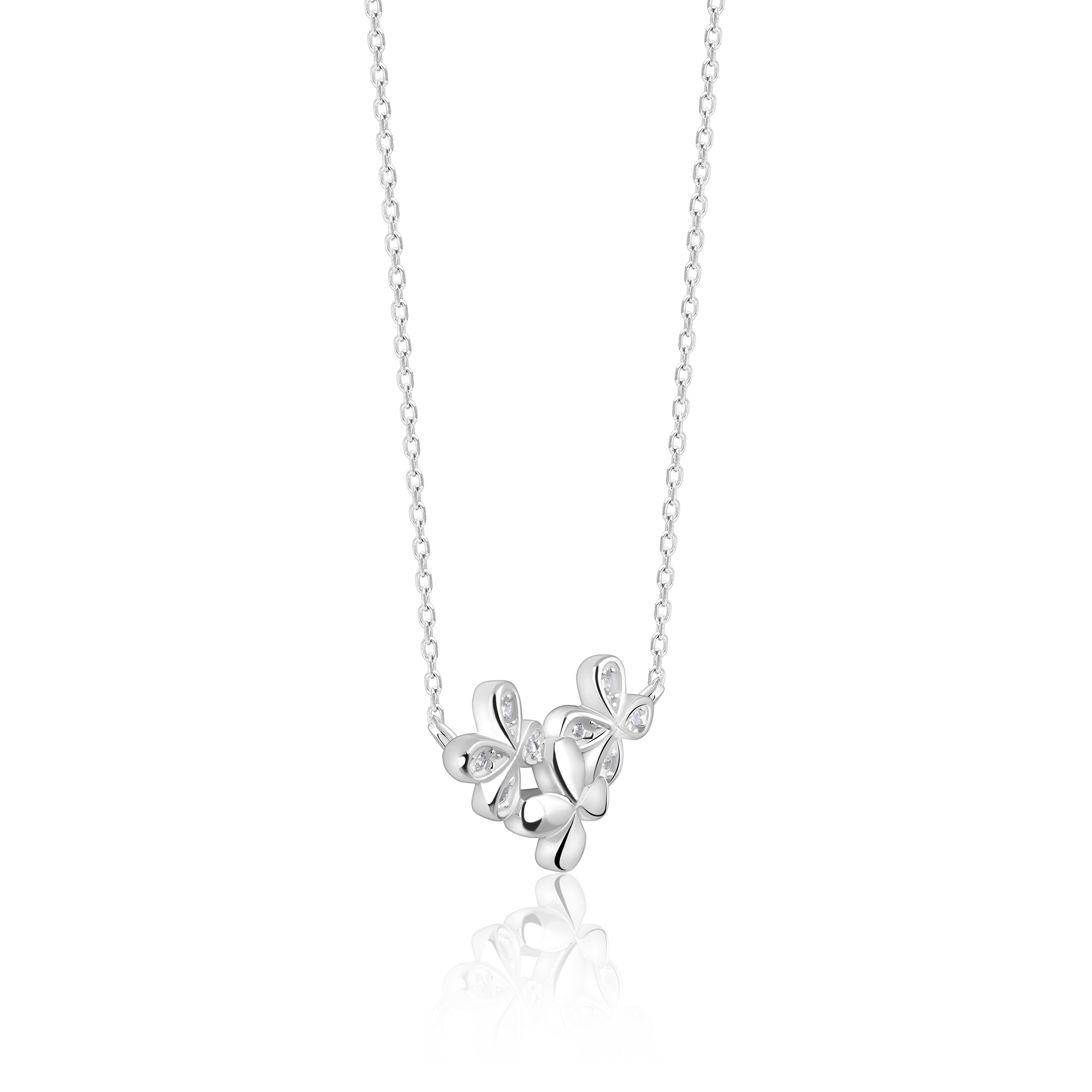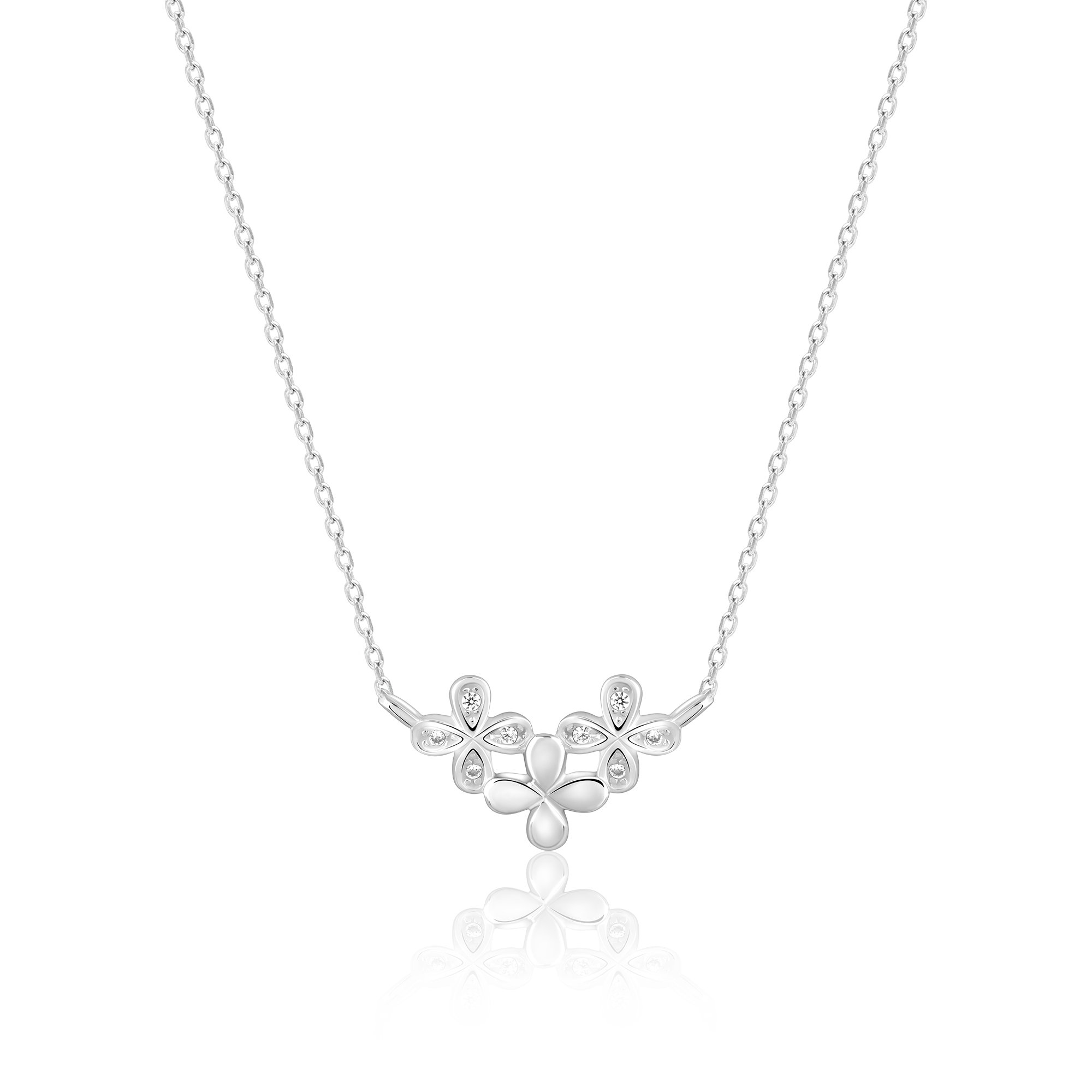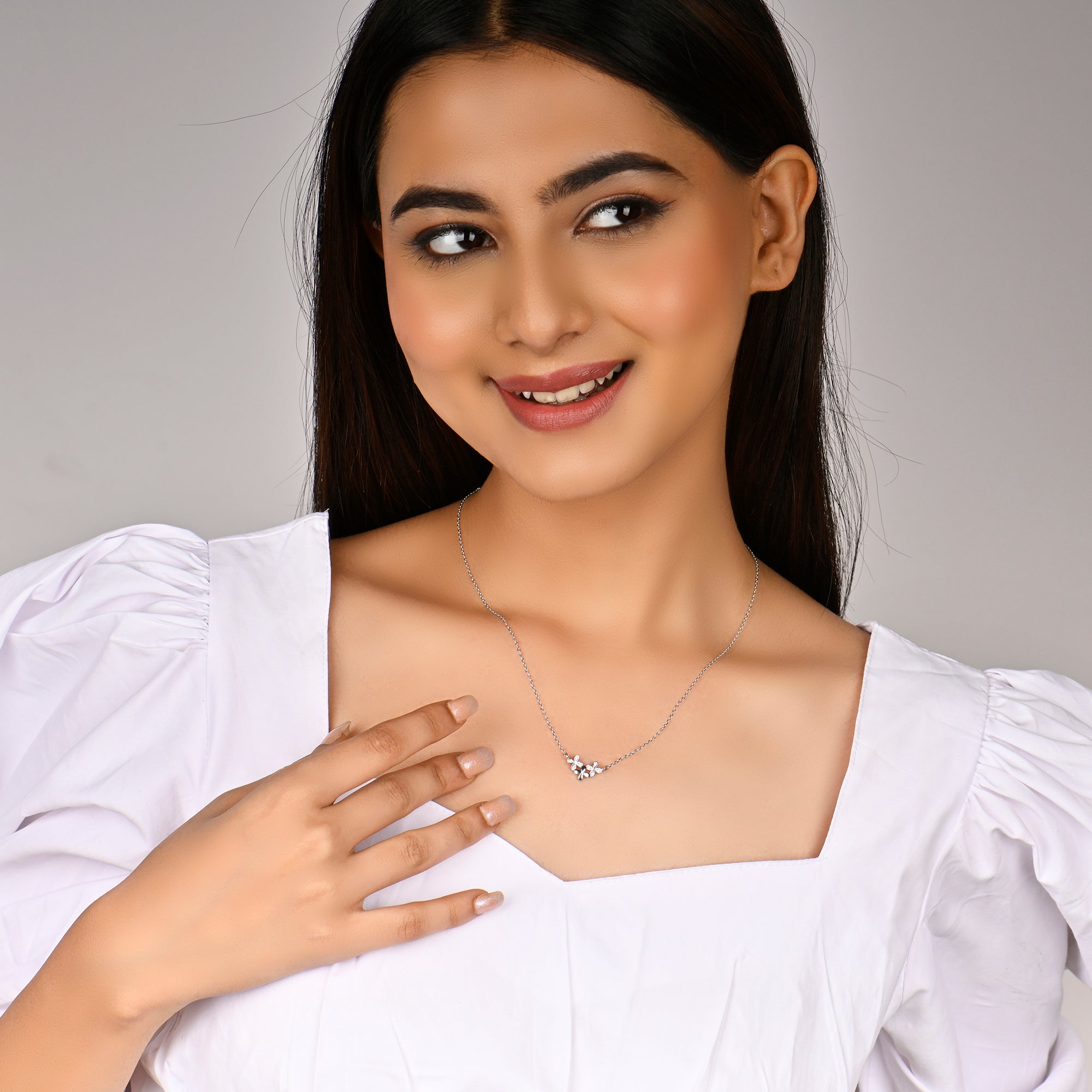Embrace the symbolic beauty of flowers, delicately arranged in triplicate with this 925 sterling silver Triple Flower Silver Zircon Pendant with Link Chain by Rachiva. The thoughtful placement of each flower charm creates a visually appealing and distinctive pattern, setting this chain pendant apart with its elegant and one-of-a-kind aesthetic. Adorned with sparkling Zircon stones, this pendant seamlessly blends elegance with versatility, making it the perfect accessory for weddings and parties.