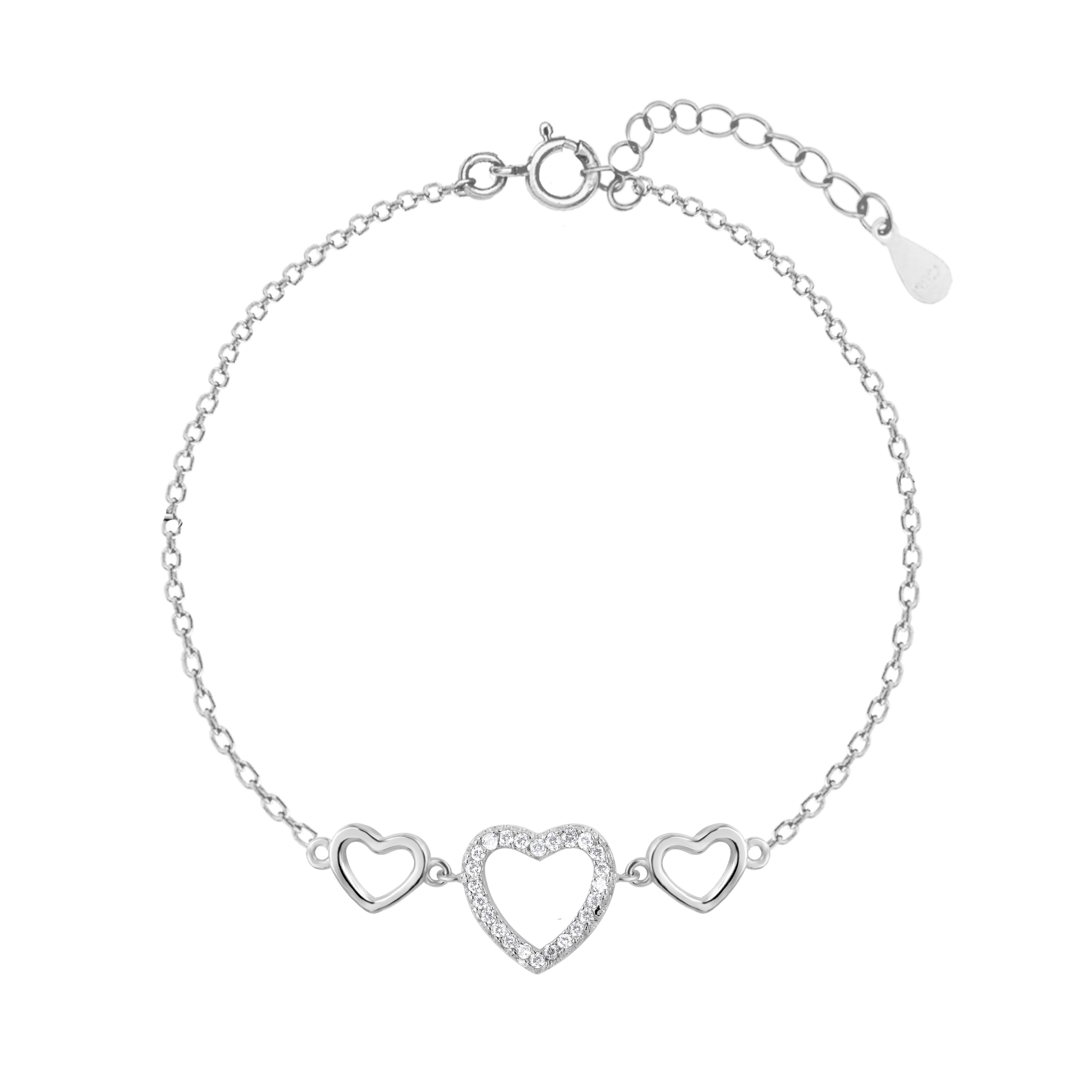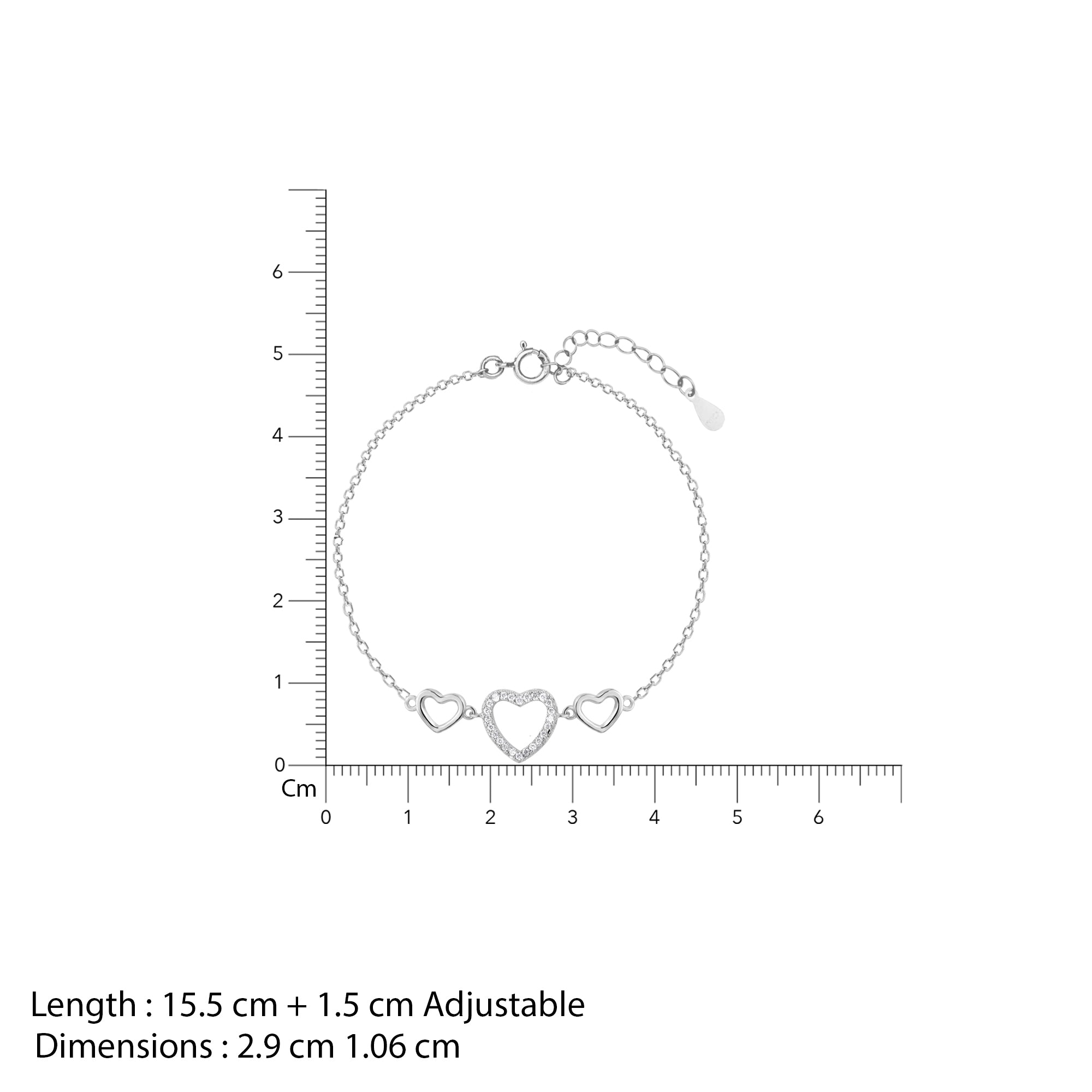 Crafted with precision and attention to detail, Rachiva's 925 sterling silver Triple Heart Connection Silver Bracelet features three hearts, each symbolizing a unique connection. The middle heart's outline is delicately studded with Zircon stones, adding a touch of sparkle and sophistication. Whether it's an anniversary, birthday, or just a special moment, express your love with this premium silver bracelet – the perfect gift to adorn the wrist of your loved ones.
