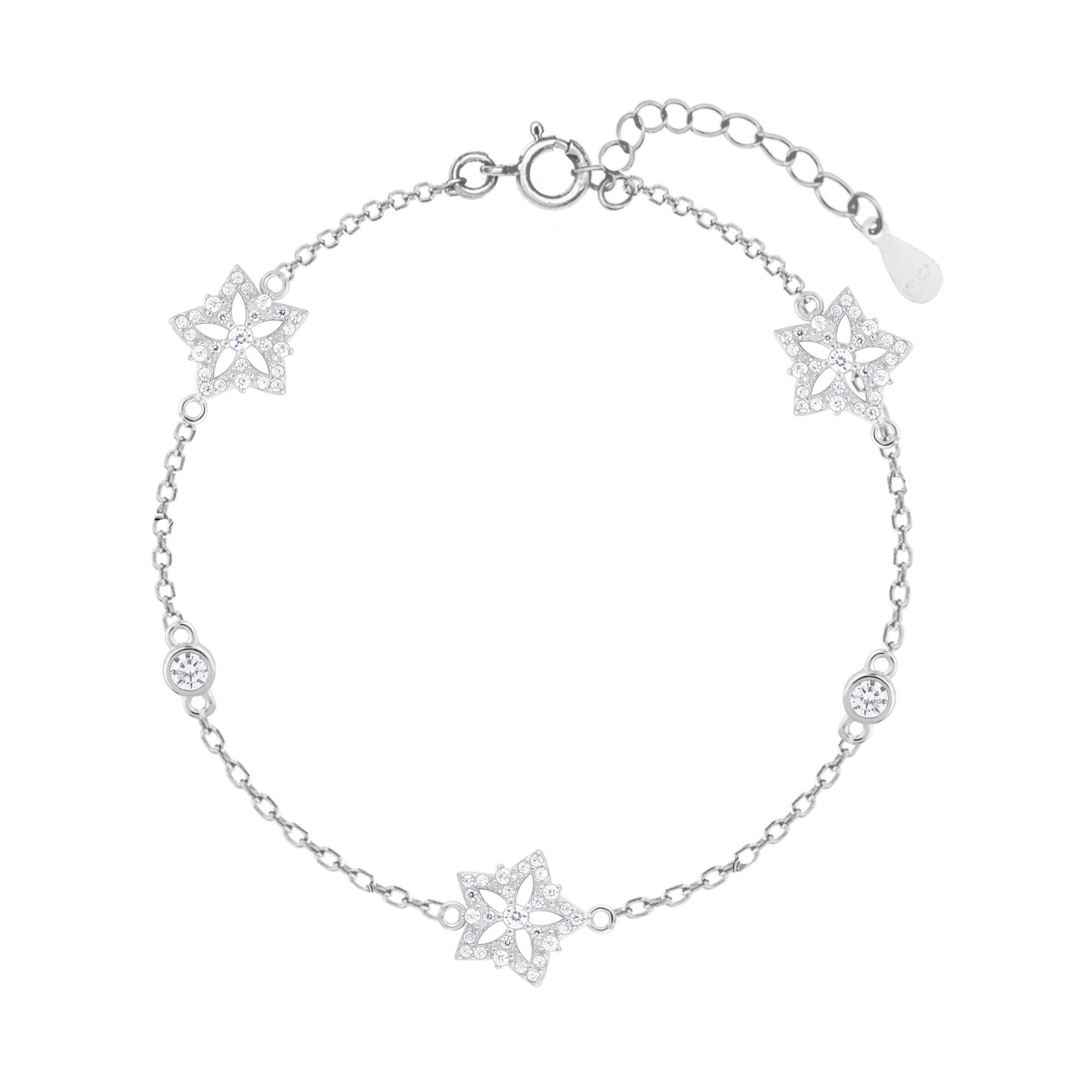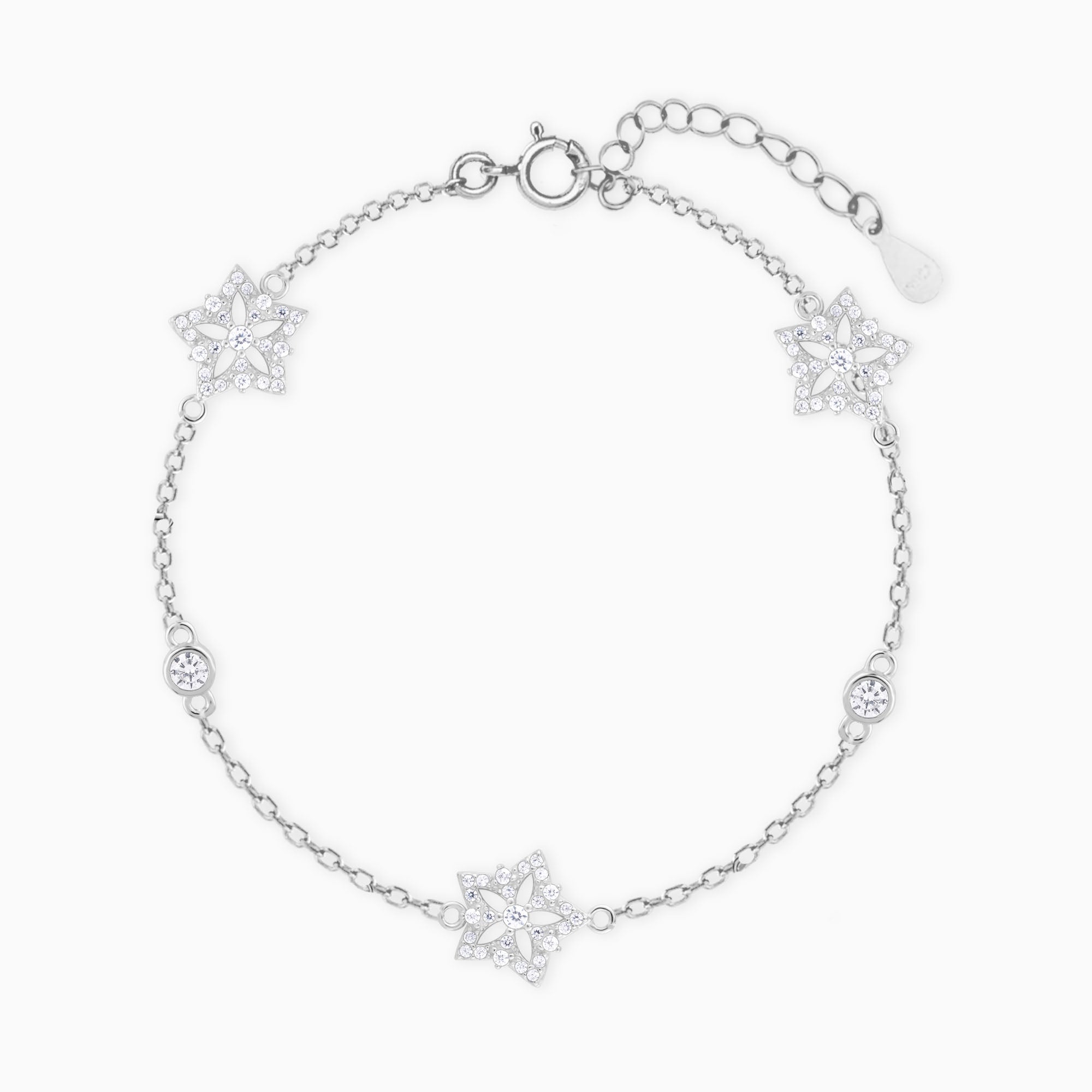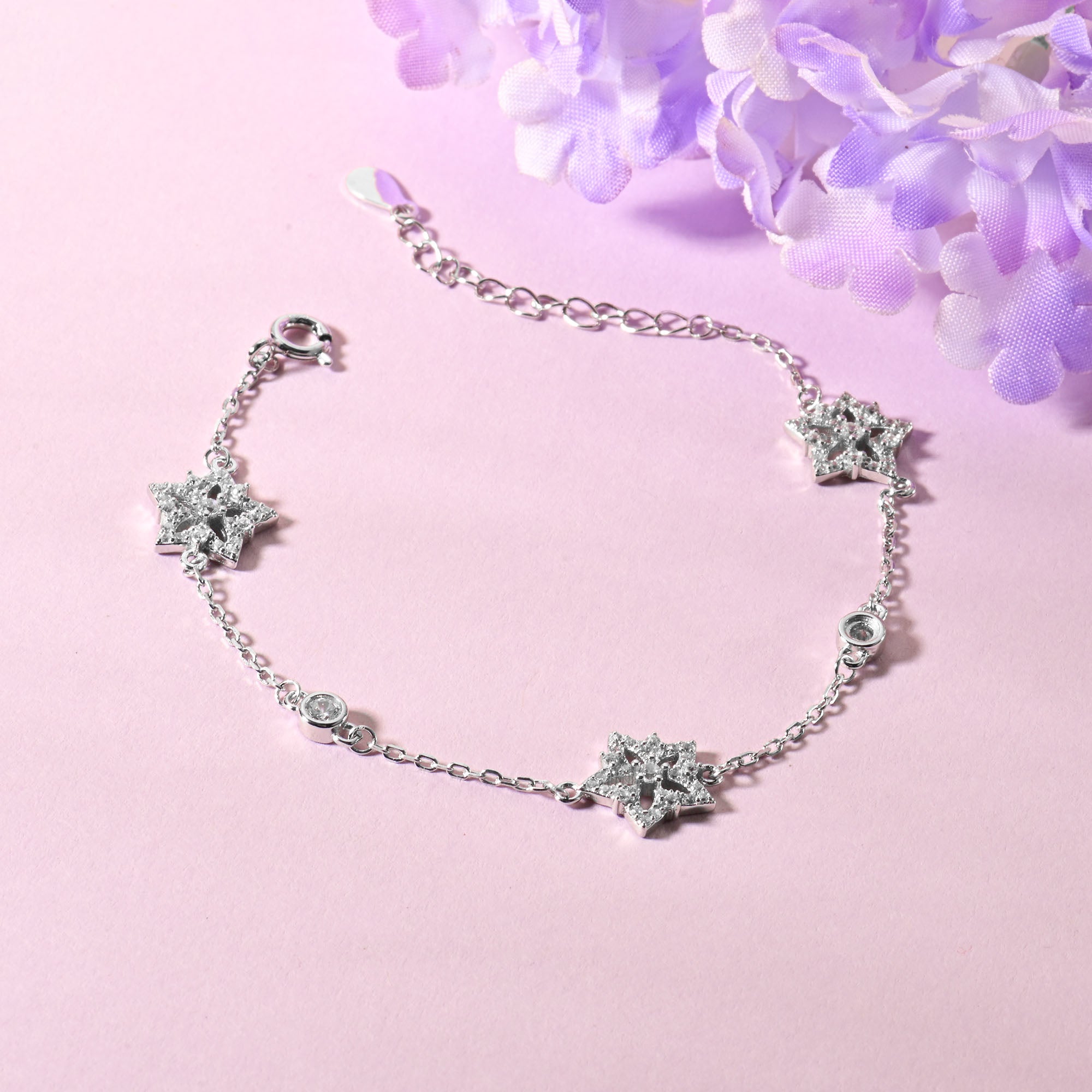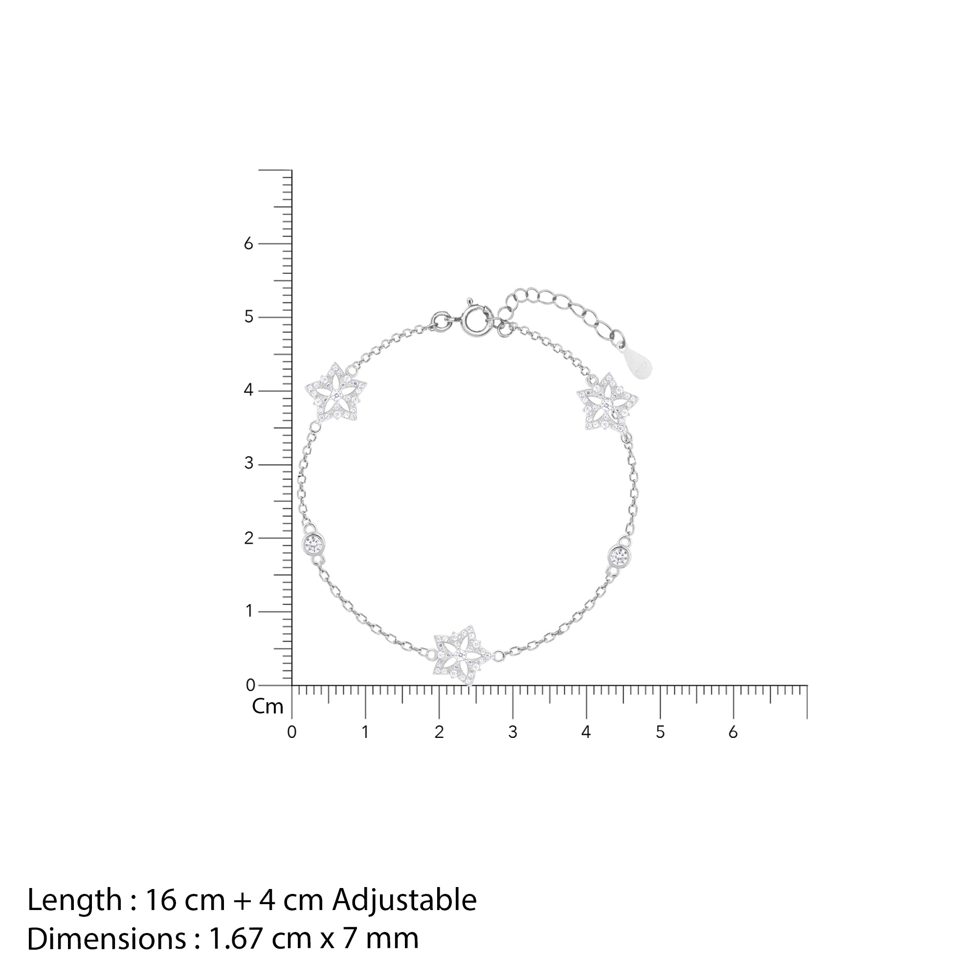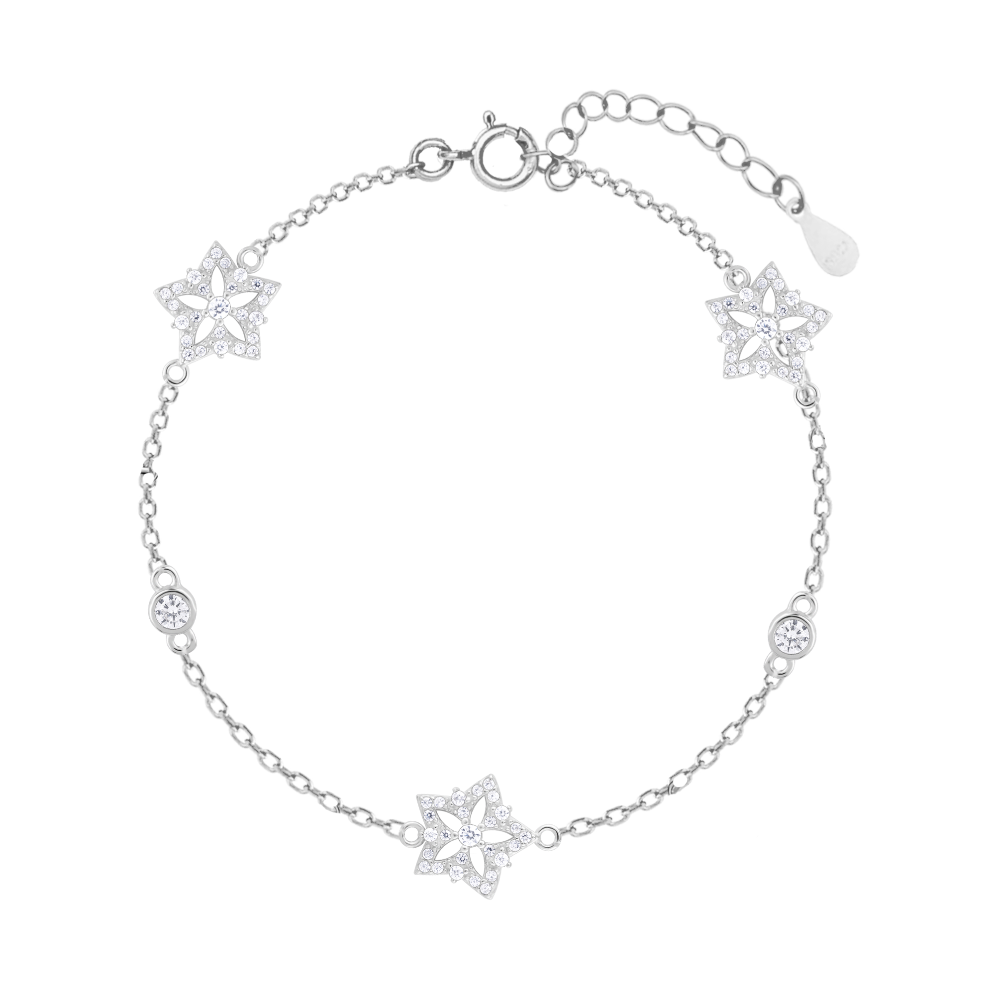 A beautiful staple in your jewellery collection - Rachiva's 925 sterling silver Triple Star Silver Floral Zircon Bracelet. Adorned with three stars, each embellished with sparkling Zircon stones, this bracelet is a symbol of enduring beauty. The three stars represent growth, transformation, and the beauty that unfolds over time. Embrace the symbolism as you wear this bracelet, capturing moments of everlasting grace. Whether paired with an evening gown or a casual ensemble, this dainty bracelet complements every occasion.