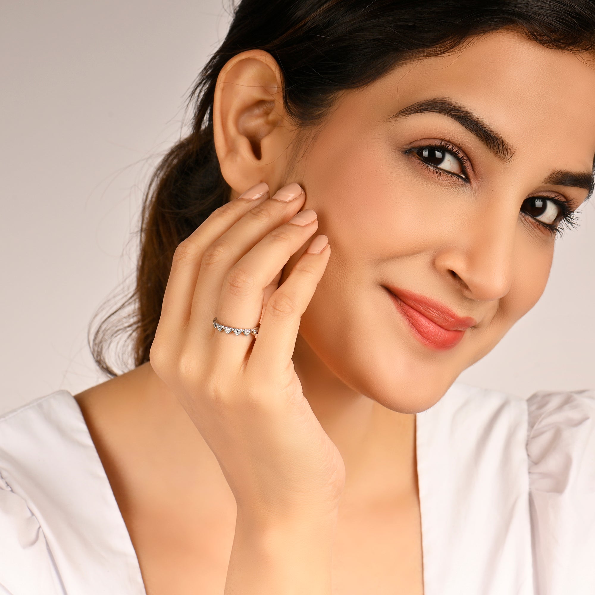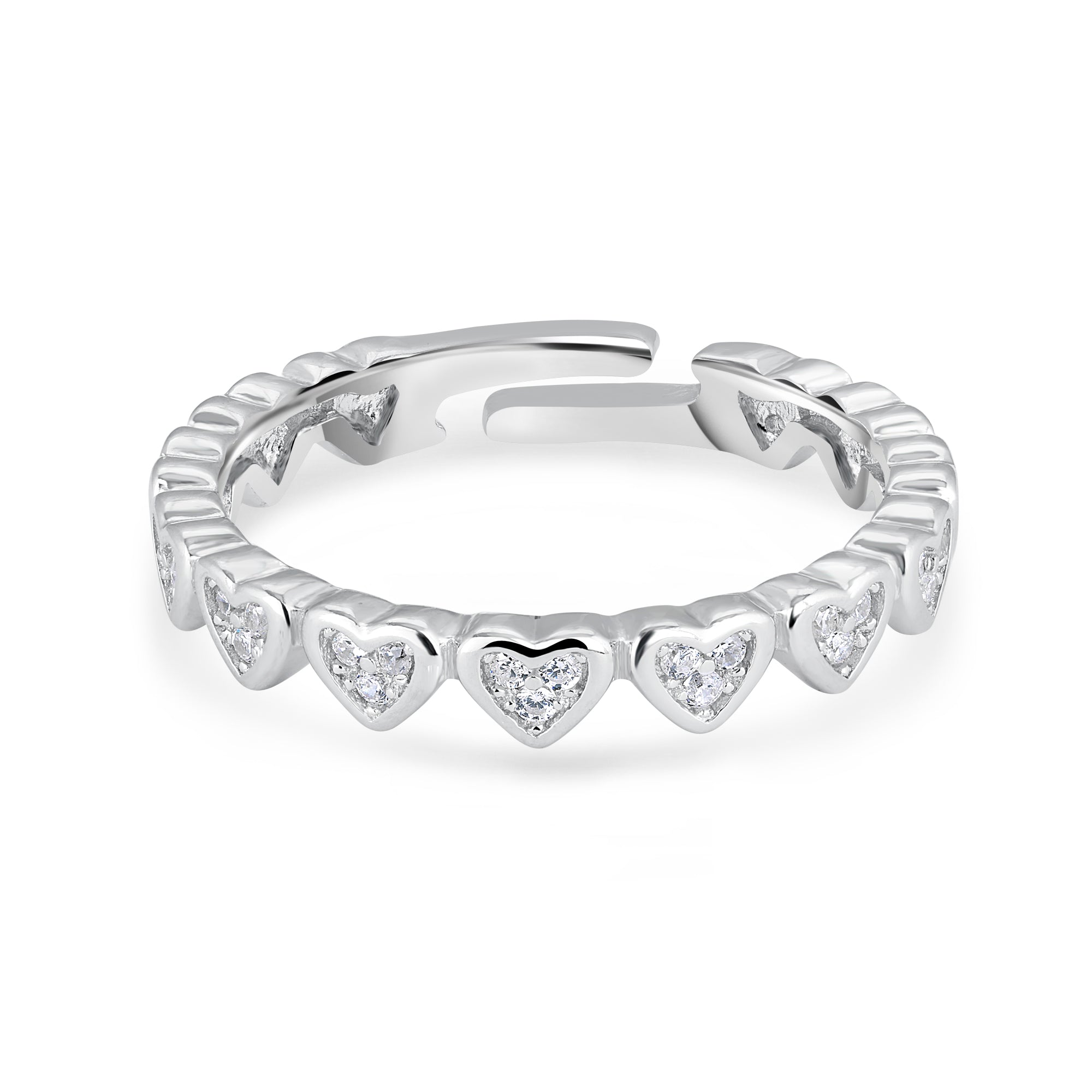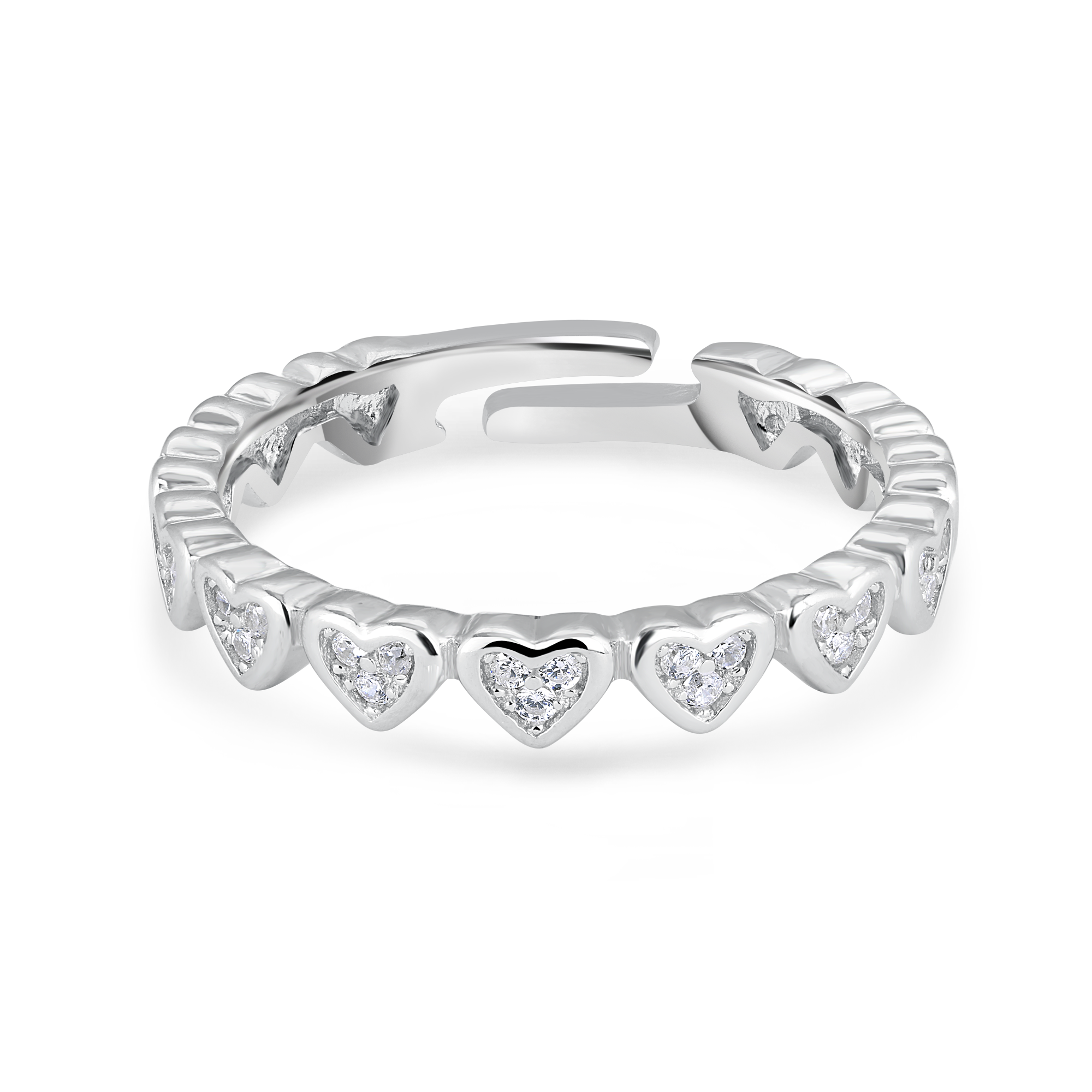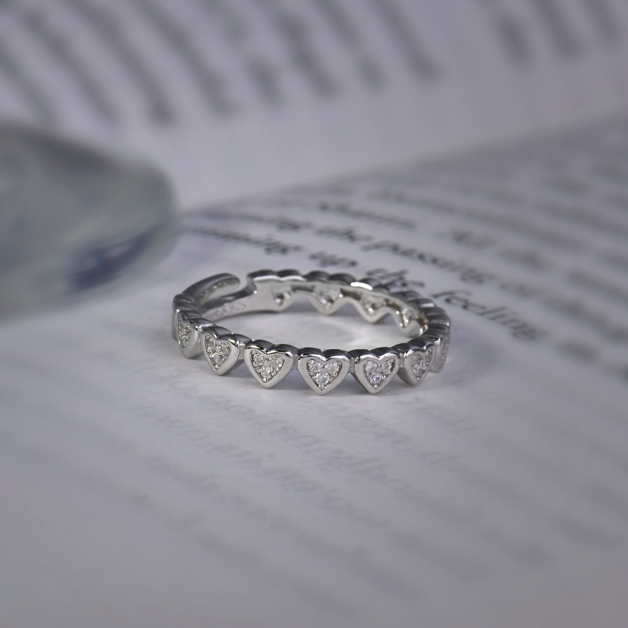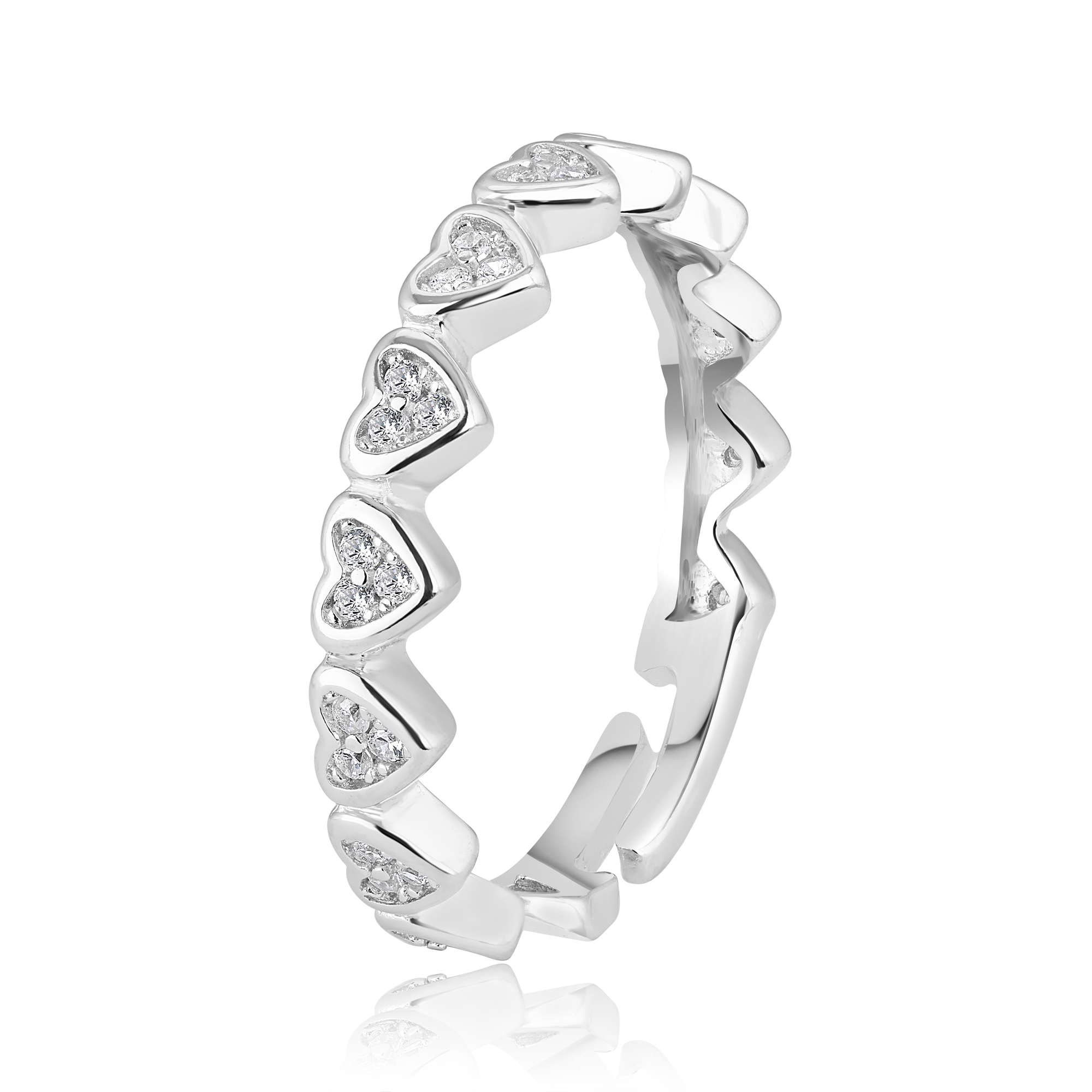 A ring that radiates love - Rachiva's 925 sterling silver Whisper of Love Silver Heart Ring. The band's surface is adorned with an array of gracefully designed hearts, each adorned with dazzling Zircon stones that catch the light with every movement. Whether worn alone or stacked, this ring effortlessly elevates your style, making a statement that is both subtle and sophisticated.